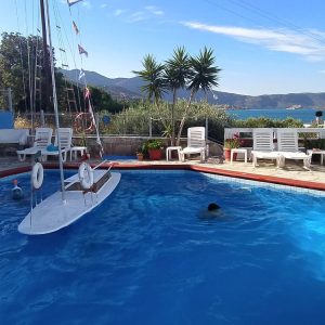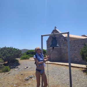 Tak więc podjechaliśmy autem na półwysep, wcześniej mijając na grobli stare wiatraki i stawy solankowe. Do zatoczki trzeba było zejść kilkaset metrów. Widoki przepiękne, kolor wody boski. Plaża, to dużo powiedziane. Na dole czekał na nas wąski pasek piasku i kamieni, oddzielony murkiem od sadu oliwnego. Kilka oliwek rosnących blisko murka rzucało cień, który każdy z plażowiczów skrzętnie wykorzystywał. Nam udało się wbić w miejsce pary, która właśnie opuszczała zatoczkę. Woda była fantastyczna. Później poszłam na koniec półwyspu, gdzie stał mały kościółek. Około 13 zrozumieliśmy przed czym ostrzegał nas George. Do zatoki wpłynęły 3 większe statki wycieczkowe. Przycumowały przy skalistym brzegu i na ląd zeszło kilkadziesiąt osób z każdego z nich. Jak mrówki zaczęli się kierować w naszą stronę. Pracownicy statków z kolei rozpalili na brzegu wielkie grille i zaczęli szykować dla nich lunch. Szybko się stamtąd zwinęliśmy, ciesząc się, że podróżujemy sami bez tłumu współtowarzyszy…