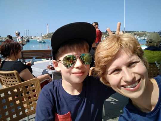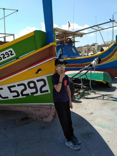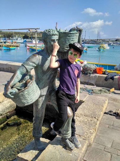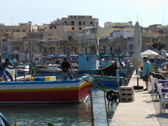 Marsaxlokk- wioska rybacka. Mnóstwo rybaków naprawiających sieci na swych kolorowych łódkach. Wzdłuż brzegu promenada, stragany z pamiątkami, słodyczami no i knajpy. Wybrałam jedną z nich i usiedliśmy. Jej szefowa, Sonia była w Polsce 20 lat temu. Zamówiliśmy ichnią colę, Kinnie. Janek się bardzo rozczarował. To jakby połączenie coli z tonikiem, dość gorzkie i słodkie. Yacoolowi smakuje bardzo, mi na 4. Jarek bezpiecznie wybrał lokalne piwo, ale też nie powaliło go. Złożyliśmy zamówienie, Janek wymarzoną pizzę, my kalmary i zestaw różnych owoców morza. No i czekaliśmy…Godzinę. Dla janka to była chyba najdłuższa godzina w życiu! Kto go zna ten wie o czym mówię… Do tego nie znają tu sosu czosnkowego, podają sos tatarski. Jedzenie bardzo dobre.