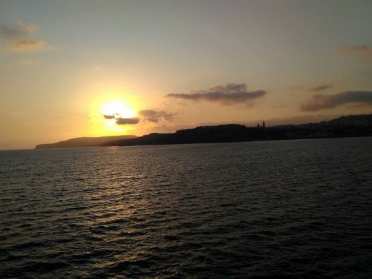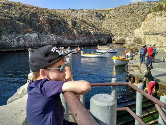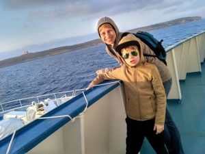 Blue Grotto– jaskinie wykute w skale przez wodę. Pierwotnie plan był taki, by popłynąć tam łódką. Ale chłopaki byli już zmęczeni, trochę wiało i odpuściliśmy. Dochodziła 16 i postanowiliśmy kierować się już na prom na Gozo, gdzie mamy wynajęte mieszkanie. Trochę pobłądziliśmy, przejechaliśmy pod wysokimi murami Mdiny, miasta ciszy – to atrakcja na osobny dzień. W końcu dotarliśmy do Cirkewwy. Prom właśnie odpłynął, ustawiliśmy się w kolejce do kolejnego. Nie czekaliśmy długo. Są tu trzy promy, które kursują na okrągło. Przeprawa trwała ok 20 minut. Po drodze mijaliśmy wysepkę Comino z Błękitną Laguną i Cominotto. Na Gozo są dużo lepsze drogi. Trafiliśmy na Lidla i ostatkiem sił zrobiliśmy zakupy na kolację. Jutro postaram się namierzyć lokalną piekarnię i stragan z owocami. Gdy wyszliśmy ze sklepu było już ciemno. Skierowaliśmy się prosto do domu. Po drodze ani żywej duszy. Niestety kawałek drogi dojazdowej był w remoncie i zamknięty. Na szczęście była dróżka na około. Ostatni podjazd z nachyleniem min 14 procent! Bałam się, że nasze autko nie podjedzie. Ale dało radę. Długo szukaliśmy naszego budynku. Mimo tablicy z nazwą i numerem byliśmy tak zmęczeni, że ich nie widzieliśmy. Do tego wszędzie cicho i głucho. W jakimś warsztacie przydomowym trafiłam na dwóch panów, którzy z życzliwością wskazali mi nasz dom, oddalony o 50 metrów od miejsca, gdzie staliśmy.