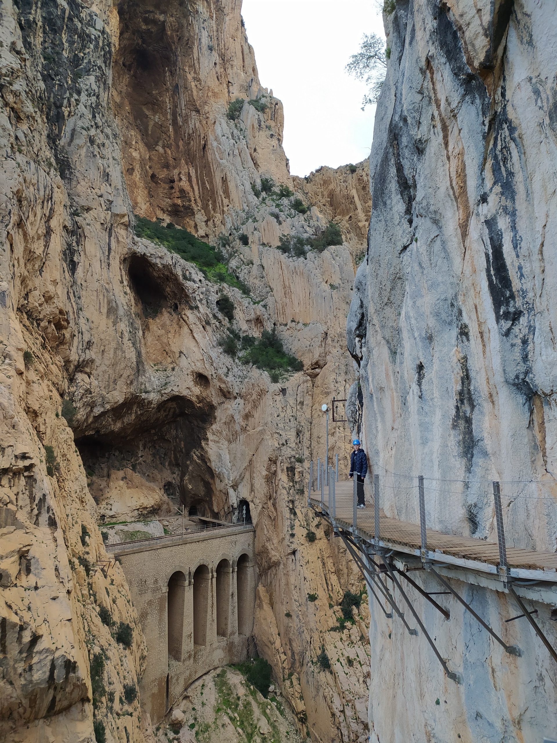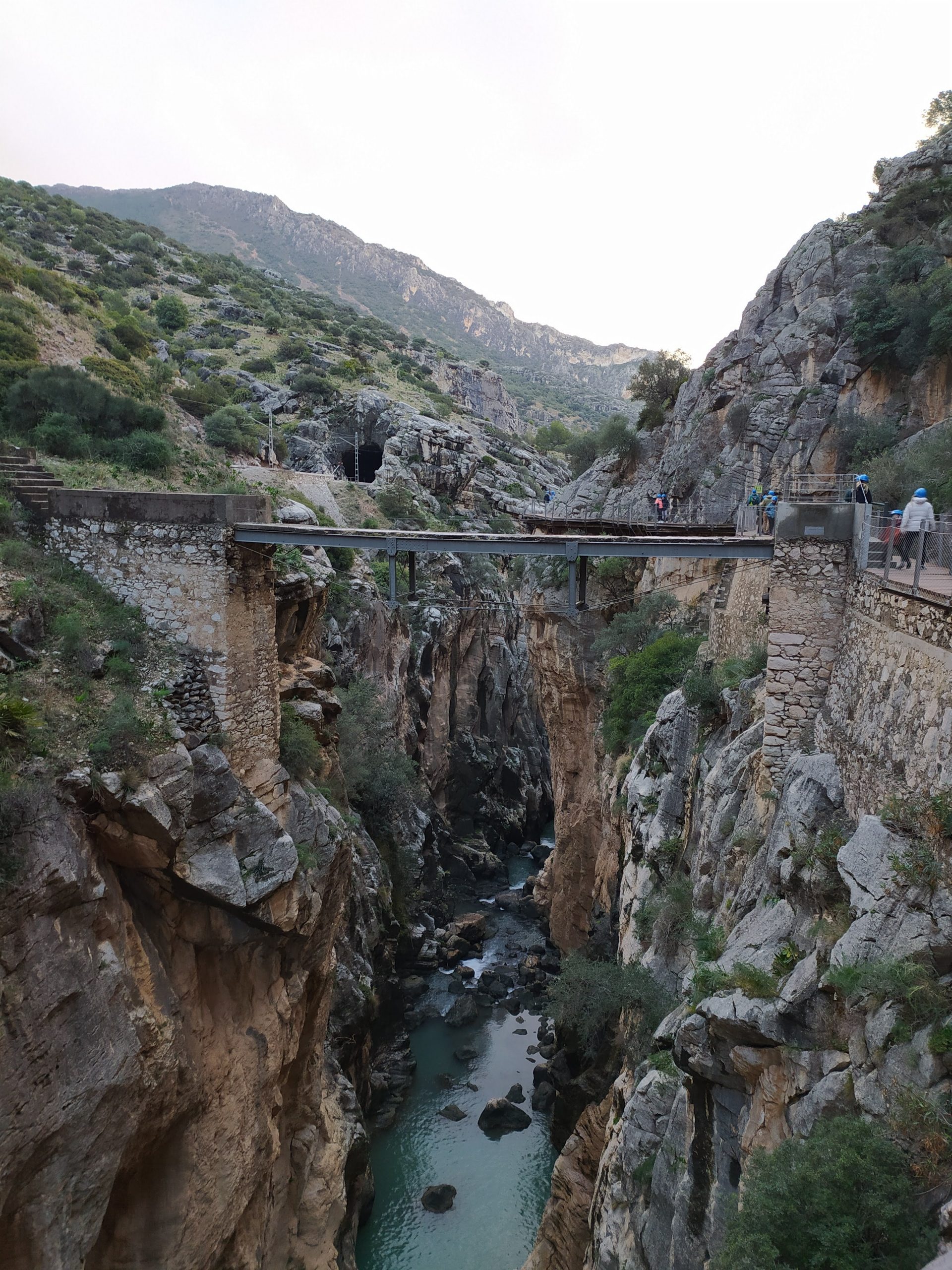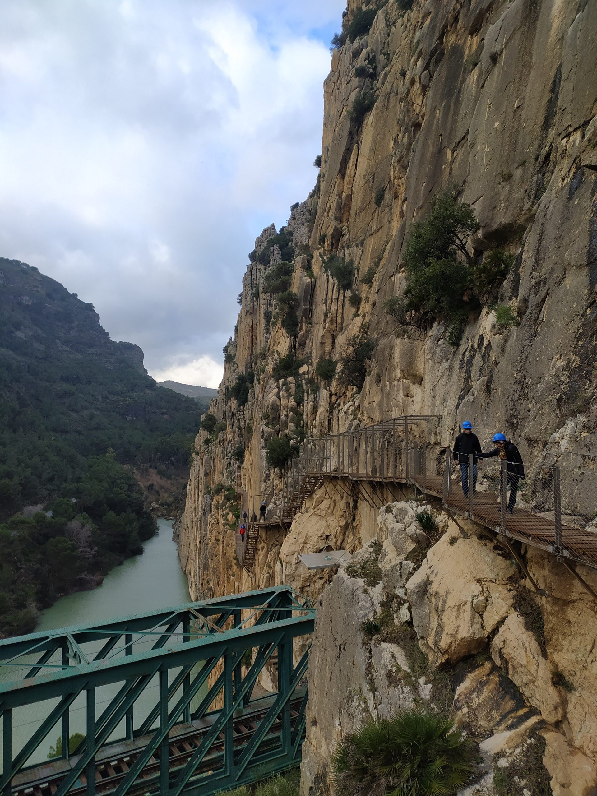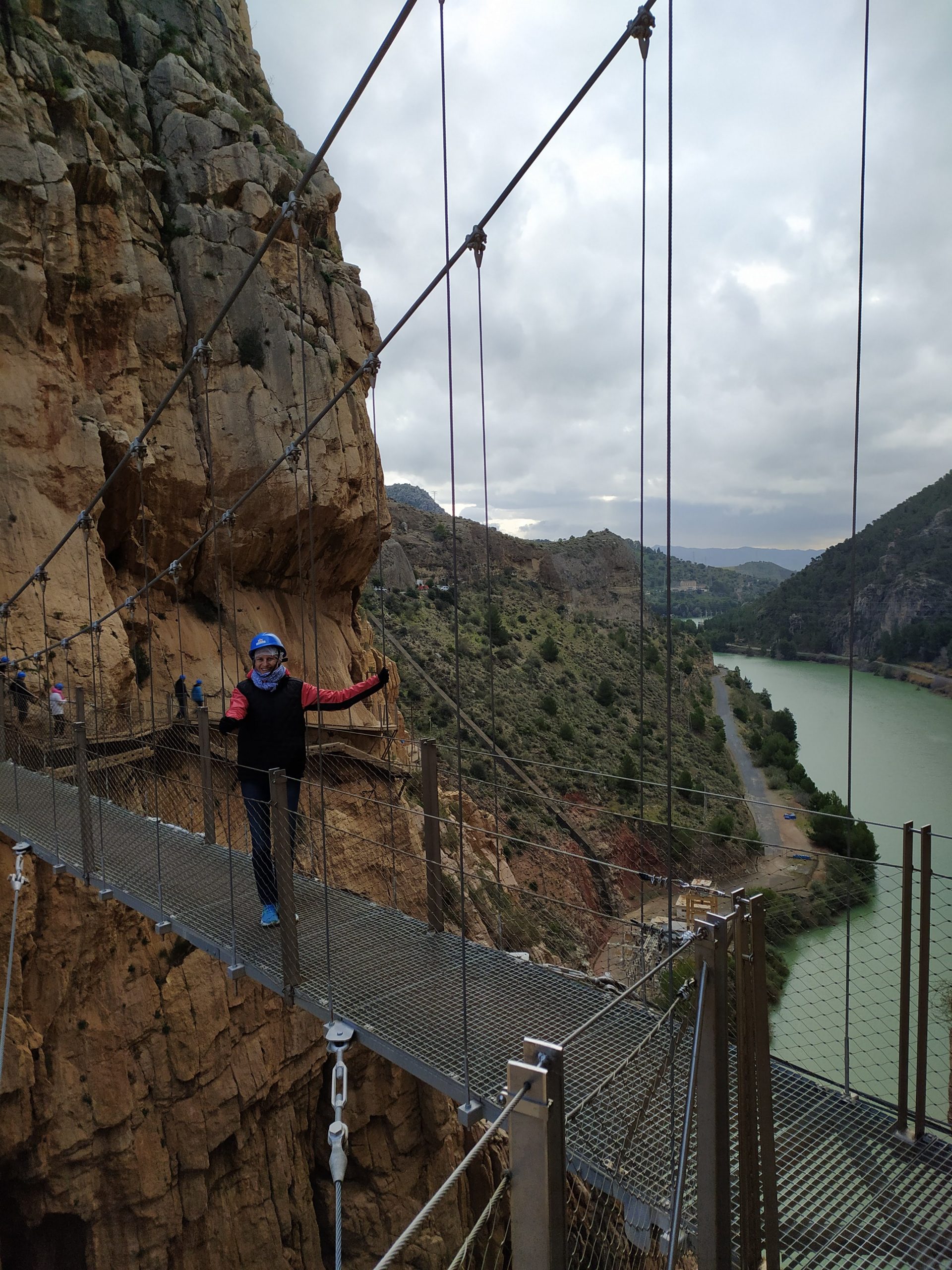 Trasa jest bardzo malownicza, idzie się po zrobionych w skale półkach. Strzeliste ściany kanionu, a nad nimi krążące orły i coś na podobieństwo sępów. W dole płynie rzeka, miejscami tworzy wodospady. Kanion trochę przypominał mi Wadi Mujib w Jordanii, tylko, że tam szliśmy jego dnem. Po drugiej stronie kanionu, w skałach wykute tunele i poprowadzone tory kolejowe, na trasie Malaga – Kordoba. Na koniec przejście po chwiejącym się, metalowym moście. Fantastyczny spacer i piękne widoki. Na końcu trasy, w miasteczku El Chorro był przystanek, skąd autobus zabrał nas na parking przy wejściu na szlak. Bardzo sprawnie jest to rozwiązane.