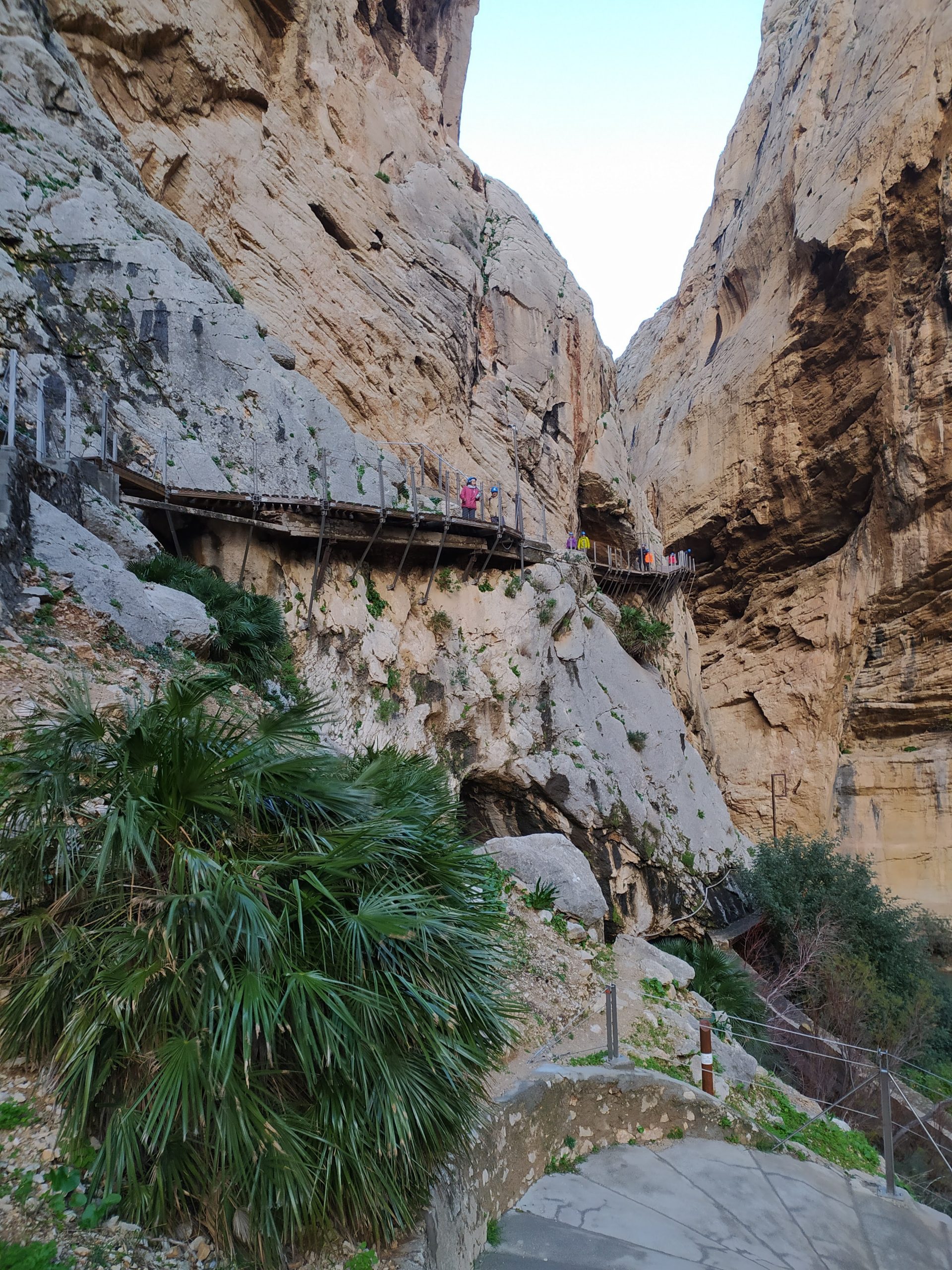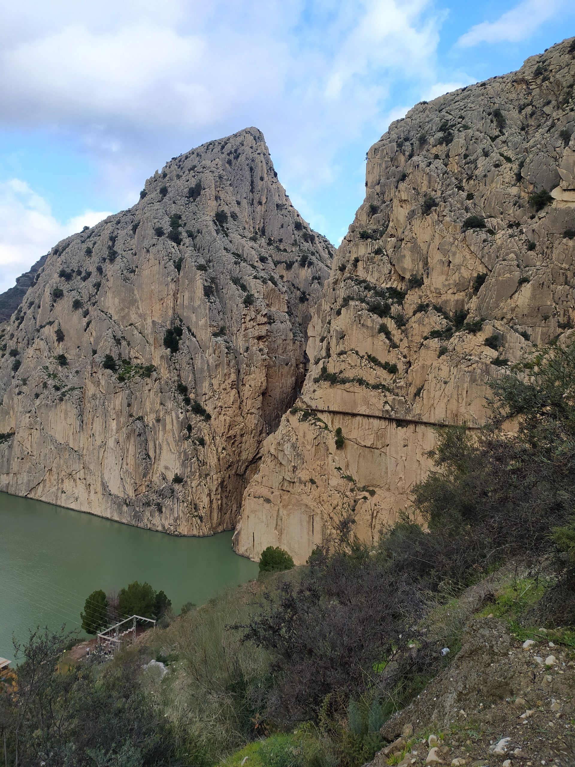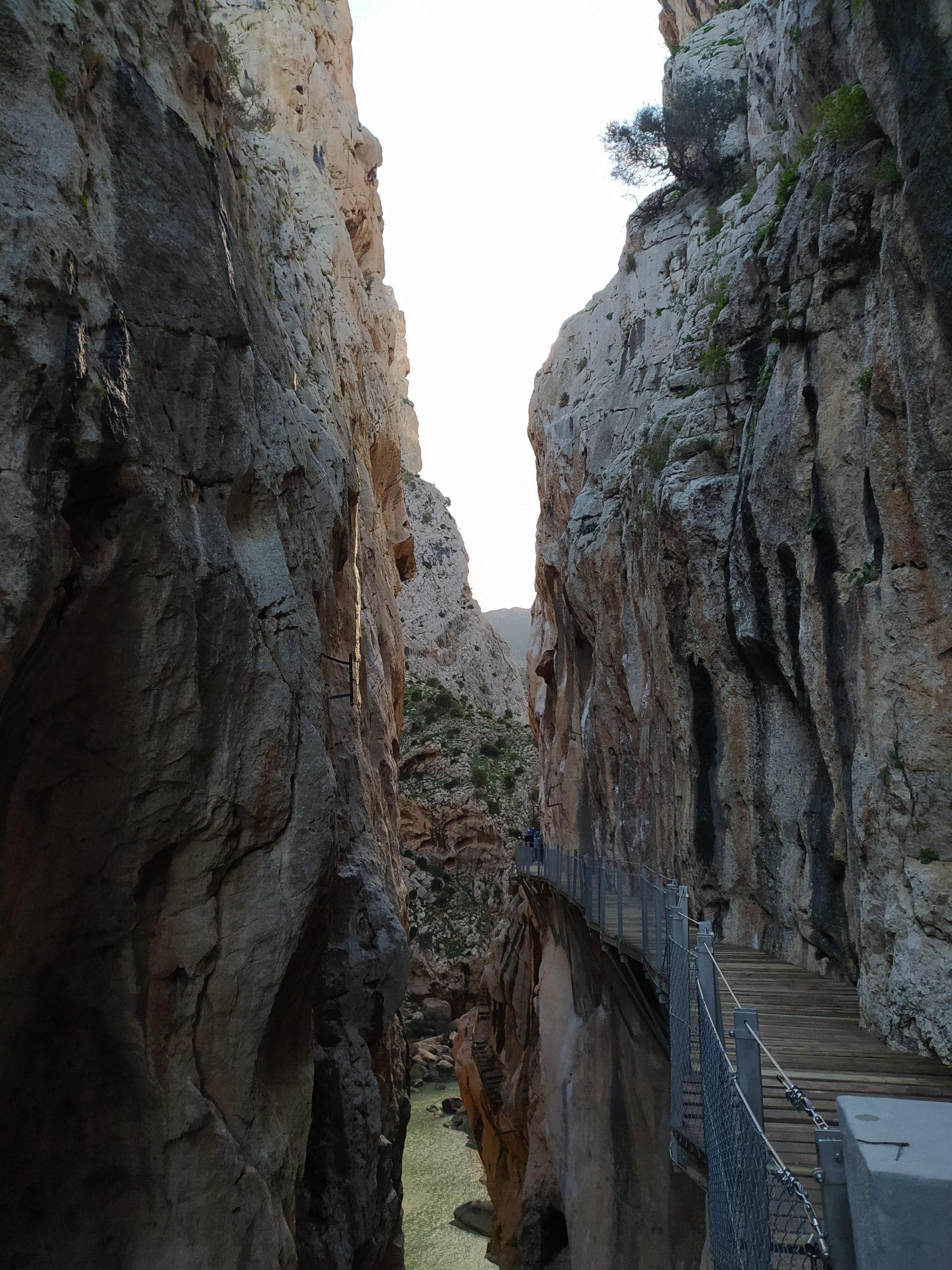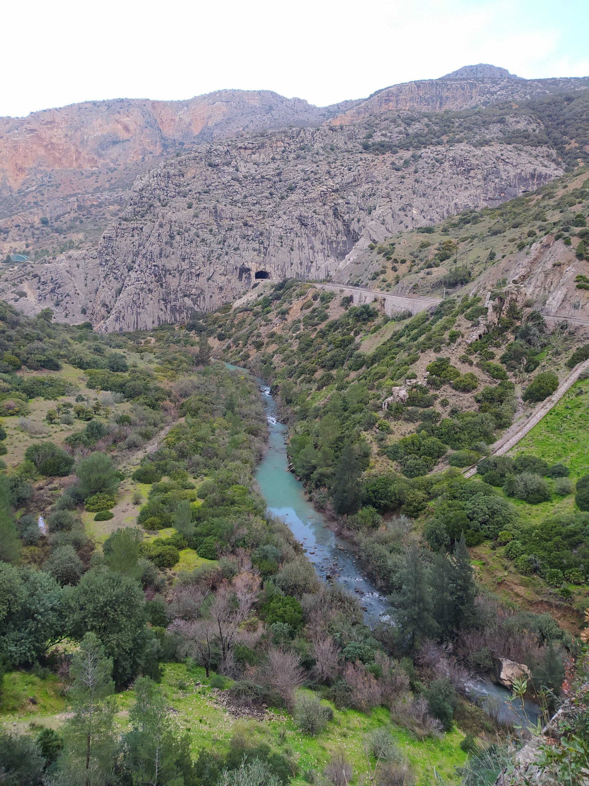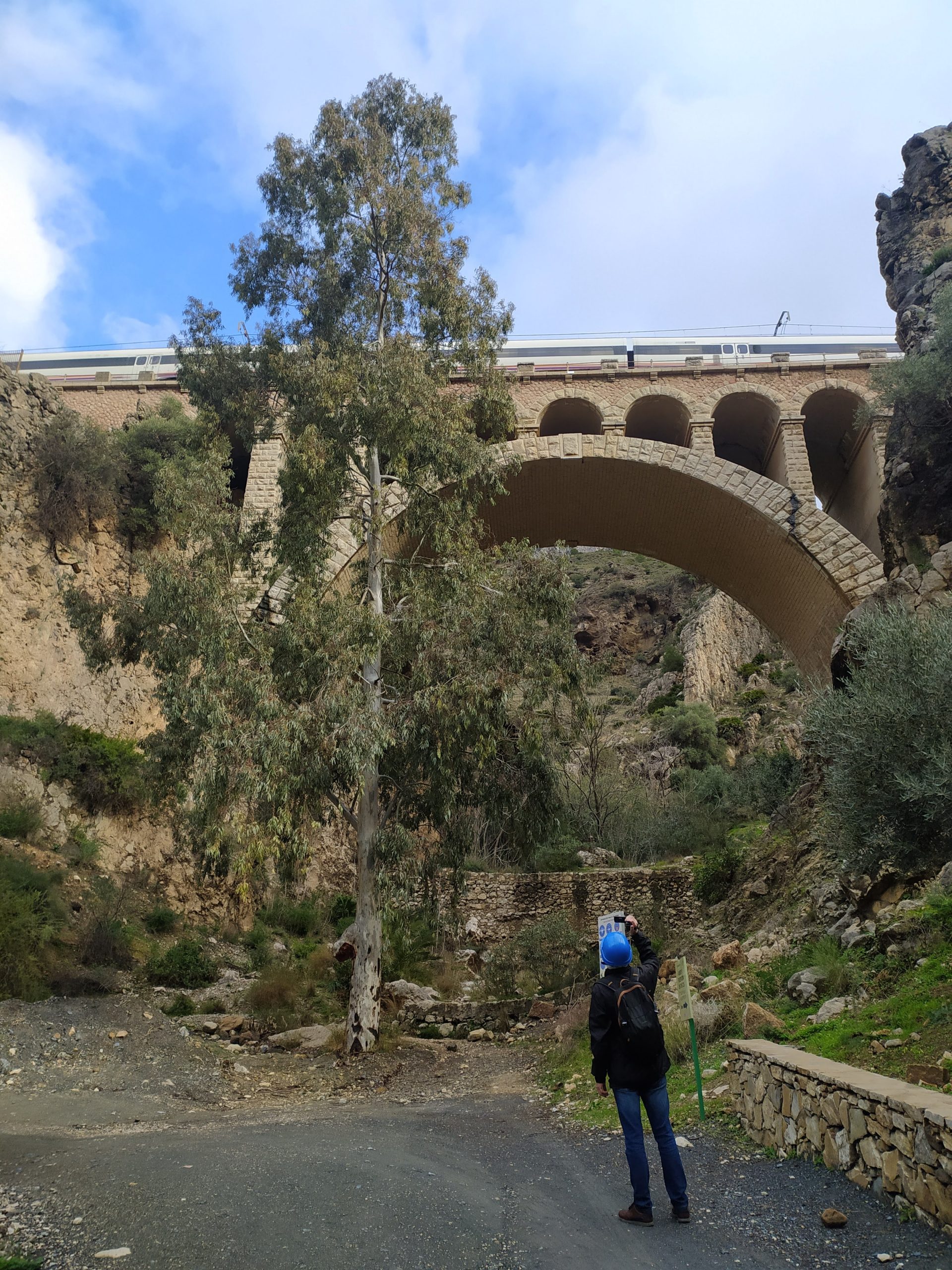 Trasa jest bardzo malownicza, idzie się po zrobionych w skale półkach. Strzeliste ściany kanionu, a nad nimi krążące orły i coś na podobieństwo sępów. W dole płynie rzeka, miejscami tworzy wodospady. Kanion trochę przypominał mi Wadi Mujib w Jordanii, tylko, że tam szliśmy jego dnem. Po drugiej stronie kanionu, w skałach wykute tunele i poprowadzone tory kolejowe, na trasie Malaga – Kordoba. Na koniec przejście po chwiejącym się, metalowym moście. Fantastyczny spacer i piękne widoki. Na końcu trasy, w miasteczku El Chorro był przystanek, skąd autobus zabrał nas na parking przy wejściu na szlak. Bardzo sprawnie jest to rozwiązane.