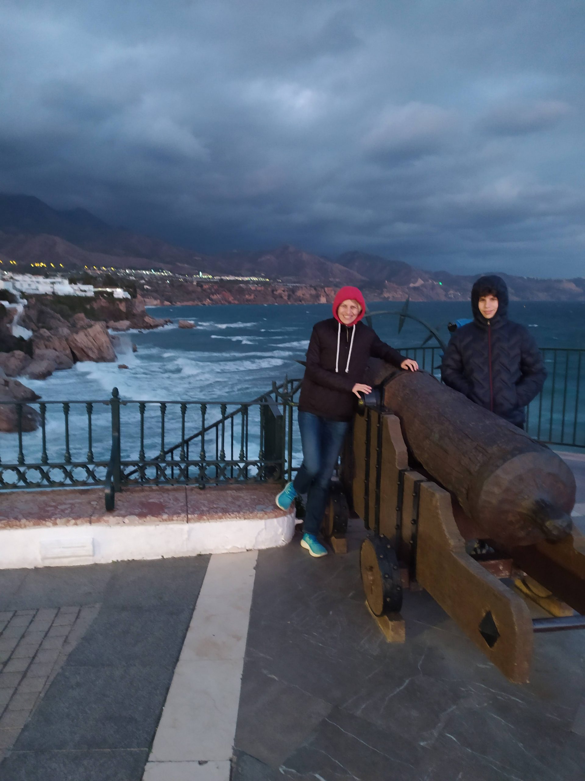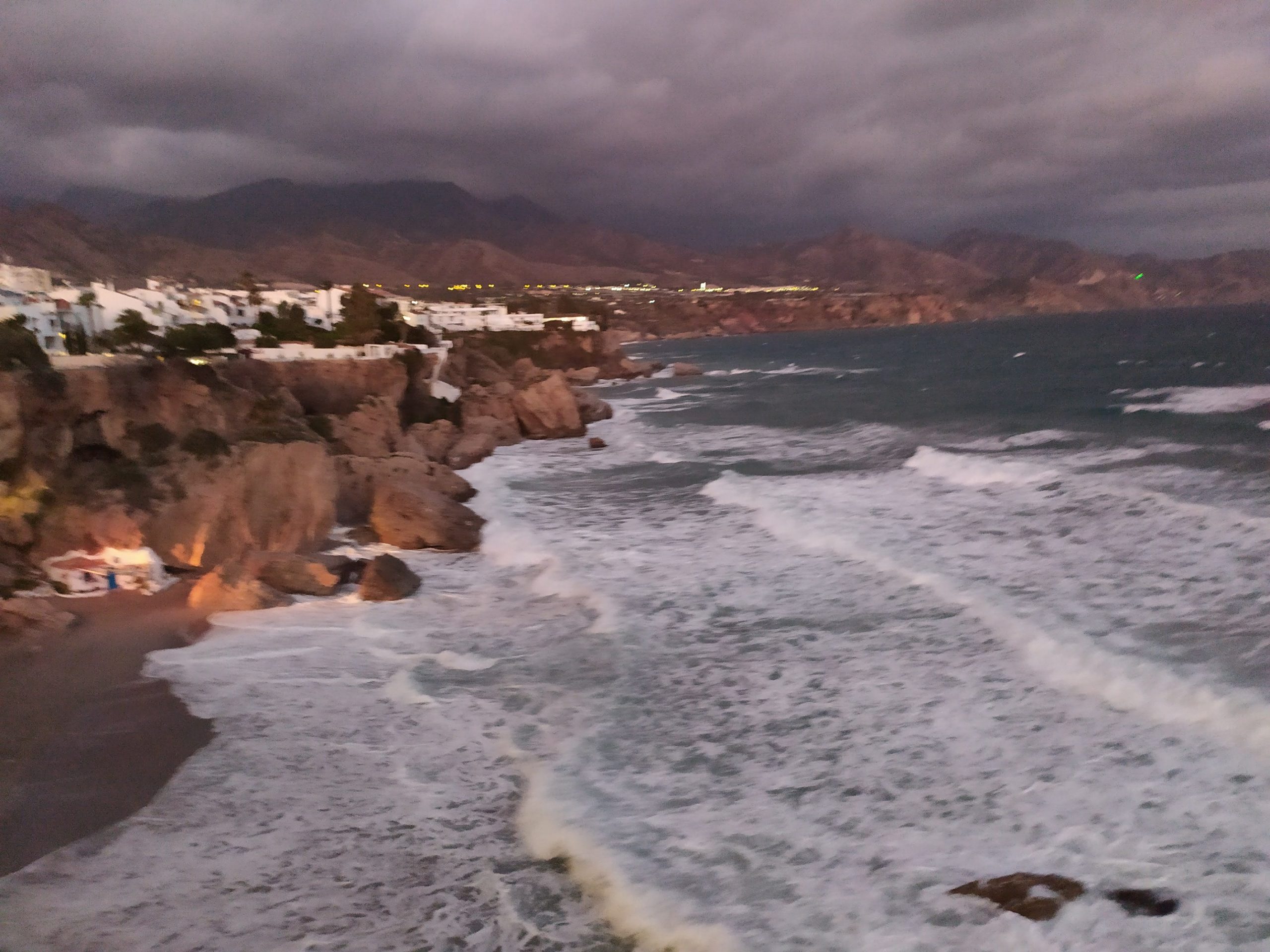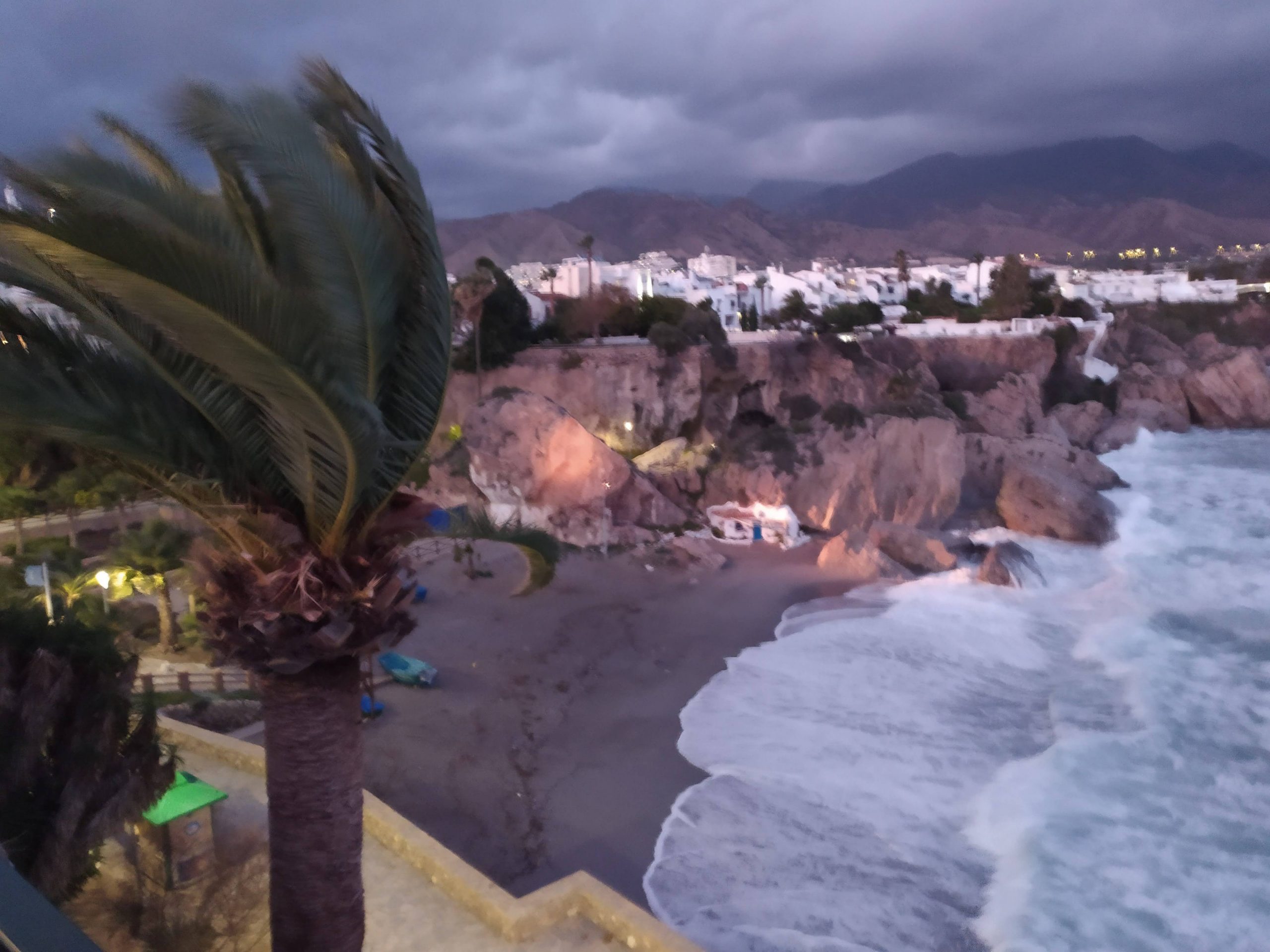 Ponieważ jutro opuszczamy Nerje, a jeszcze nie mieliśmy okazji, i jutro już chyba też nie zdążymy pochodzić jej uliczkami postanowiliśmy popędzić do nas. Chcieliśmy zobaczyć choćby słynny „Balcon de Europa” no i przynajmniej rzucić okiem na tutejsze plaże i morze. Udało się dosłownie rzutem na taśmę zaparkować i dojść na skraj lądu zanim zrobiło się zupełnie ciemno. Nagle zerwał się potworny wiatr, dosłownie urywał głowę, szamotał palmami. Pstryknęliśmy kilka fotek i schowaliśmy się w wąskich uliczkach całkiem przyjemnego miasteczka.