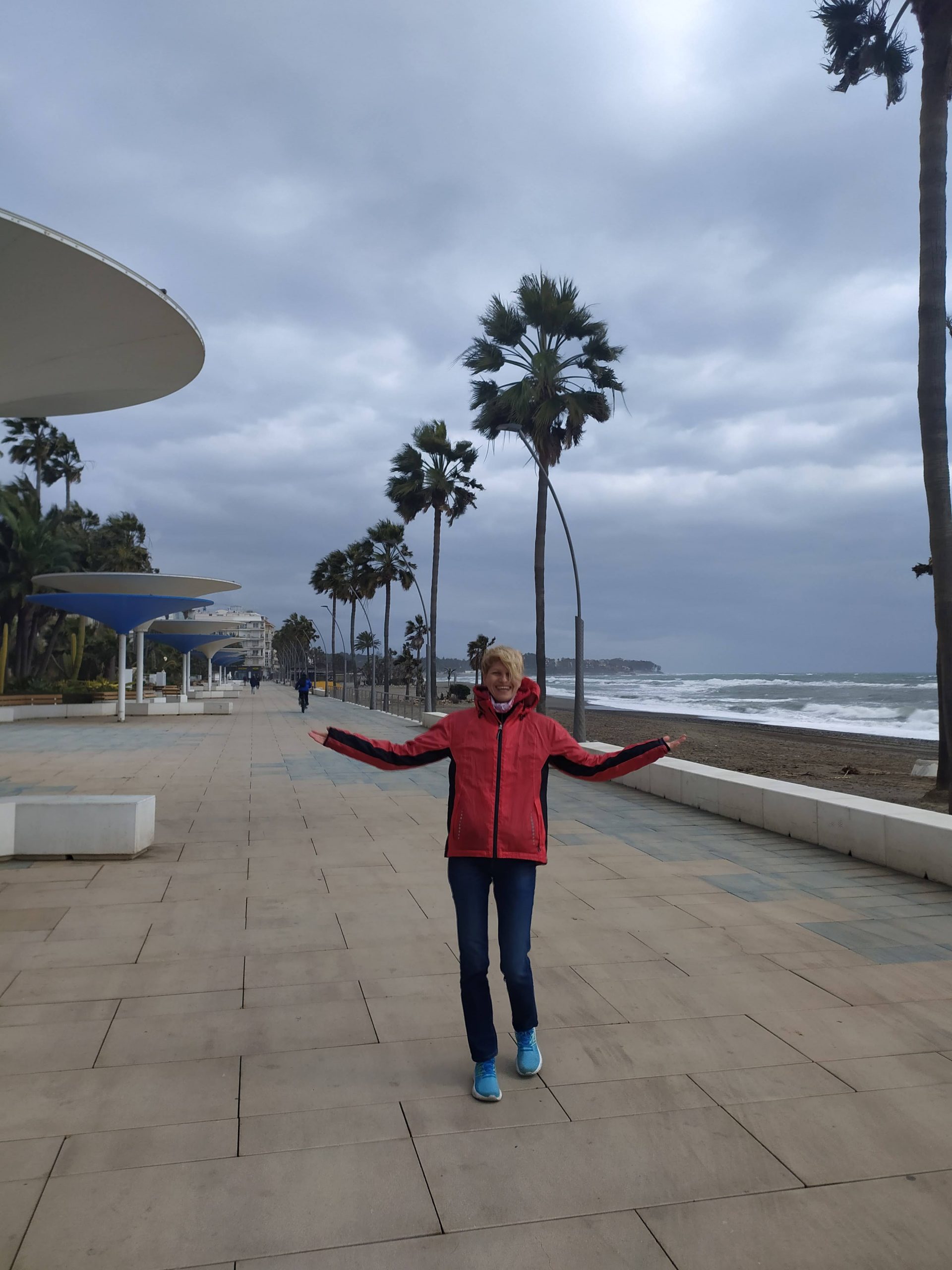 Po tygodniu pobytu na Costa del Sol w końcu też nadarzyła się okazja i znalazł czas, by zamoczyć ręce w morzu. Wiatr niezmiennie porywisty, a fale olbrzymie. Woda zimna, ale nie lodowata. Piasek nas nie zachwycił, był raczej szary niż żółty jak nad Bałtykiem. Może to kwestia sztormu i braku słońca? Przeszliśmy pustą promenadą i po 2h wróciliśmy do naszego apartamentu.