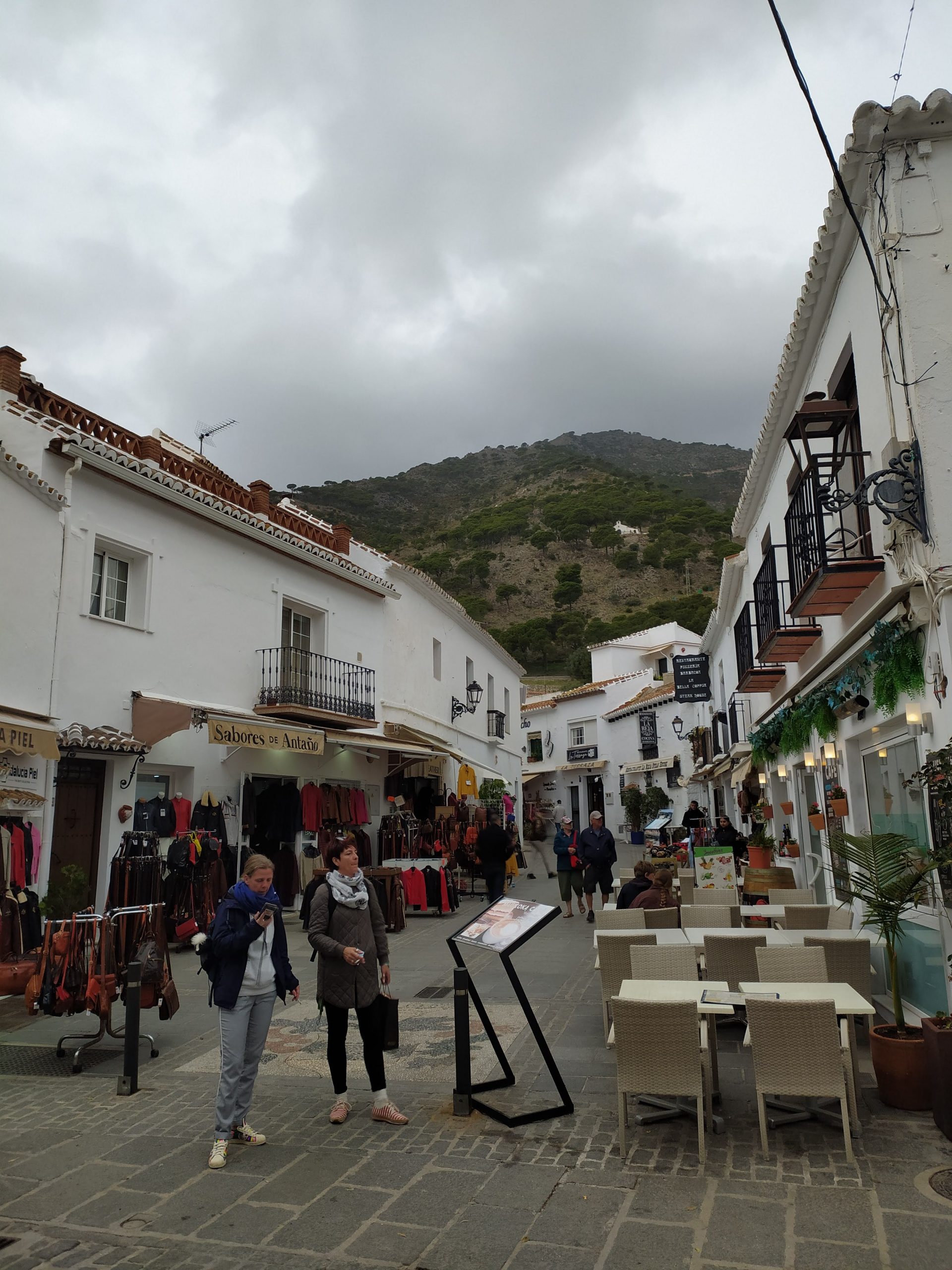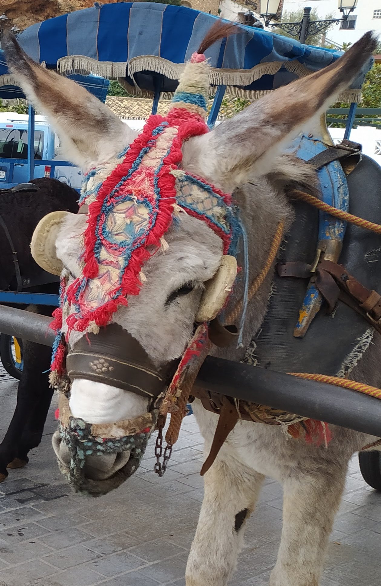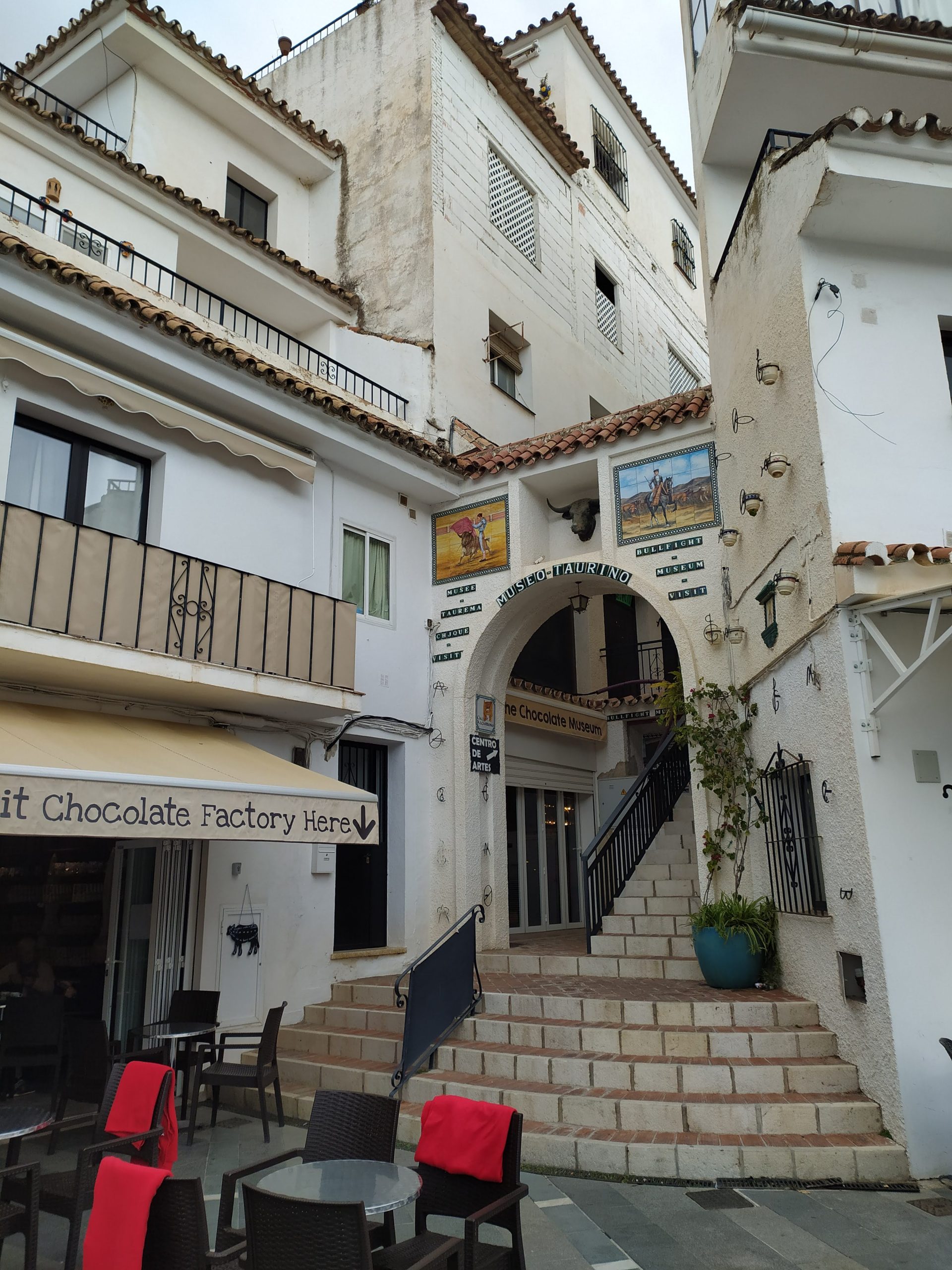 Czytaliśmy w necie, że po wąskich, stromych uliczkach kursują osiołki. Teraz na szczęście nie było wielu odwiedzających i mogły spokojnie stać w swoich boksach przy rynku. Zapewne latem mają więcej pracy wożąc leniwych turystów w upale w górę miasta… Miasteczko jest dużo bardziej nastawione na zwiedzających niż odwiedzone przez nas w poprzednich dniach Casares czy Setenil de las Bodegas. Dużo butików, kawiarni, straganów z wyrobami ze skóry i pamiątkami. Zaszliśmy do sklepu połączonego z małą rzemieślniczą wytwórnią czekolady. Czekolady wyglądały tak smakowicie, że kupiliśmy kilka tabliczek.