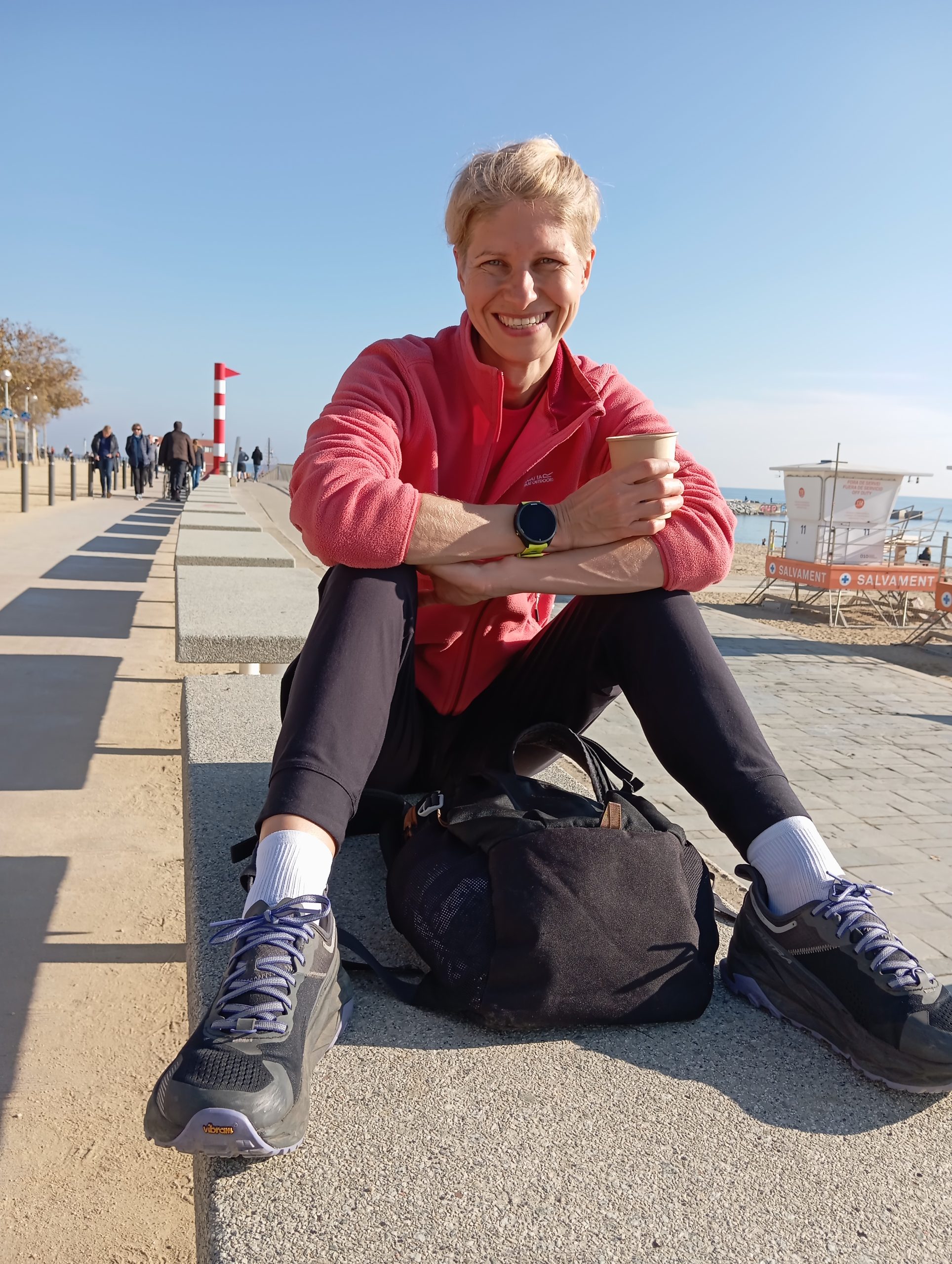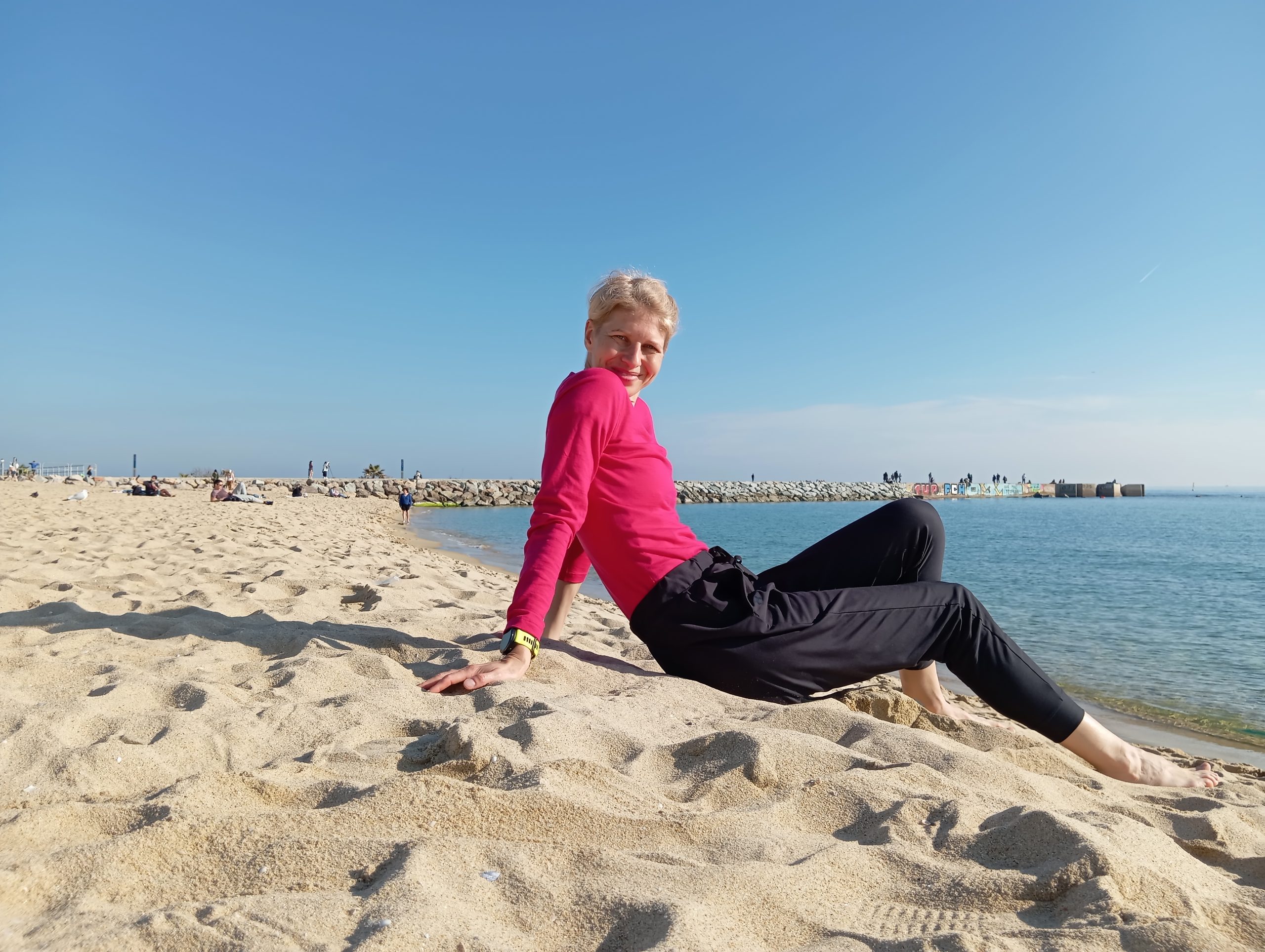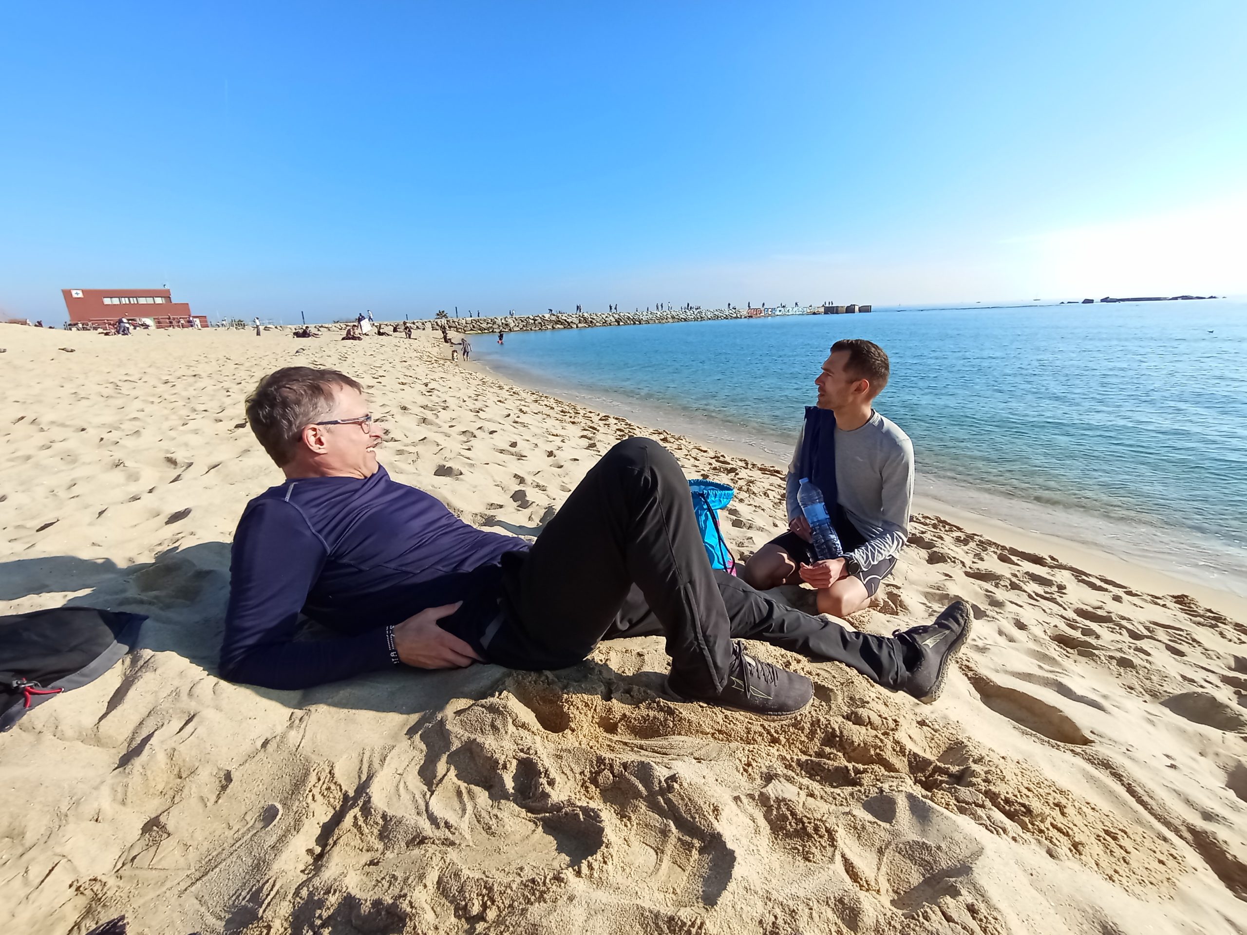 Z punktu startu był rzut kamieniem do morza. Sebastian poszedł na swój rozruch, a my z Jackiem usiedliśmy na słonecznej promenadzie. Dziś pogoda była piękna, łapaliśmy słońce. Na plaży ludzie grali w siatkówkę plażową, biegali po promenadzie, jeździli na rowerach i rolkach, ćwiczyli jogę. Mam wrażenie, że tu wszyscy się ruszają. Ale taka pogoda na pewno temu sprzyja. Jak jest tak słonecznie i ciepło, to się po prostu bardziej chce żyć. Seba skończył w międzyczasie swój trening, potem razem jeszcze posiedzieliśmy chwilę na plaży. Woda w morzu zimną, ale kilka osób się kąpało, ja tylko zamoczyłam stopy. Na poprzednim wyjeździe było tak aktywnie, że przez tydzień nie znalazłam na to czasu 😂