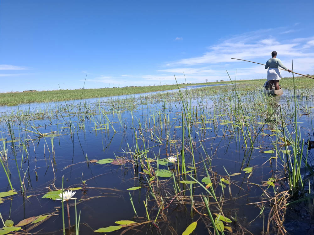 Podzieliliśmy się na pary, każda dostała swojego „powożącego”. Mokoro wygląda jak kajak. Różnica taka, że powozi się nią na stojąco, z tyłu łodzi, opychając się długim prostym drągiem od dna. Płynęliśmy jedna łódź za drugą wąskim kanałem zarośniętym trawą i liliami. Robili tak specjalnie. Na większych otwartych przestrzeniach, tworzących rozlewiska żerują hipopotamy. Są bardzo terytorialne i absolutnie nie chcieliśmy znaleźć się z nimi w jednym basenie.