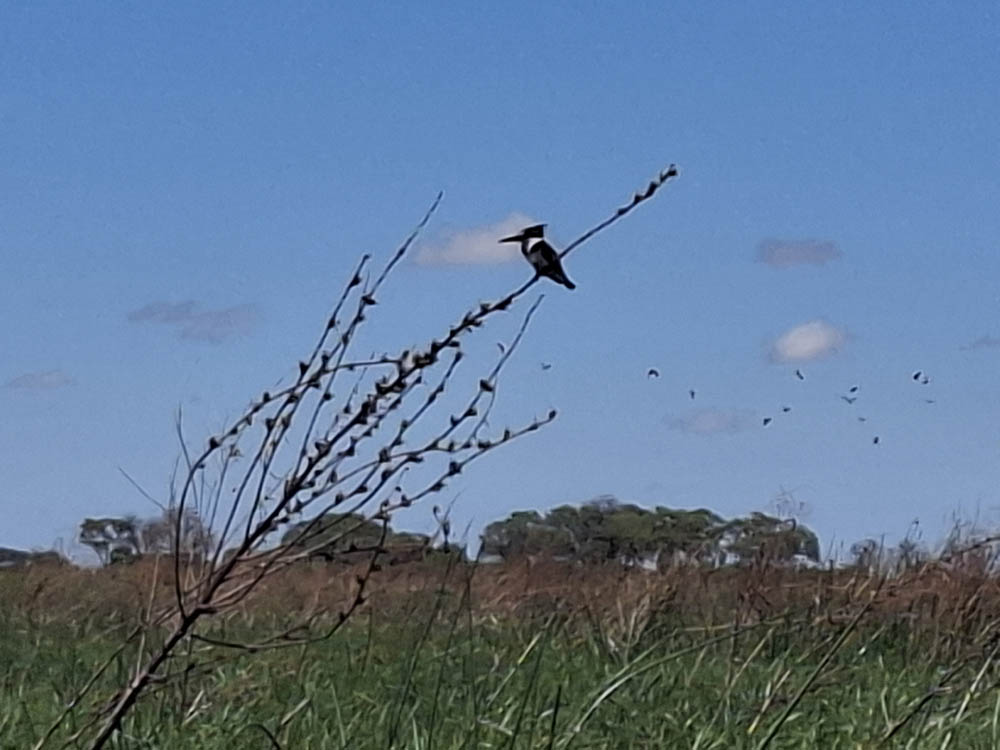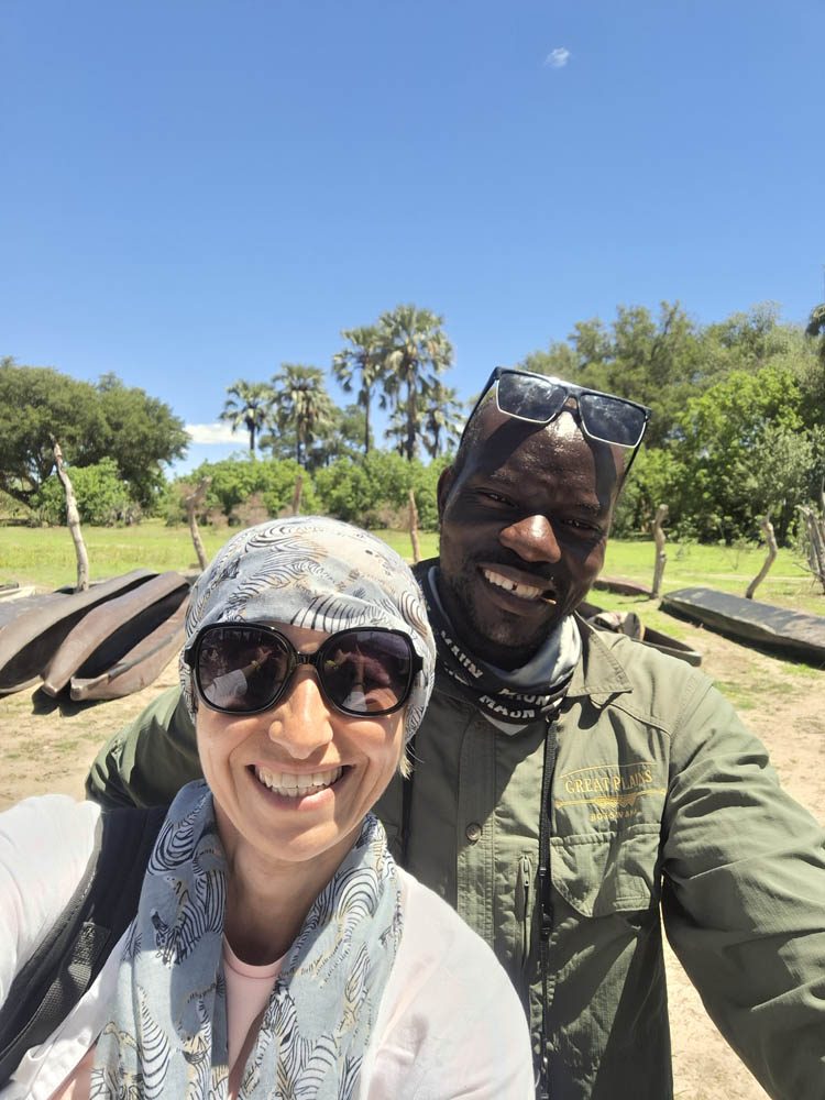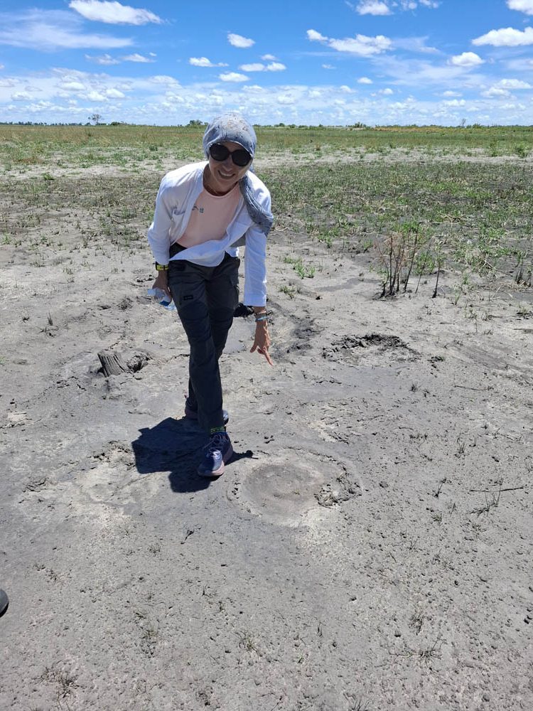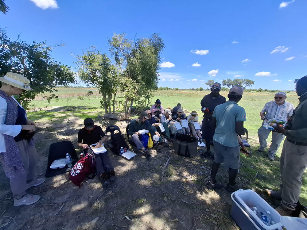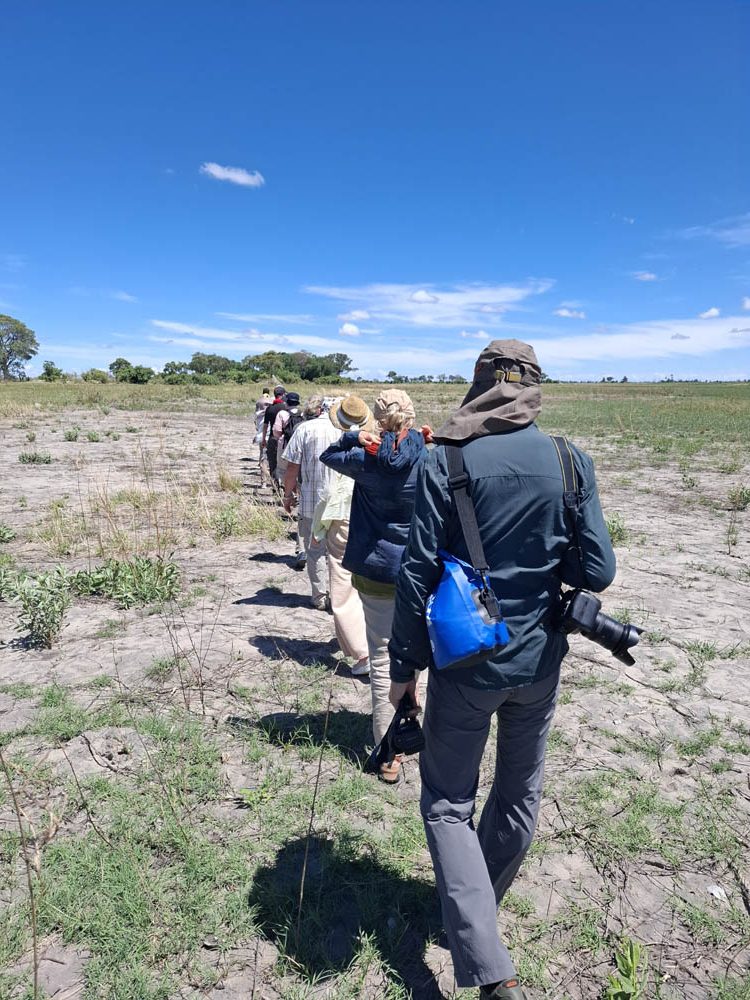 Po pewnym czasie dobiliśmy do brzegu. Wysiedliśmy z mokoro. Najpierw podeszliśmy trochę bliżej zobaczyć chowające się w wodzie przed słońcem hipcie. Potem ruszyliśmy na bush walk. Nasz przewodnik szedł pierwszy, pokazywał nam ślady zwierząt, opowiadał o ich zwyczajach. W tym czasie reszta ekipy powożącej łódkami przygotowała pod drzewem lunch w formie pikniku.