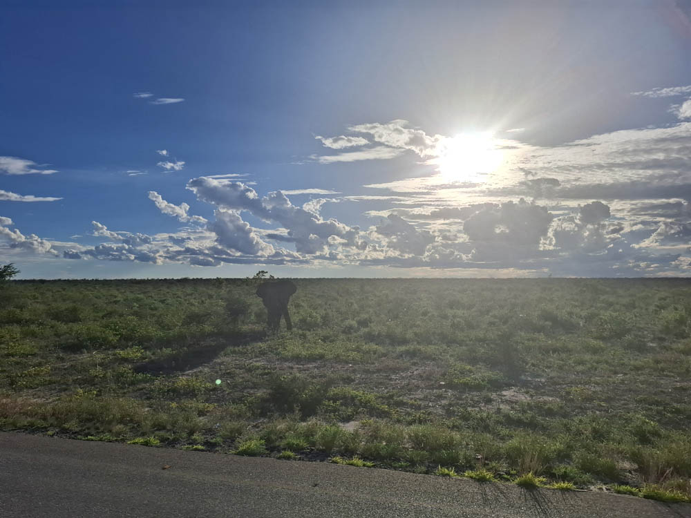 Opuściliśmy teren północnej Botswany i styku 4 krajów i ruszyliśmy na południe. Kolejny punkt na trasie naszej podróży to miejscowość Nata. Droga, jedyna asfaltowa prowadziła pionowo z Kasane w dół. Ruch na drogach nie był zbyt duży. No, ale przede wszystkim w końcu pojawiły się wyczekiwane słonie. Były przy drodze spokojnie pochłaniając kilogramy liści z zielonych o tej porze krzaków i drzew.
