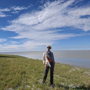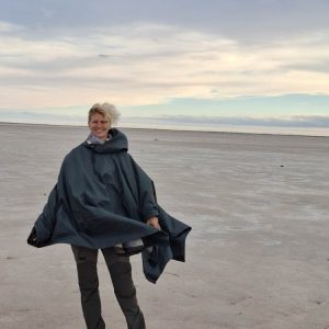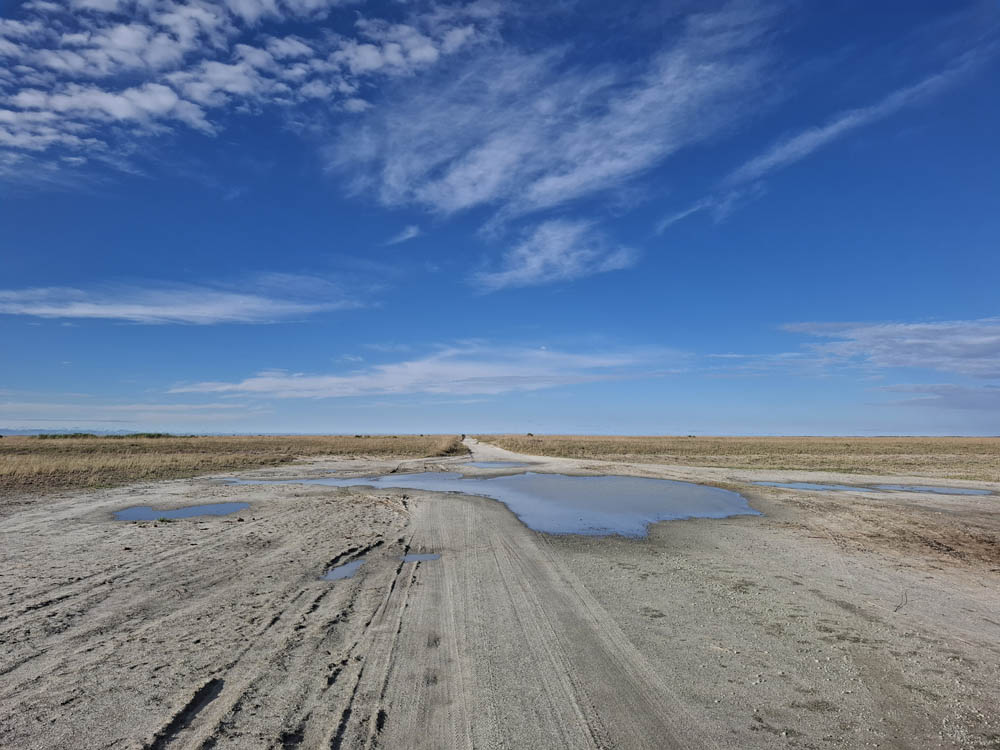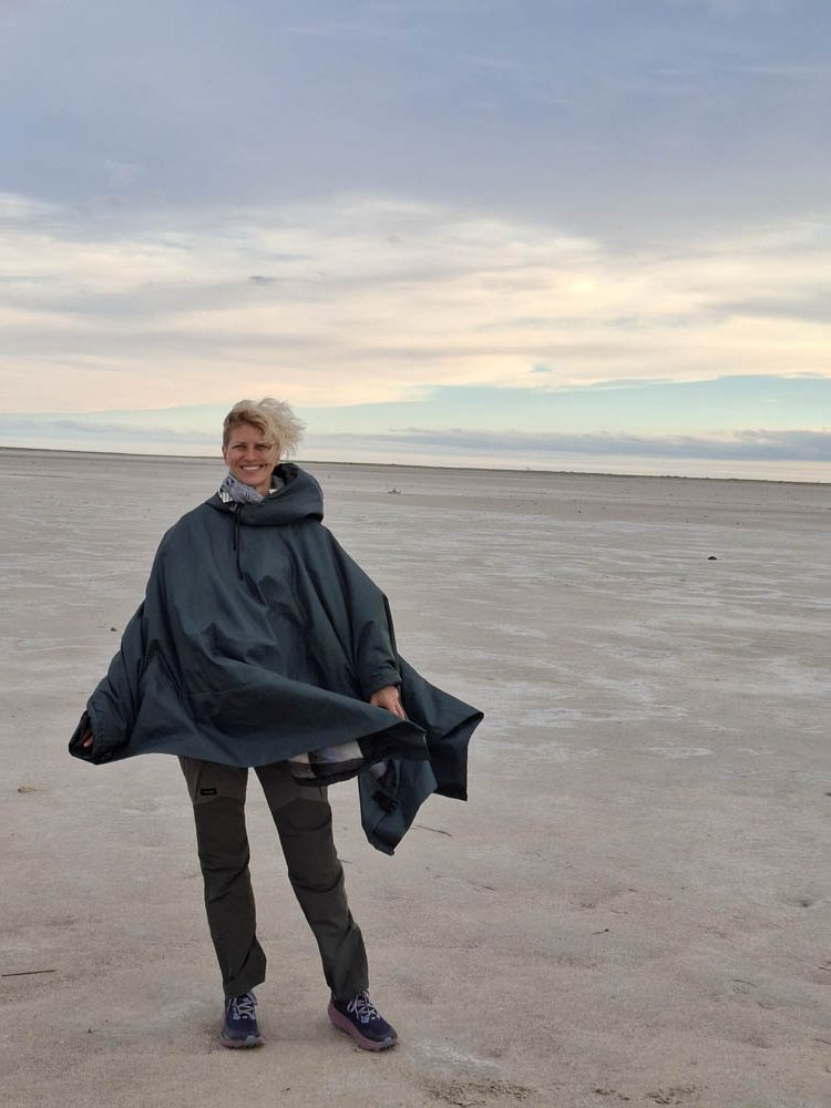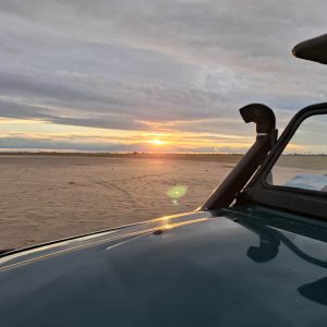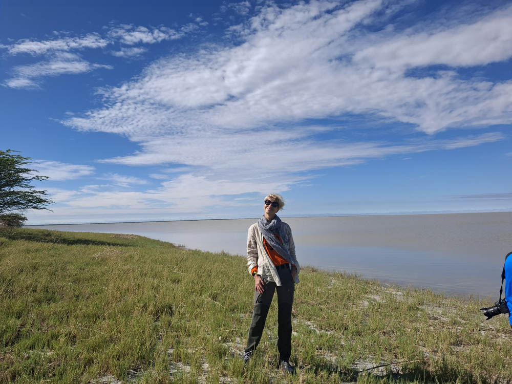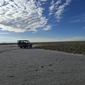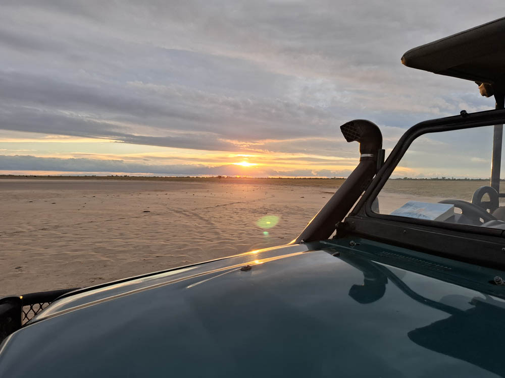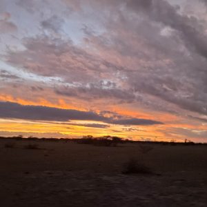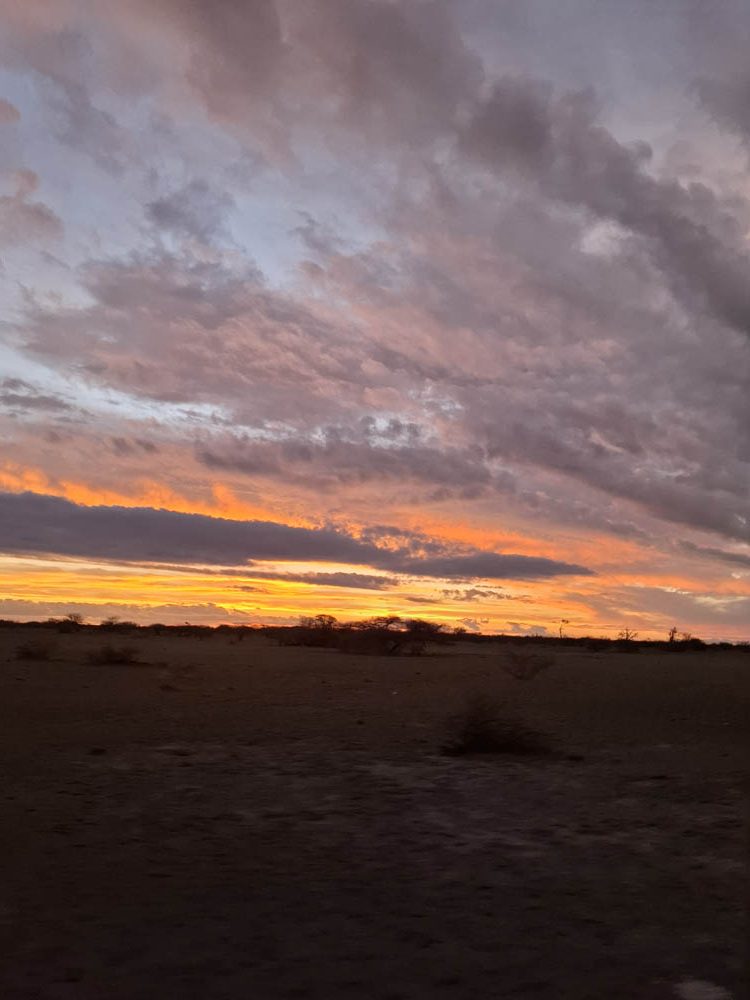 Po surykatkach podjechaliśmy na solnisko. Olbrzymia pusta przestrzeń. Dawniej było tu największe jezioro Afryki. Zajmowało powierzchnię ok 80.000 km2, czyli tyle co Austria. Na skraju piaszczystej powierzchni, na trawie pasły się krowy i konie. A dalej piach po horyzont. Niebo zaczęło się przebarwiać. Nadchodził zachód słońca, jeden z piękniejszych jakie widziałam.
