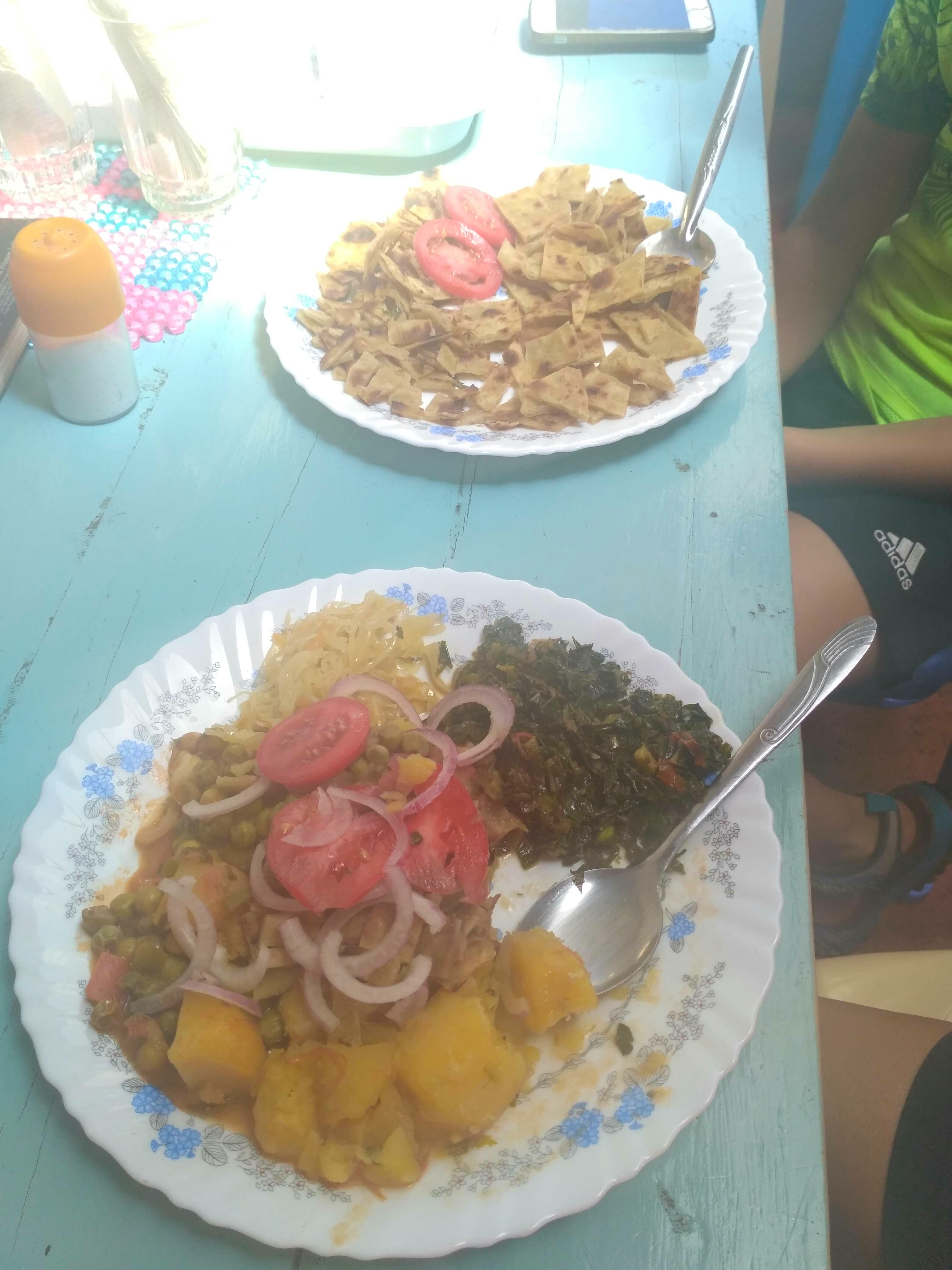 My w tym czasie poszliśmy na herbatę i lunch do knajpy na piętrze. Porozmawialiśmy o treningu i postępach. Yacool z Jankiem motorem wrócili do naszego guesthousu, reszta piechotą. Po drodze dokupiliśmy owoców. Później kilka osób wybrało się na kawę do Kerio View. Ja z Jankiem poszliśmy do Nancy na lunch. Janek dostał chapati z pomidorami. Kilka razy musiał tłumaczyć kelnerce, by było bez sosu i innych dodatków. Dla mnie kucharz zaoferował się, że przygotuje coś specjalnego. Dostałam czubaty talerz, a na nim chapati, pieczone zielone banany, kapustę, managu i groszek. Było pyszne. Zapiłam to sokiem z mango i ledwo wstałam od stołu. By trochę spalić kalorii poszłam z Jankiem na kolejny spacer do centrum. U Hindusa kupił sobie loda.