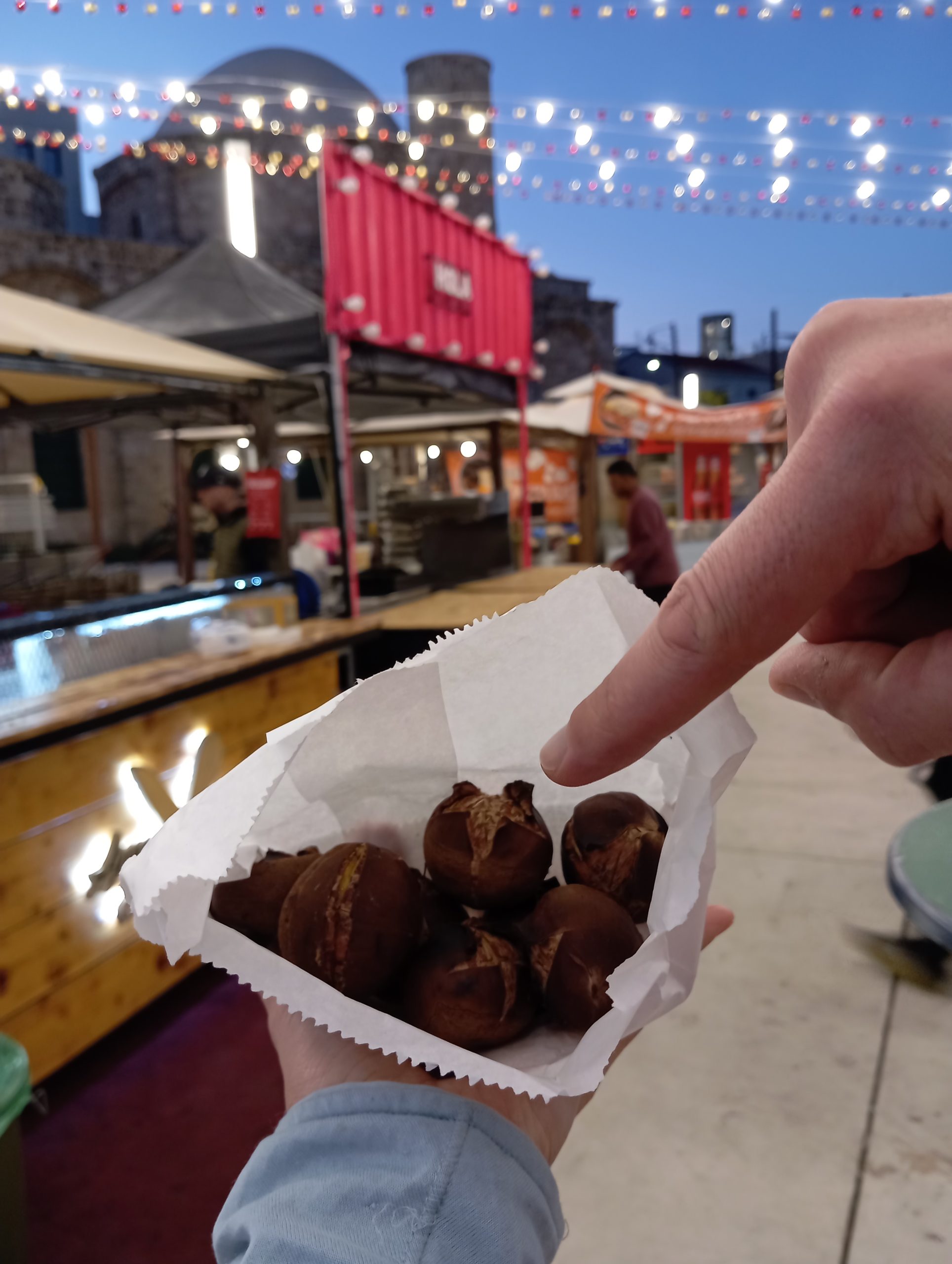 Wciągnęliśmy co nieco i podjechaliśmy jeszcze na spacer po zabytkowej części Larnaki. Wcześniej w internecie, na głównym placu widziałam zawieszony olbrzymi księżyc. Ale ta inscenizacja została już niestety zdemontowana. Teraz w tym miejscu rozstawione były budki z jedzeniem, scena i muzyka, bynajmniej nie kolędy świąteczne. W końcu zjadłam swoje pierwsze w życiu pieczone kasztany! Fajny, słodki smak, w konsystencji podobne do pieczonych na ognisku ziemniaków.
