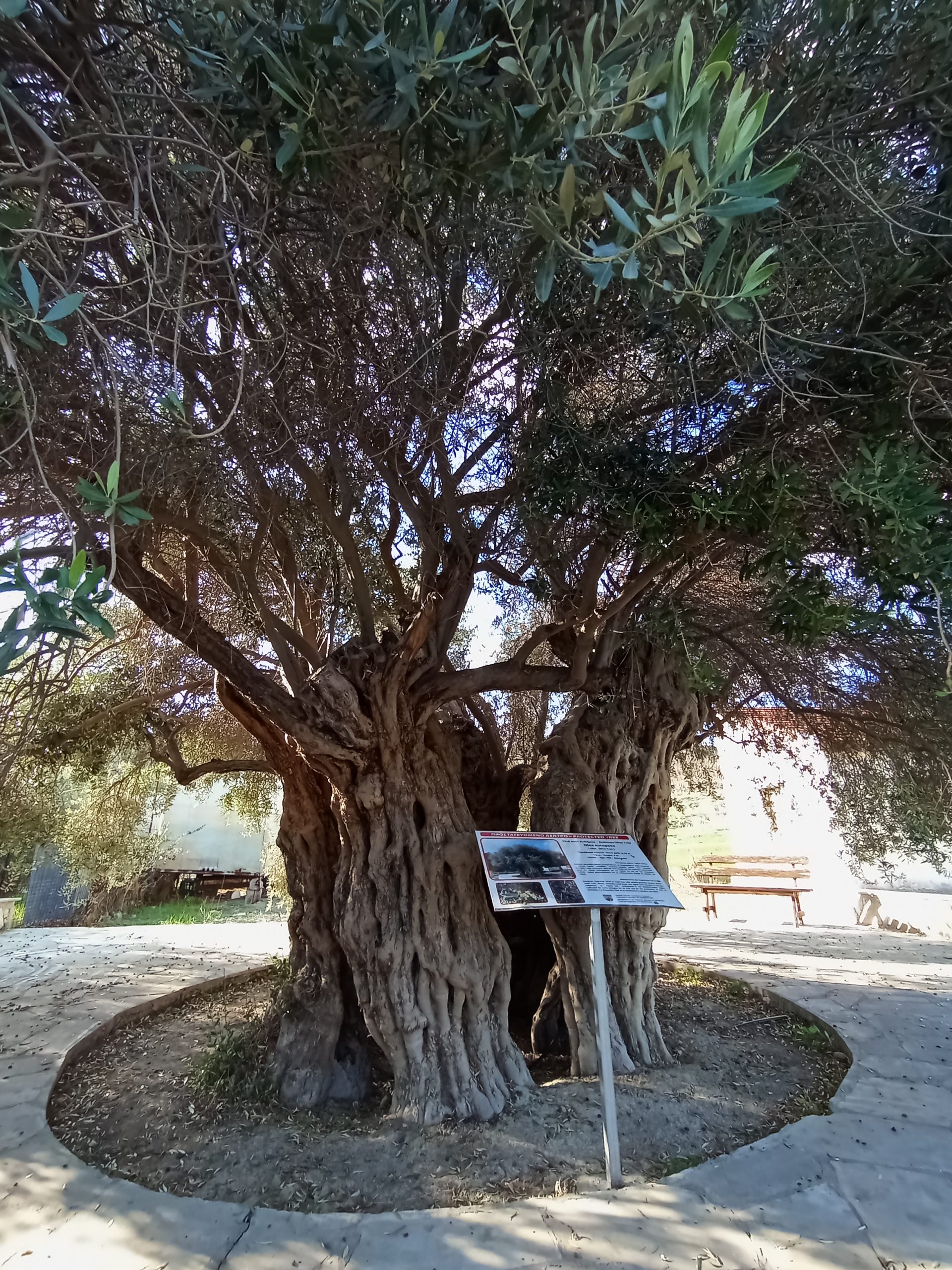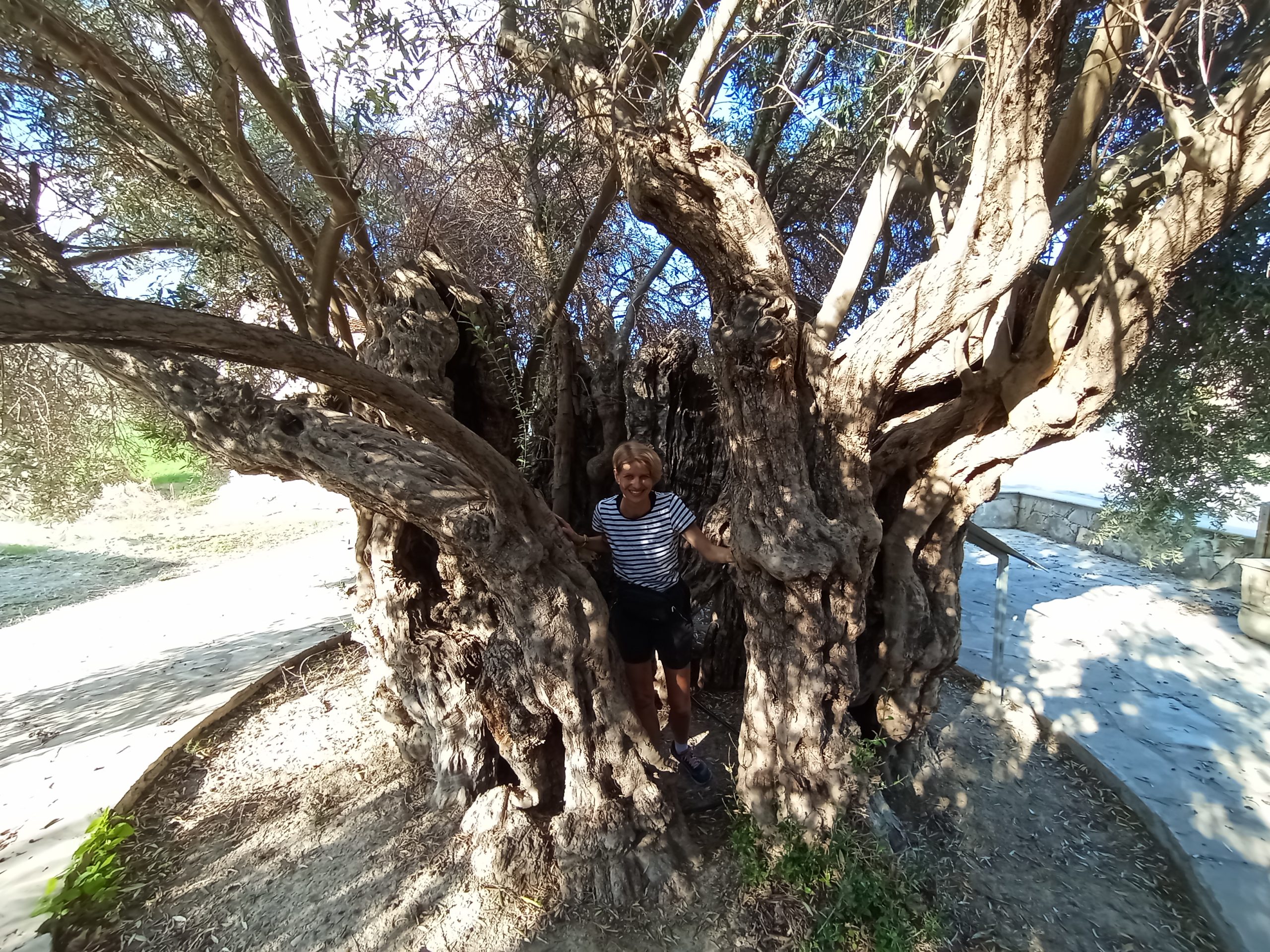 Głodni zajechaliśmy do Pisouri, ale trafiliśmy na sieste. Kupiliśmy trochę owoców w otwartym markecie i z siatami wróciliśmy do auta. Pojechaliśmy też zobaczyć stare, datowane na 700 lat drzewo oliwne. Faktycznie było duże, a jego pień pusty w środku.