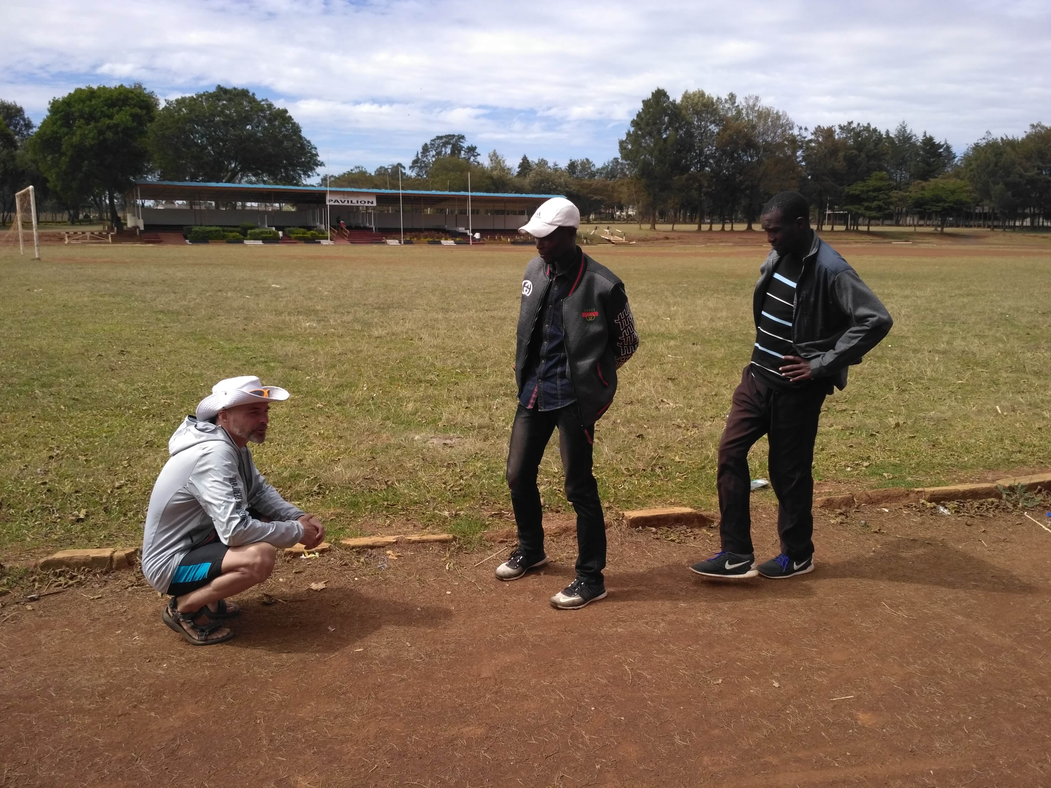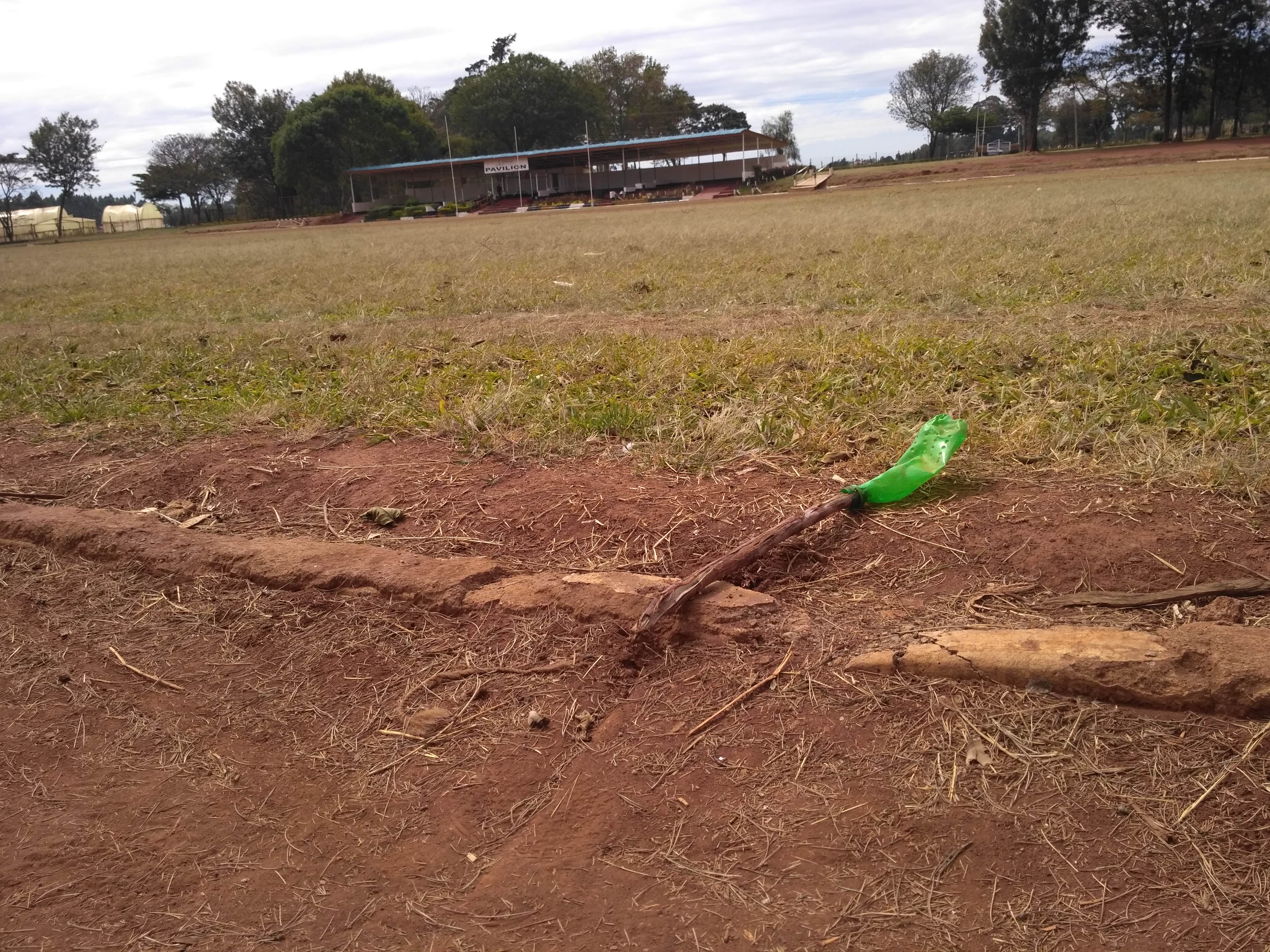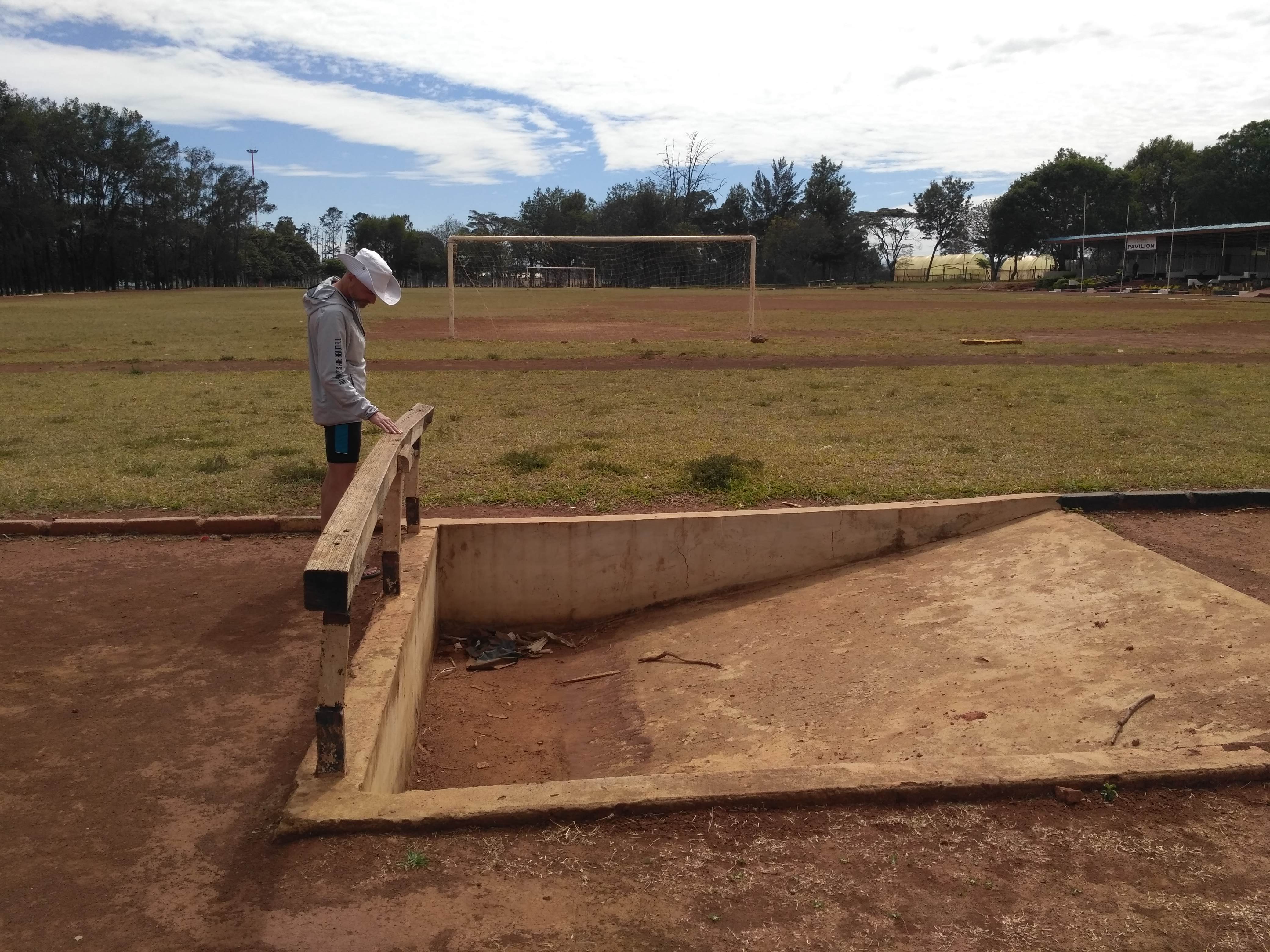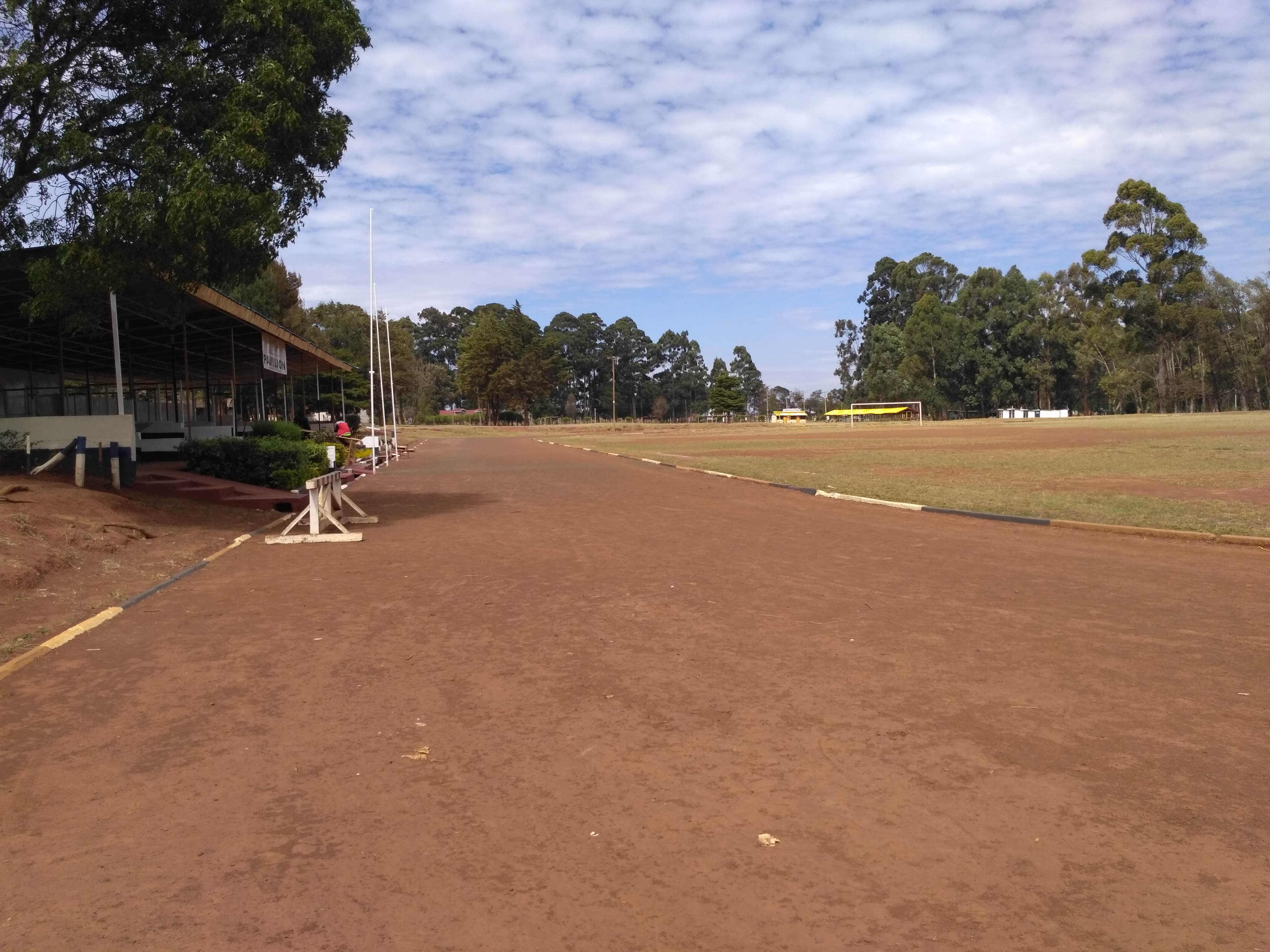 Wysiedliśmy na krzyżówce przed wjazdem do centrum. Tam złapaliśmy drugi podjazd, którym podjechaliśmy do uniwersyteckiego campu, gdzie znajduje się jeden ze stadionów. Przeszliśmy się dookoła po bieżni. Pierwszy tor, tak jak kiedyś na Kamariny był bardziej wydeptany i tworzył zagłębienie w kształcie podłużnej rynny. Meshack znalazł na nim wkręt do kolców lekkoatletycznych, kto wie może to Kipchoge go zgubił… Belka do biegów przez przeszkody także nosiła mocne ślady zużycia. Była wręcz wygięta, a gdy yacool się o nią oparł, zaczęła cała się telepać. Linię 200 metrów, skąd rozpoczynają biegać odcinki wyznacza plastikowa zielona butelka nadziana na patyk.