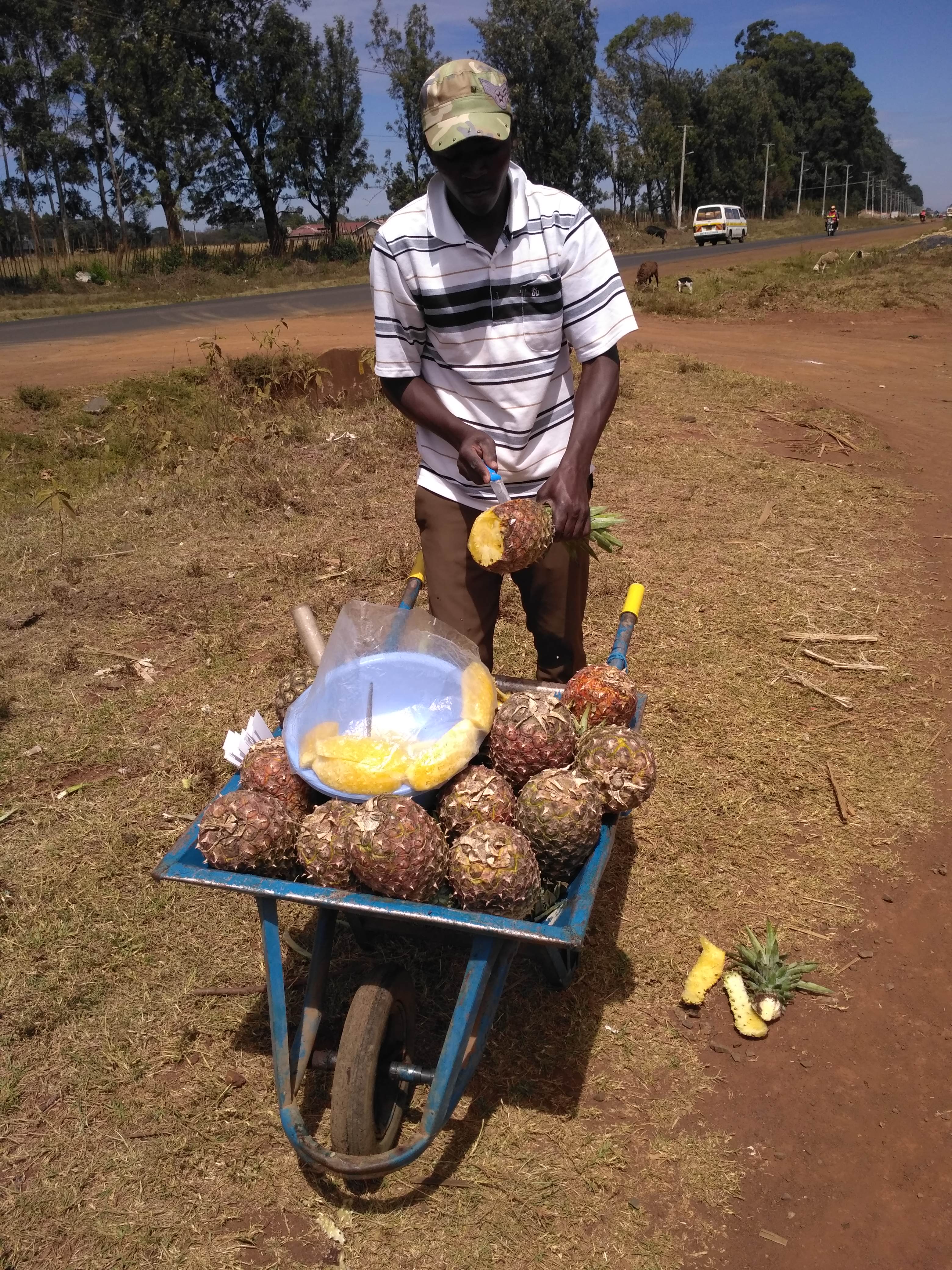 Powdychaliśmy trochę atmosfery stadionu i ruszyliśmy w drogę powrotną. Po drodze kupiliśmy sobie po dwa kawałki pysznego, świeżego ananasa. Był bardzo soczysty i słodki. Niebo w gębie. Doszliśmy do miejsca skąd wcześniej ruszaliśmy i wsiedliśmy do kolejnego matatu, by podjechać do centrum Eldoret. Plan był taki, by pójść gdzieś na herbatę, a potem pojechać na drugi stadion. W centrum miasta ruch był jak zwykle bardzo duży. Ciężarówki, auta osobowe, motorku i piesi. Wszystko się ze sobą miesza. Mimo to każdemu jakoś udaje się pokonać skrzyżowanie bez stłuczki, czy wypadku. Za każdym razem, gdy tam jestem czuję, że muszę mieć oczy dookoła głowy, bo nigdy nie wiem skąd może pojawić się jakiś pojazd. A nadjeżdżają dosłownie zewsząd. Tu nie ma pasów na jezdni, obok siebie jedzie tyle aut ile się zmieści.