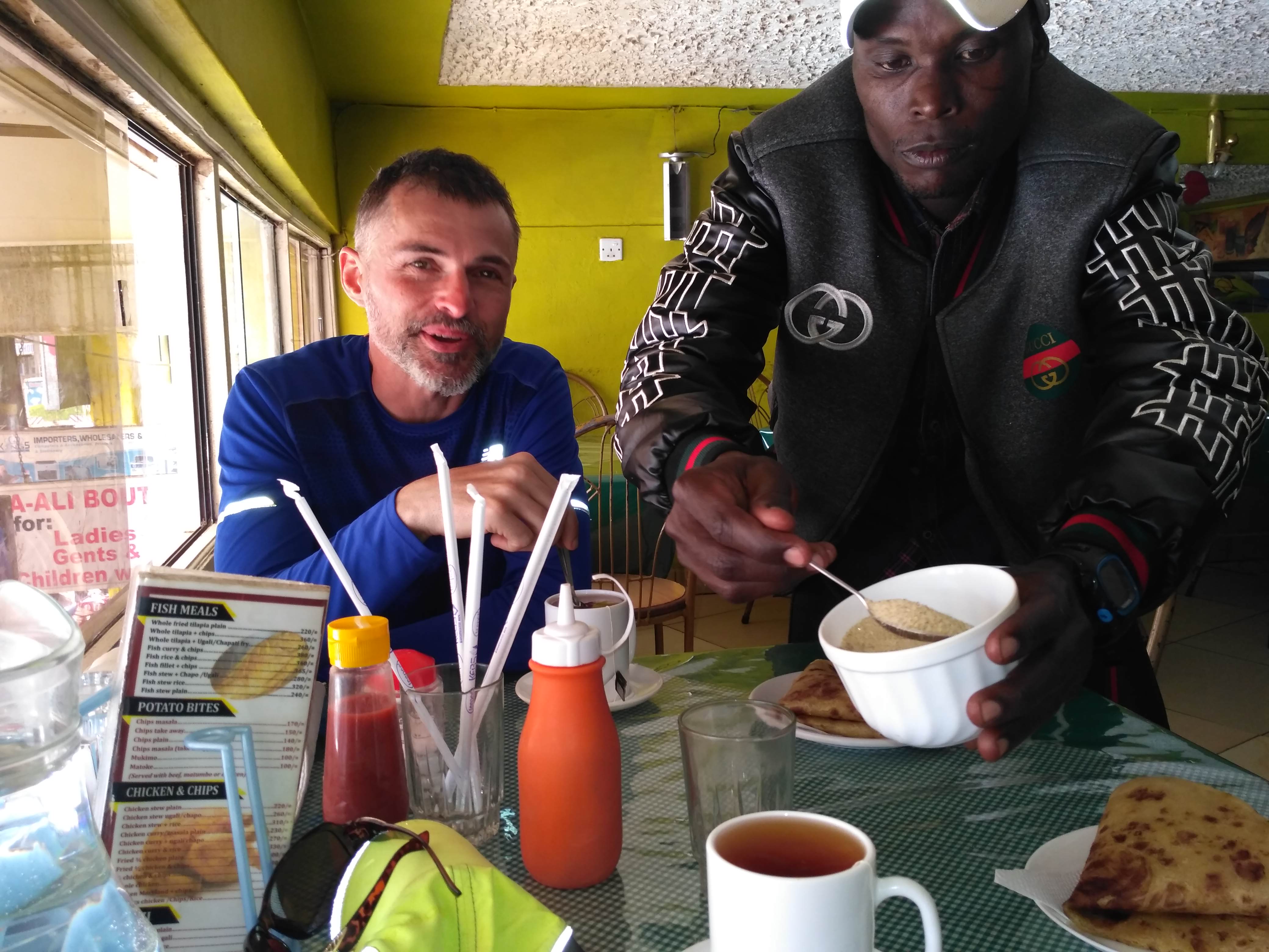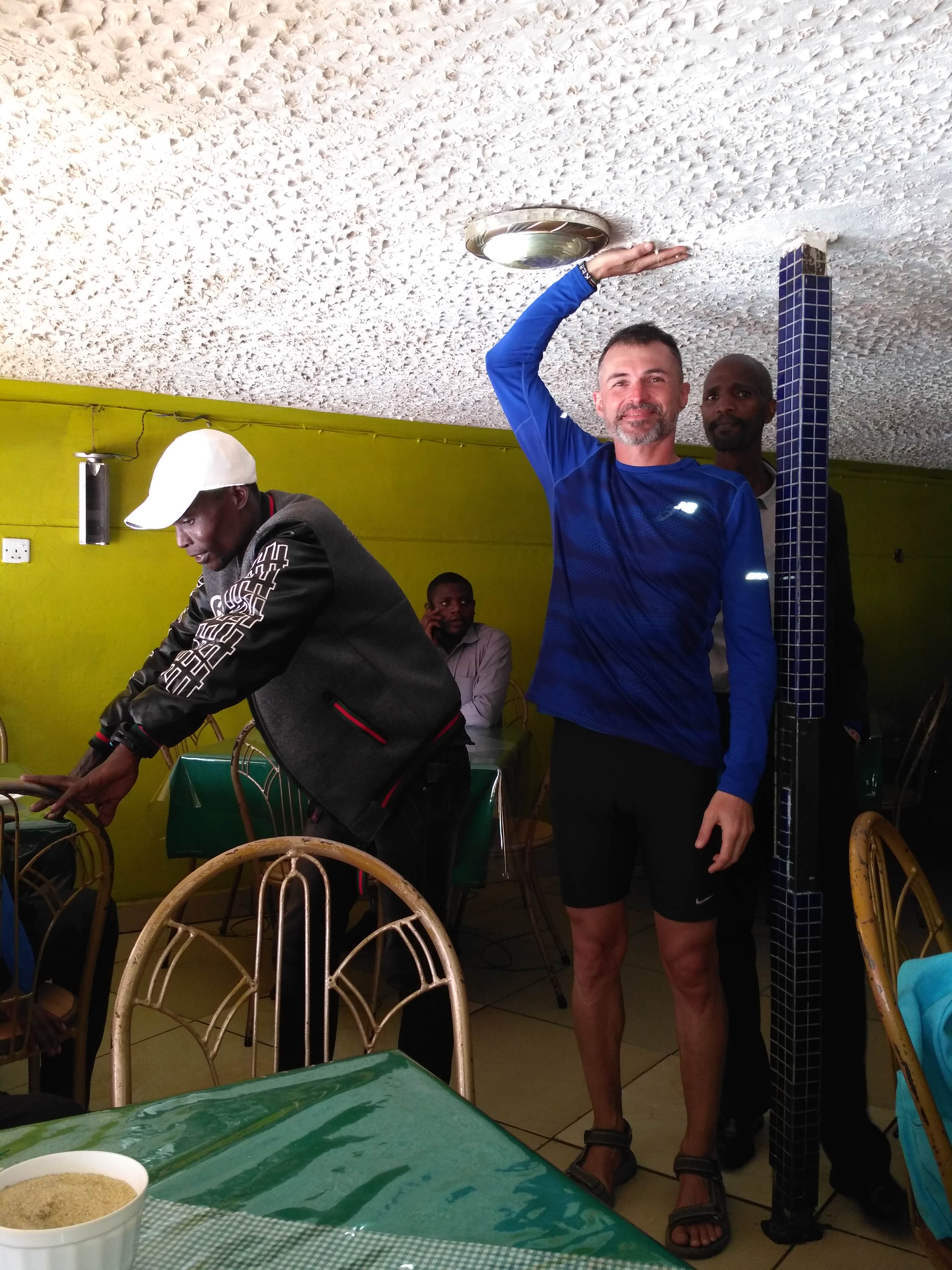 Weszliśmy do knajpki. Zaskoczył nas jej bardzo niski sufit. Myślę, że pomieszczenie nie miało dwóch metrów wysokości. Usiedliśmy na piętrze, zamówiliśmy herbatę i chapati. Przy stoliku obok siedział jakiś mężczyzna, znajomy chłopaków. Okazało się, że jest biegaczem w grupie Eliuda Kipchoge. Powiedział nam, że jutro będą robić speedwork i wskazał, na którym stadionie. Postanowiliśmy więc nie jechać tam już dziś skoro jutro i tak udamy się na ten obiekt o świcie. Wyjazd do Kaptagat też odłożyliśmy. Zobaczymy jak jutro potoczy się dzień, czy faktycznie spotkamy Eliuda i na ile będzie szansa na rozmowę i wtedy ewentualne spotkanie w jego campie.