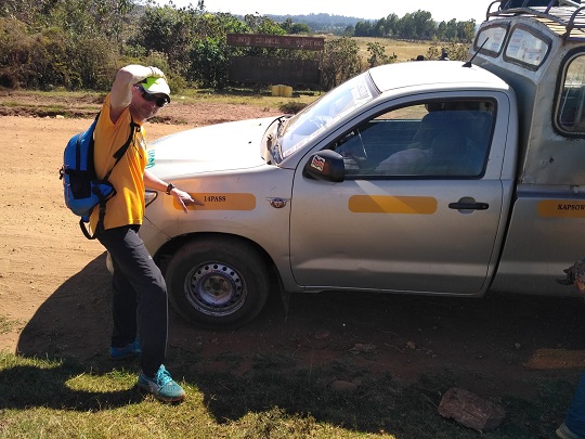 Droga stawała się coraz gorsza, a jazda coraz bardziej uciążliwa. Krajobraz zmieniał się z płaskiego w coraz bardziej pagórkowaty, ale trudno było nam go podziwiać. Ściśnięci niczym sardynki w puszce, z ograniczonym dostępem do powietrza zaczęliśmy żałować tego pomysłu. Dodatkowo jedno z dzieci zwymiotowało. Nastąpiła szybka ewakuacja z auta, by móc posprzątać wnętrze. Wykończona stwierdziłam, że lepiej tu zostać i złapać jakieś auto powrotne. Dopiero teraz towarzysze podróży powiedzieli nam wprost, że podróż z Kapsowar do Tot zajmie nam 3h, mimo, że to tylko 50 km. Wiedzieliśmy już, że i tak nie osiągniemy dziś naszego celu. Kierowca zapewnił nas, że już prawie dojechaliśmy do miasta Kapsowar, że zostało nam pół godziny podróży i że lepiej jednak tam szukać auta na powrót. Ulegliśmy jego namowom. Faktycznie po pół godzinie dojechaliśmy do Kapsowar. Pokonanie całego 50 km odcinka z Iten zajęło nam prawie 3h. Byłam szczęśliwa, że w końcu możemy się rozprostować i pooddychać świeżym powietrzem.