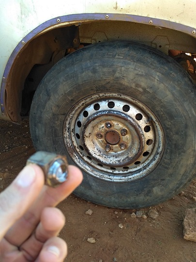 Po przejechaniu 13 km, co zajęło nam 30 minut skończył się asfalt. Wjechaliśmy na szutrową, kamienistą i bardzo nierówną drogę. Nie trzeba było długo czekać, złapaliśmy panę. Wysiedliśmy więc pośrodku niczego, a kierowca zabrał się za zmianę koła. Całkiem sprawnie mu to poszło, widać że miał wprawę. Yacool fachowym okiem inżyniera sprawdzał jakość drutów w oponie! Nie miała w ogóle bieżnika. Mało tego, opona, którą właśnie założyli wyglądała niewiele lepiej. Do tego przy dokręcaniu śrub jedną ukręcili. Yacool wziął ją sobie na pamiątkę. Jedna widać było, że została ukręcona jeszcze wcześniej. Byłam lekko przerażona, bo koło trzymało się obecnie na 3 z 5 śrub. Z wielkimi obawami wsiadłam do auta. Siedząca obok kobieta widać dojrzała moje przerażenie w oczach, bo zaczęła mnie uspokajać mówiąc, że to nic takiego i tu jest to normalne. Yacool stwierdził, że pewnie oni widzą problem dopiero jak zostanie jedna śruba.