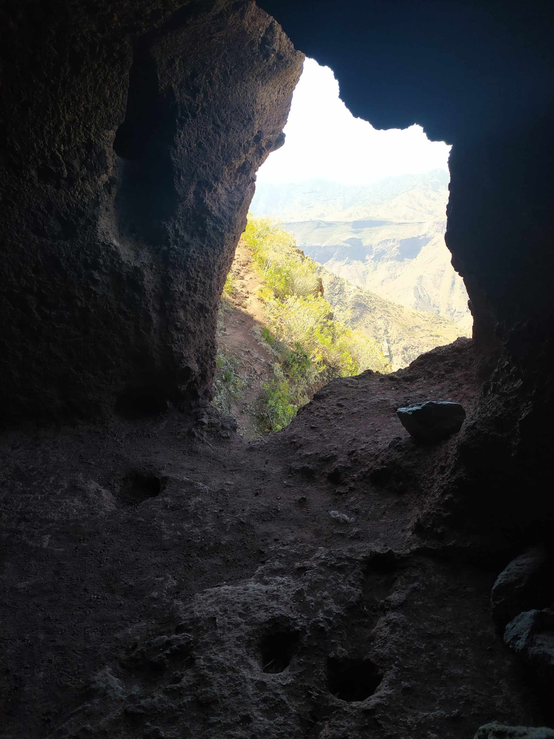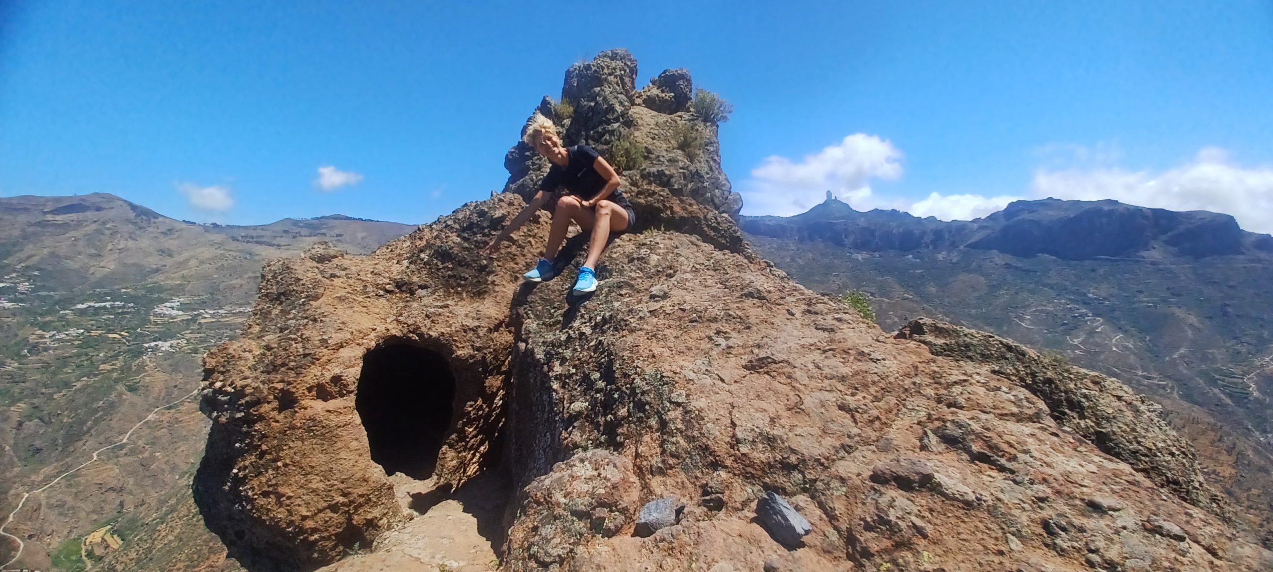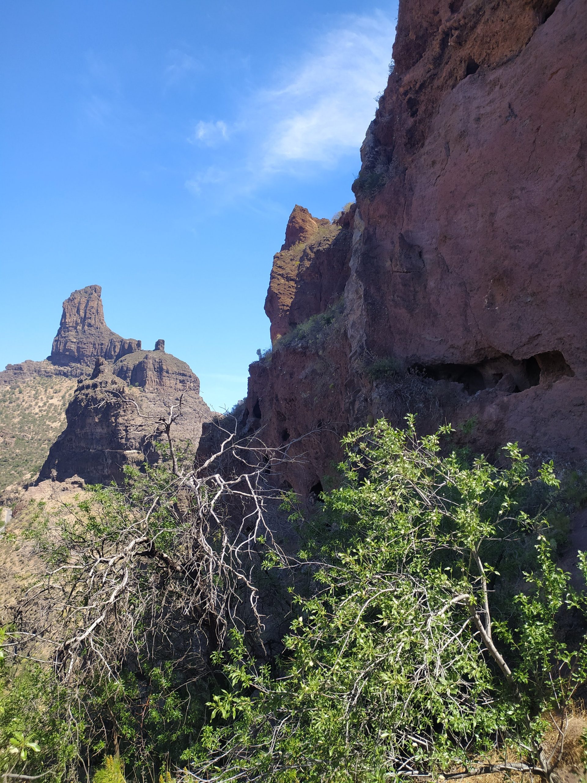 Zatrzymaliśmy się na niewielkim parkingu pod obeliskiem Roque Bentayga. W odróżnieniu od tego pod Roque Nublo tu było zupełnie pusto. Spotkaliśmy tylko jedną rodzinę. Przy parkingu jest nieduże darmowe muzeum z informacjami o tym regionie wyspy. Pracujący tam pan udzielił nam kilku wskazówek. Pod obelisk prowadzi ścieżka, w ciągu 10 minut byliśmy na górze. Przy skale znajdowały się jakby dwie nieduże płaskie półki. Podobno efekt pracy dawnych mieszkańców. Niektórzy archeologowie uważają, że było to miejsce kultu. Obok była także niewielka jaskinia. Ponoć jest ich więcej z drugiej strony skały, ale obszar ten jest niedostępny. Być może było to miejsce pochówku zmarłych.