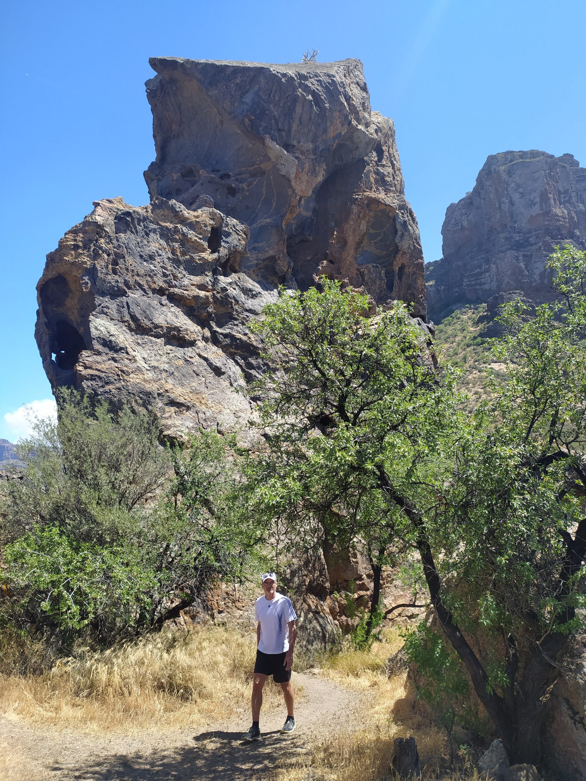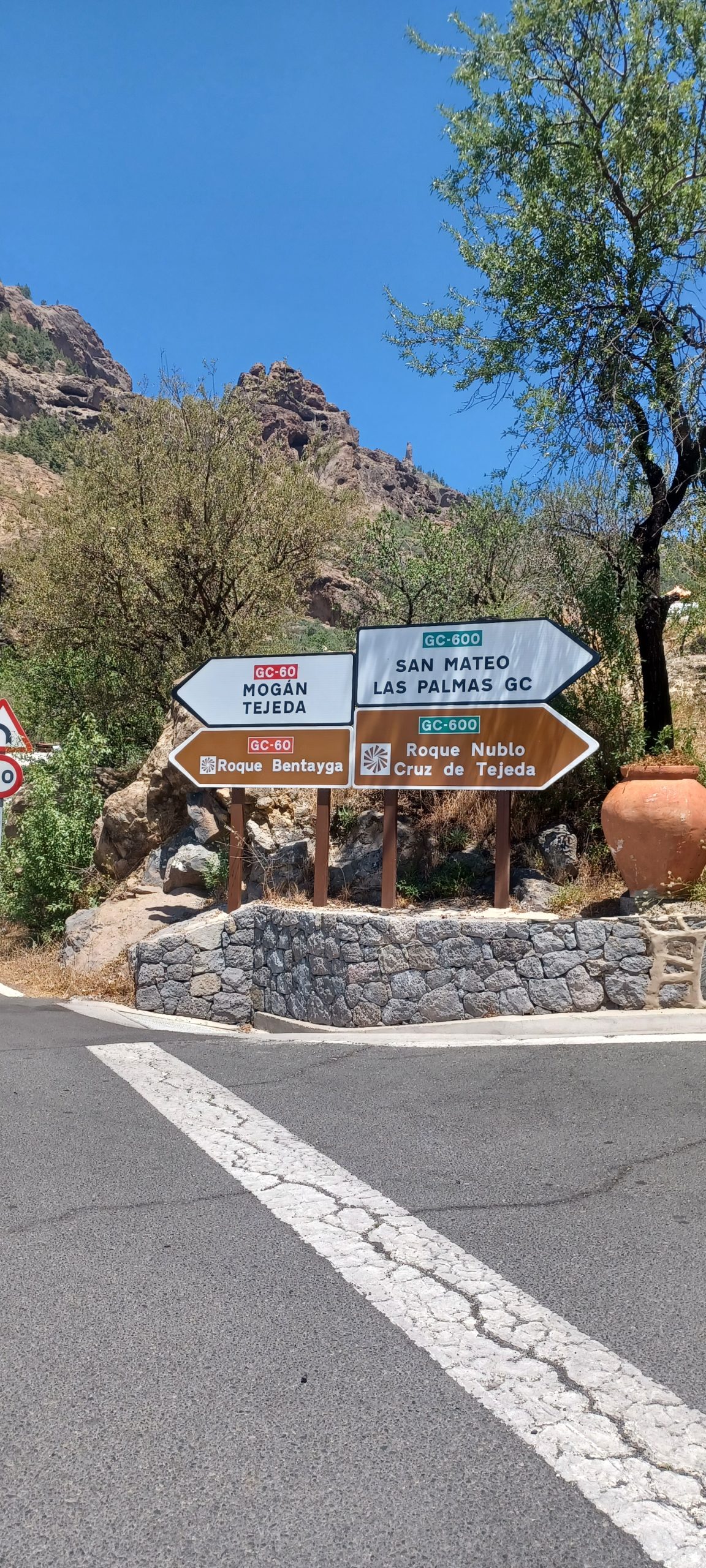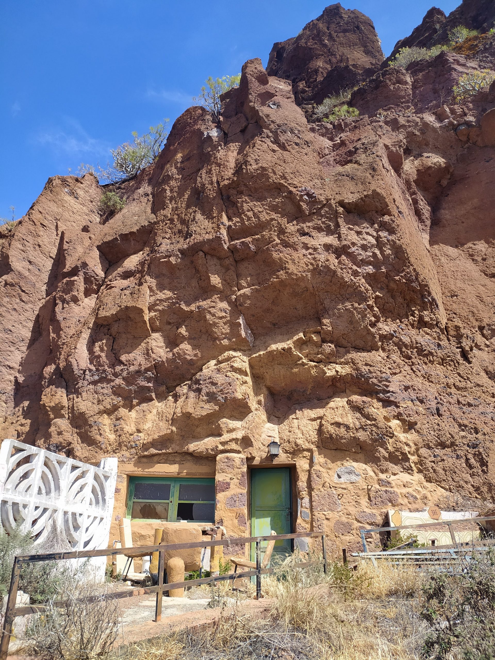 Zatrzymaliśmy się na niewielkim parkingu pod obeliskiem Roque Bentayga. W odróżnieniu od tego pod Roque Nublo tu było zupełnie pusto. Spotkaliśmy tylko jedną rodzinę. Przy parkingu jest nieduże darmowe muzeum z informacjami o tym regionie wyspy. Pracujący tam pan udzielił nam kilku wskazówek. Pod obelisk prowadzi ścieżka, w ciągu 10 minut byliśmy na górze. Przy skale znajdowały się jakby dwie nieduże płaskie półki. Podobno efekt pracy dawnych mieszkańców. Niektórzy archeologowie uważają, że było to miejsce kultu. Obok była także niewielka jaskinia. Ponoć jest ich więcej z drugiej strony skały, ale obszar ten jest niedostępny. Być może było to miejsce pochówku zmarłych.