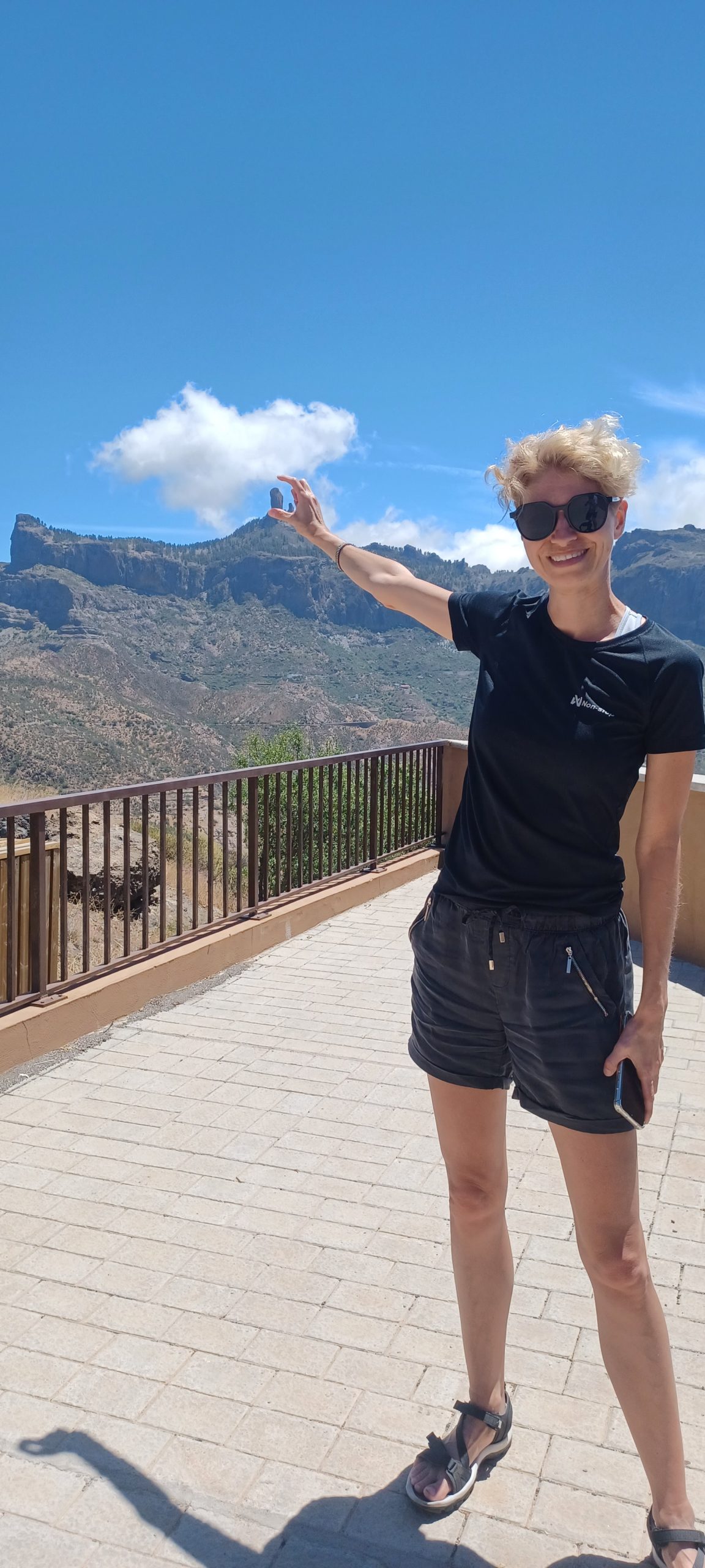 Z Maspalomas ruszyliśmy w góry. Przejechaliśmy przez punkt obserwacji gwiazd, na którym zatrzymaliśmy się poprzednim razem, potem przez miasteczka San Bartolome i Ayacata. Tu droga się rozdziela i można jechać albo w kierunku Roque Nublo albo Roque Bentayga. Tak jak ostatnio, rano patrząc w głąb wyspy kłębiły się nad nią ciężkie chmury. Trochę się bałam czy nie spotka nas deszcz i burza. Ale nic z tych rzeczy. Tak jak i poprzednio, po przejechaniu jednej z przełęczy zaświeciło piękne słońce i niebo zrobiło się błękitne. W pewnym momencie na horyzoncie pojawił się charakterystyczny stożkowaty kształt El Teide, wulkanu na Teneryfie.