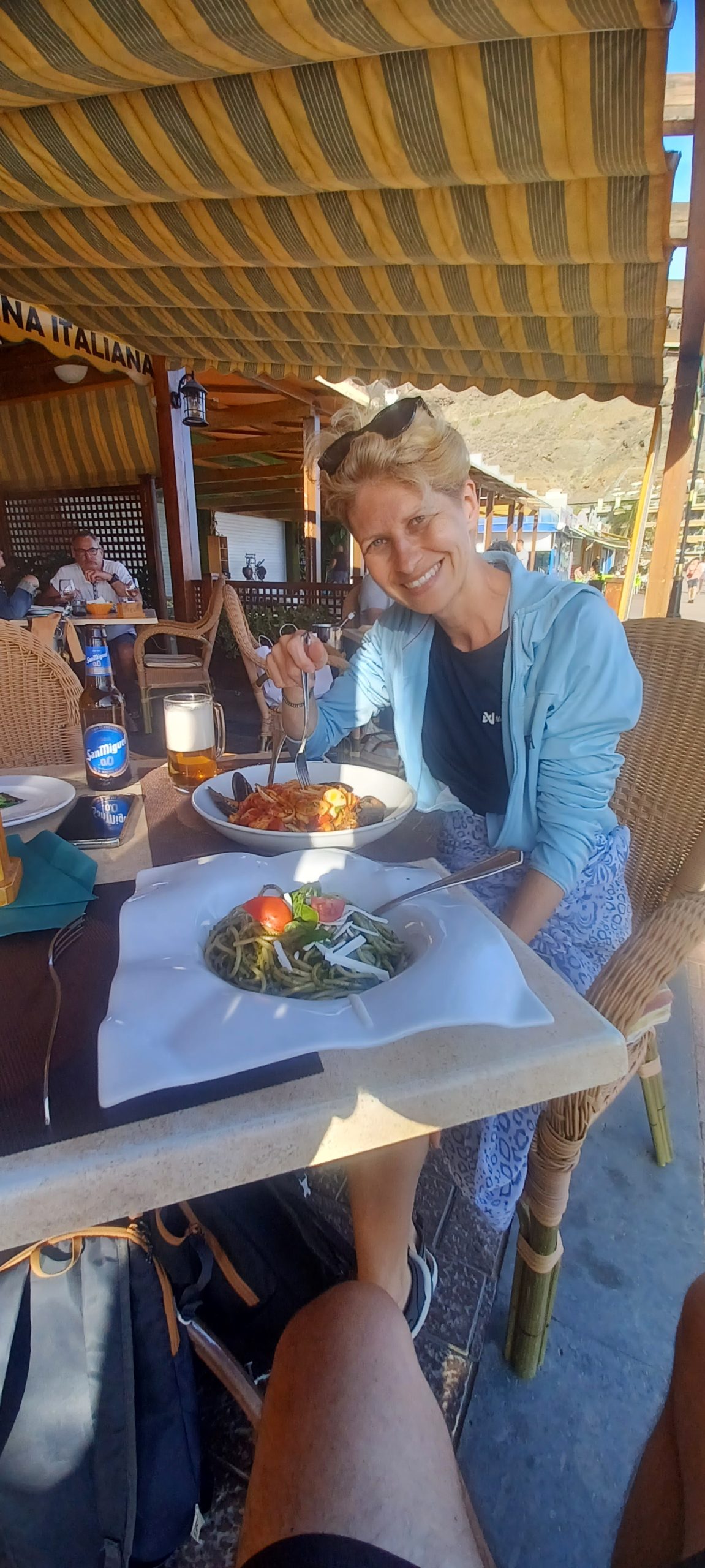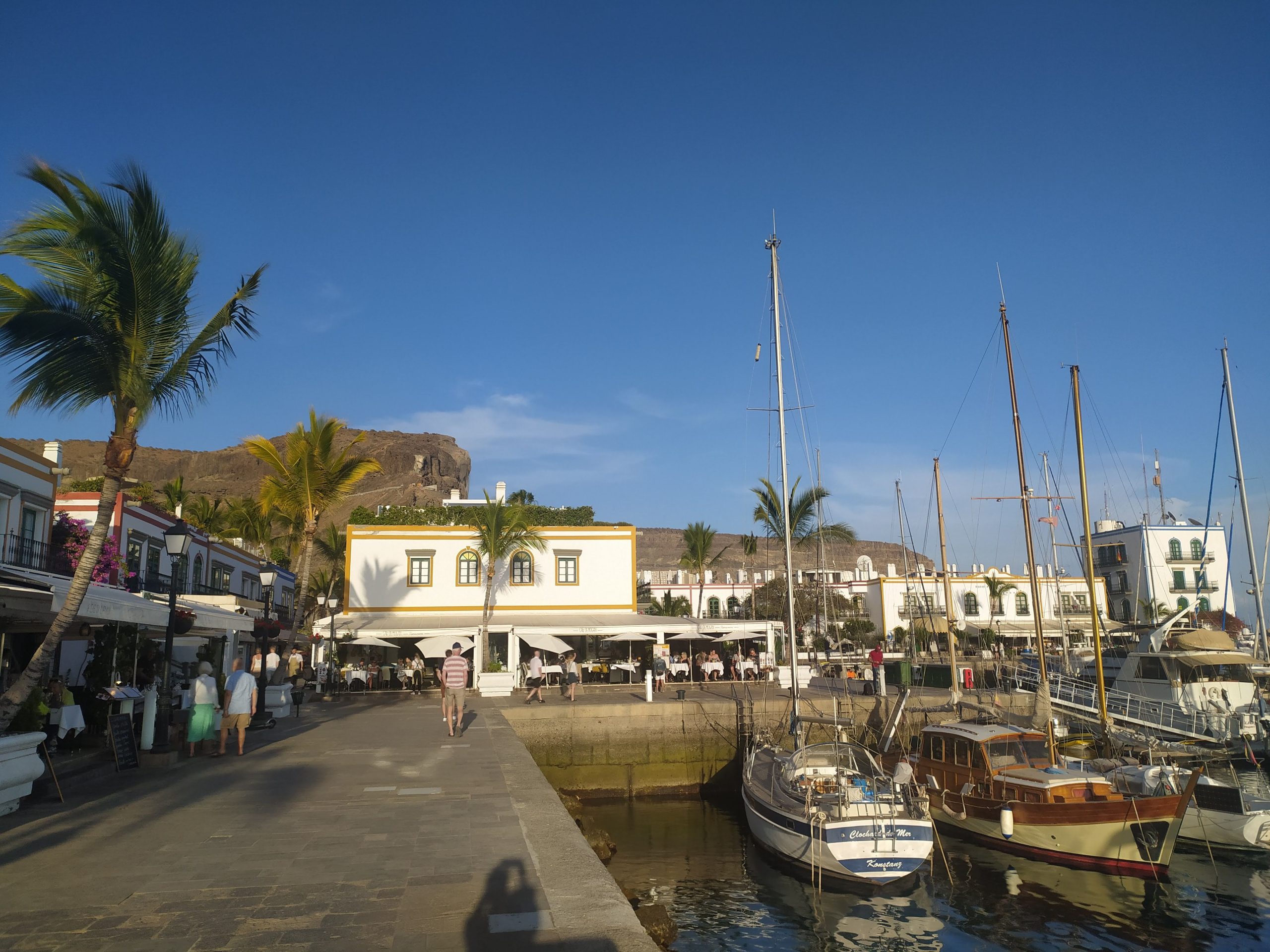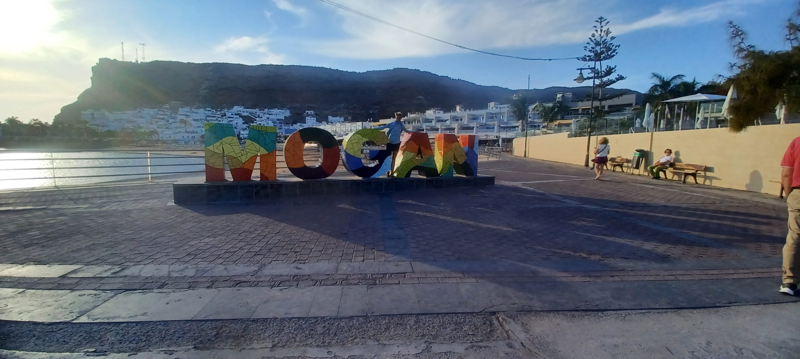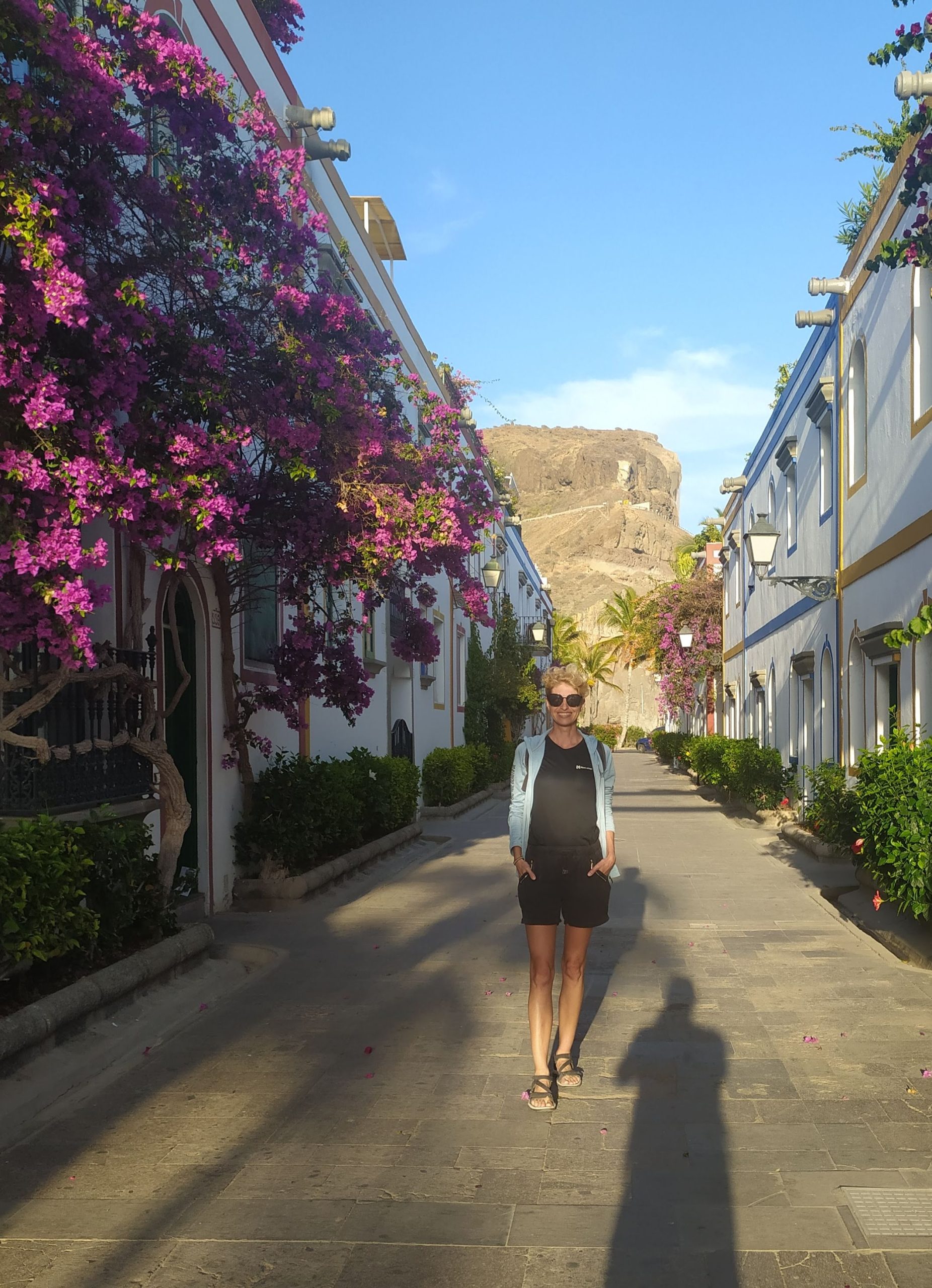 Puerto de Mogan, to przyjemne nadmorskie miasteczko, bez dużych hoteli, za to całe w kwiatach. Była też marina z wieloma jachtami. Knajpy pełne turystów ,na plaży też sporo ludzi. Położyliśmy się dosłownie na chwilę, gdy słońce zaczęło zachodzić za wzgórze szybko robiło się chłodno.