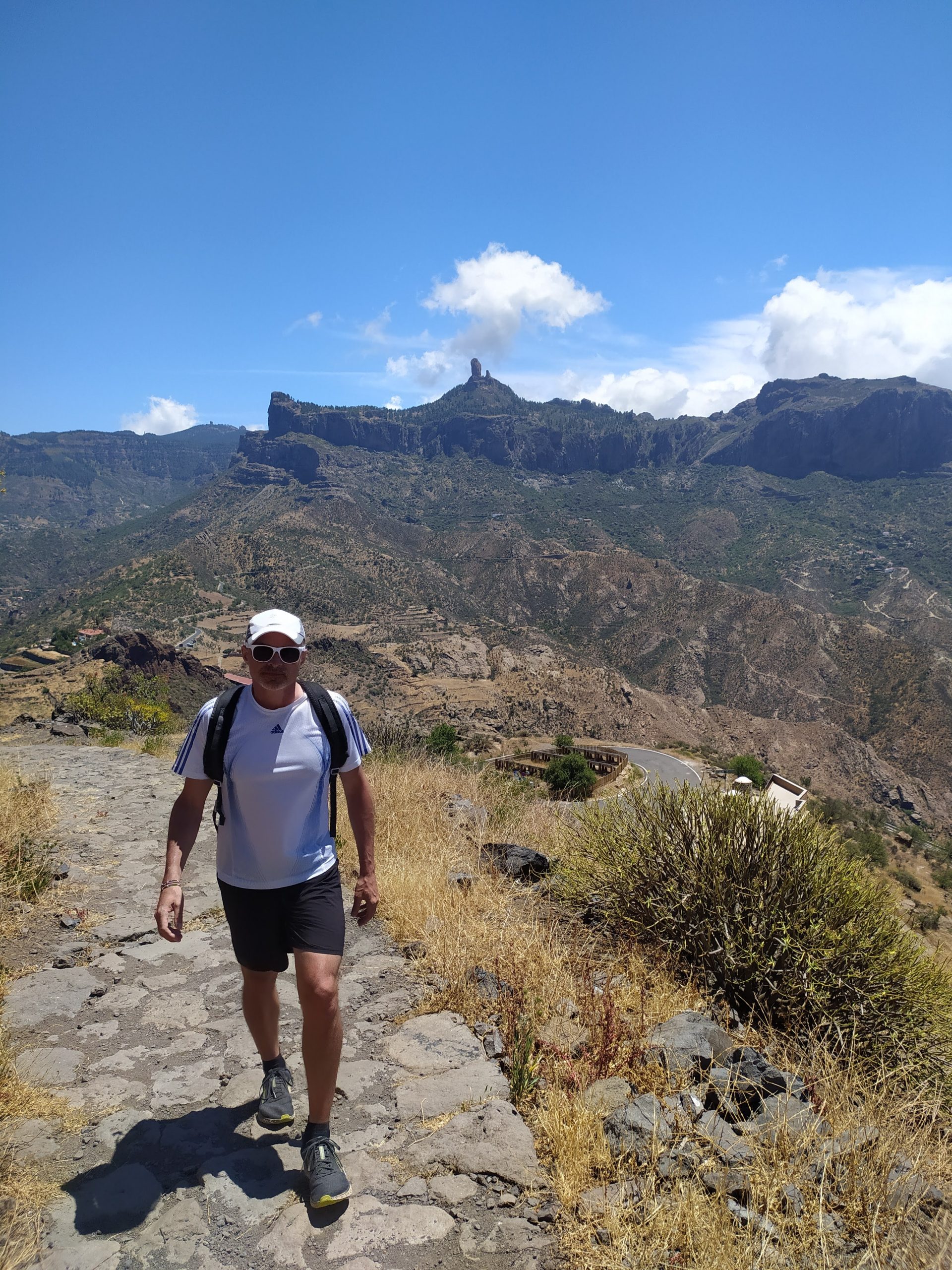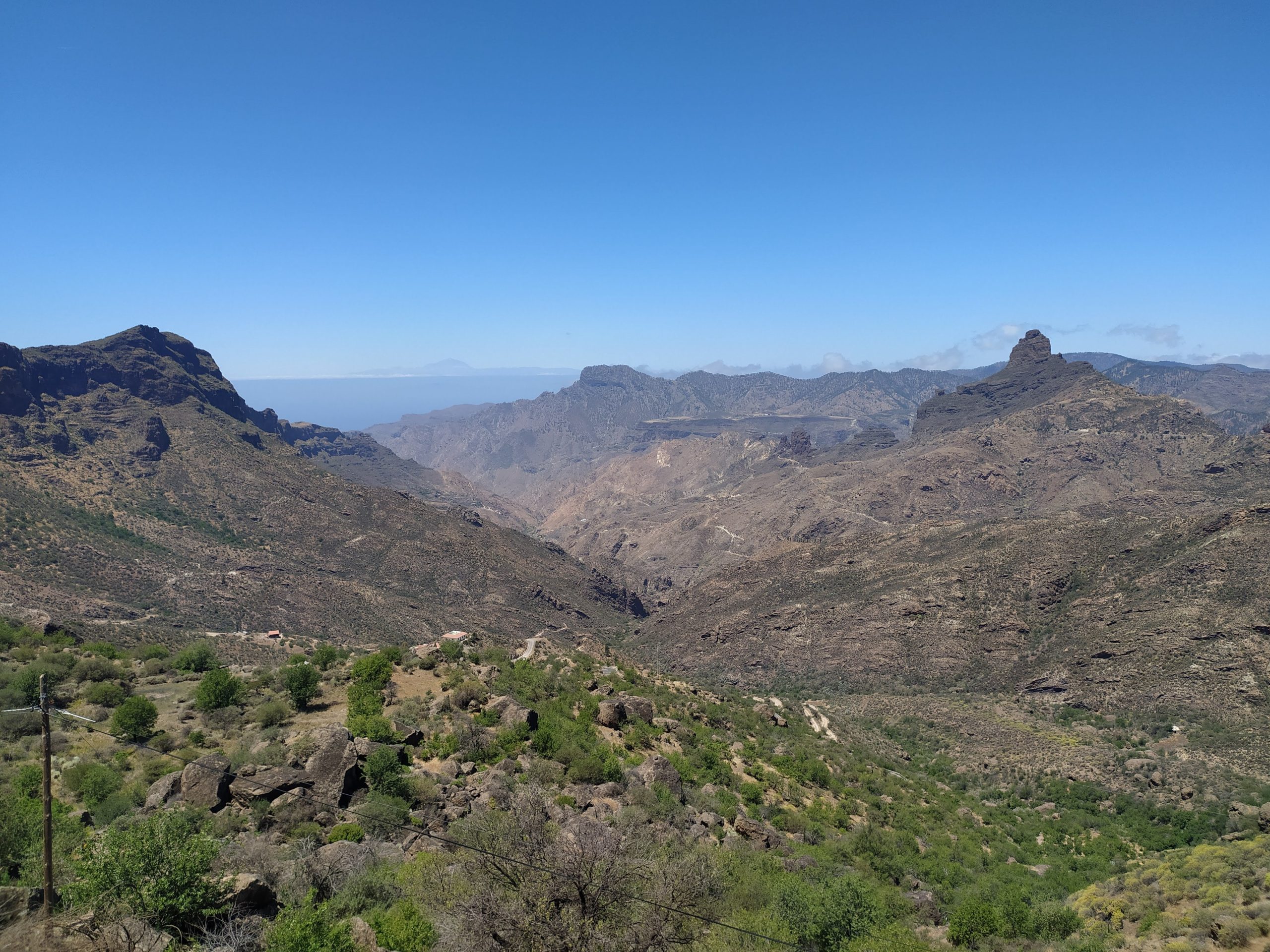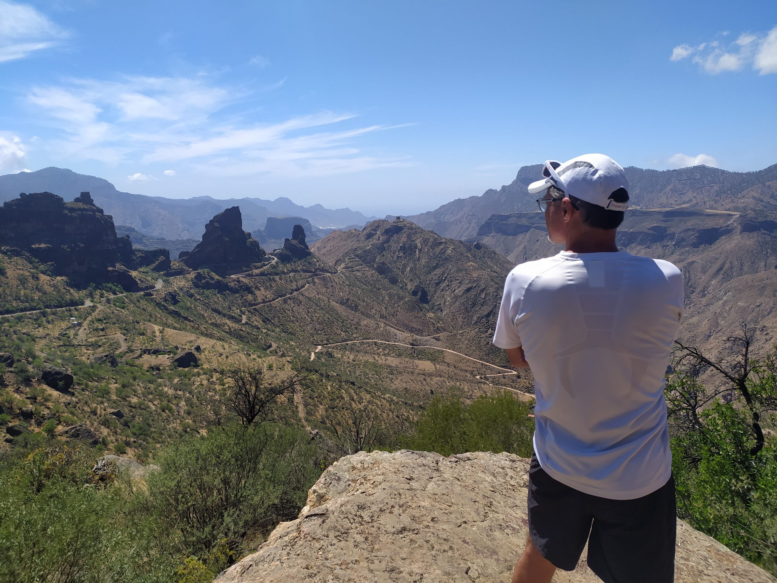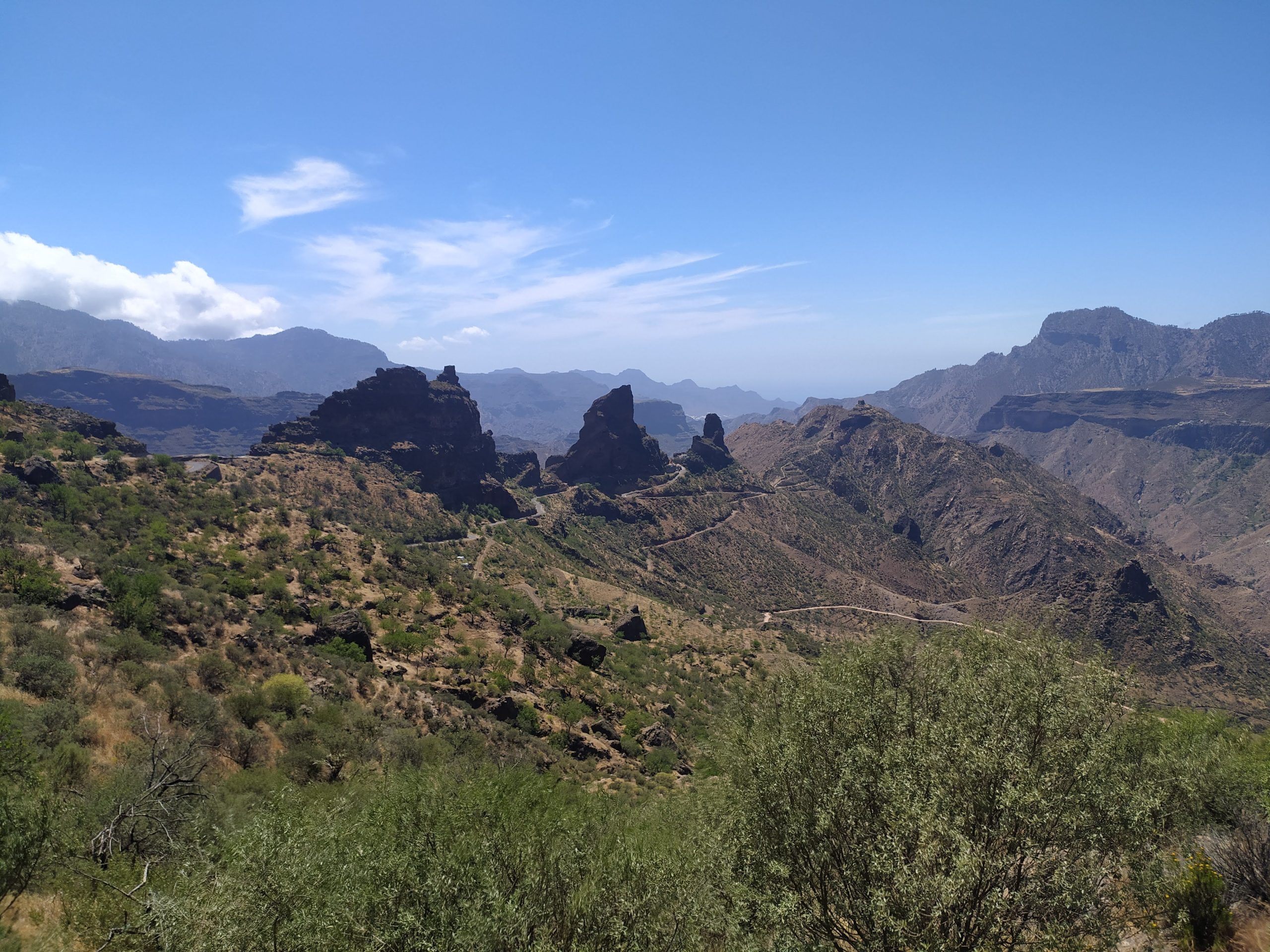 Widoki z góry super! Jak na dłoni widać było cele naszych wcześniejszych wypraw, Roque Nublo i Pico de las Nieves. Zbocza gór poprzecinane były zygzakami dróg i szlaków. Z pewnością jest tu mnóstwo dróg do przejścia. Choć przyjemniej by było w mniejszym upale niż dziś.