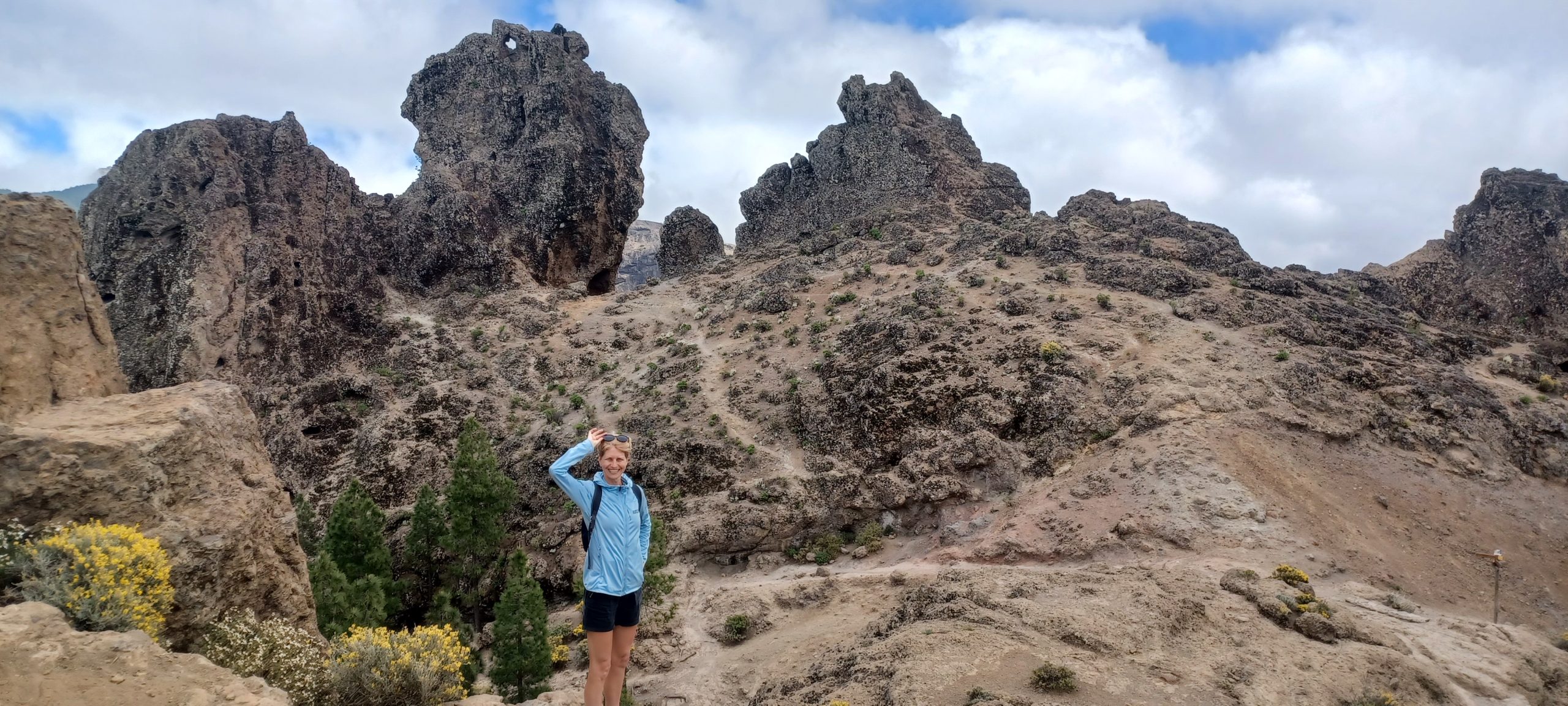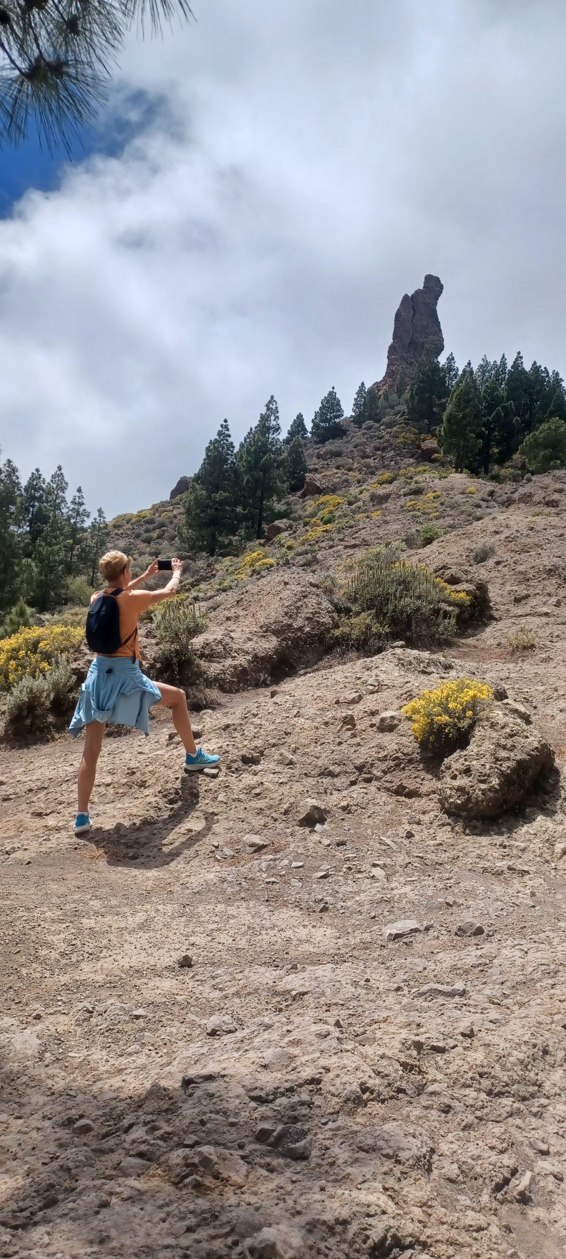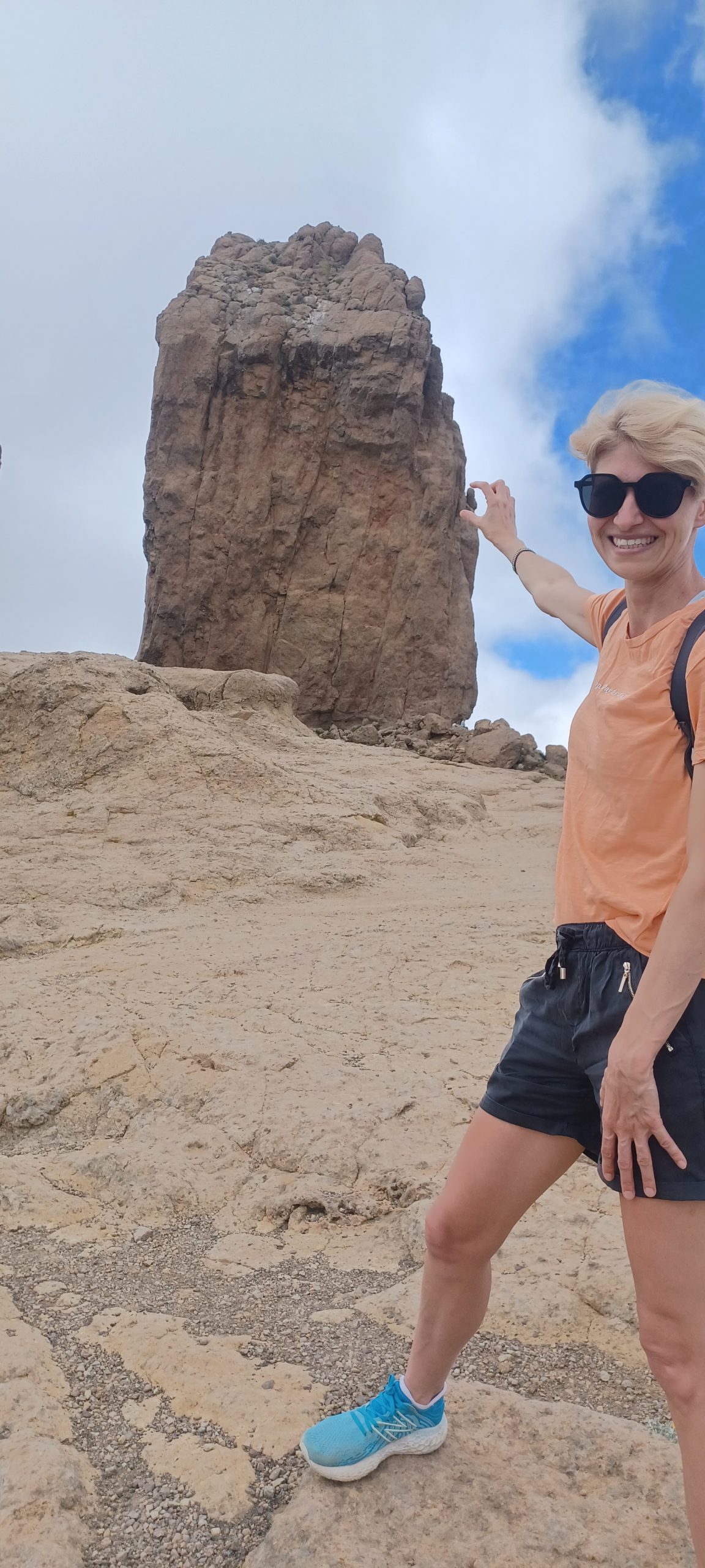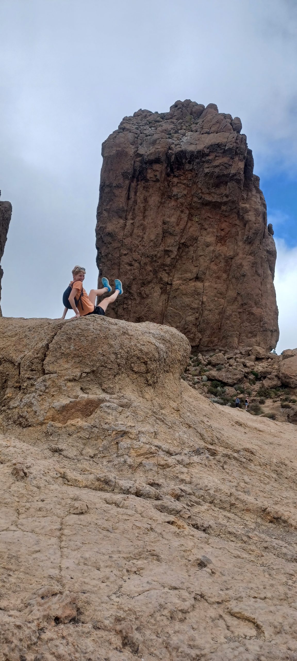 Pogoda była dość niepewna. Na niebie kłębiły się chmury, ale po przekroczeniu jednej z przełęczy nagle pojawiło się słońce i niebieskie niebo. Dotarliśmy na parking pod Roque Nublo. Z tej perspektywy droga do niego nie wydawała się zbyt długa. Sam głaz także nie wydawał się, aż tak wielki. Roque Nublo to drugi najwyższy szczyt wyspy – 1813 m n.p.m. Sam obelisk ma 80 metrów wysokości, jest jednym z największych wulkanicznych obelisków na świecie i przez pierwotnych mieszkańców Gran Canarii uważany był za święty. Po drodze minęliśmy inną skałę „Mnicha”, faktycznie z odpowiedniej perspektywy przypomina jego postać. Po pełnej zachwytów wspinaczce weszliśmy na płaskowyż z obeliskiem. Obok niego jest też druga skała – „żaba”. Roque z bliska robi mega wrażenie, faktycznie coś w nim jest. Długo siedzieliśmy pod nim robiąc sesje zdjęciowe na różne sposoby. Panuje tam dobry klimat, by przyjść i po prostu sobie posiedzieć. Wykorzystaliśmy w pełni okienko pogodowe, gdy zeszliśmy na parking skałę zasłoniły chmury.