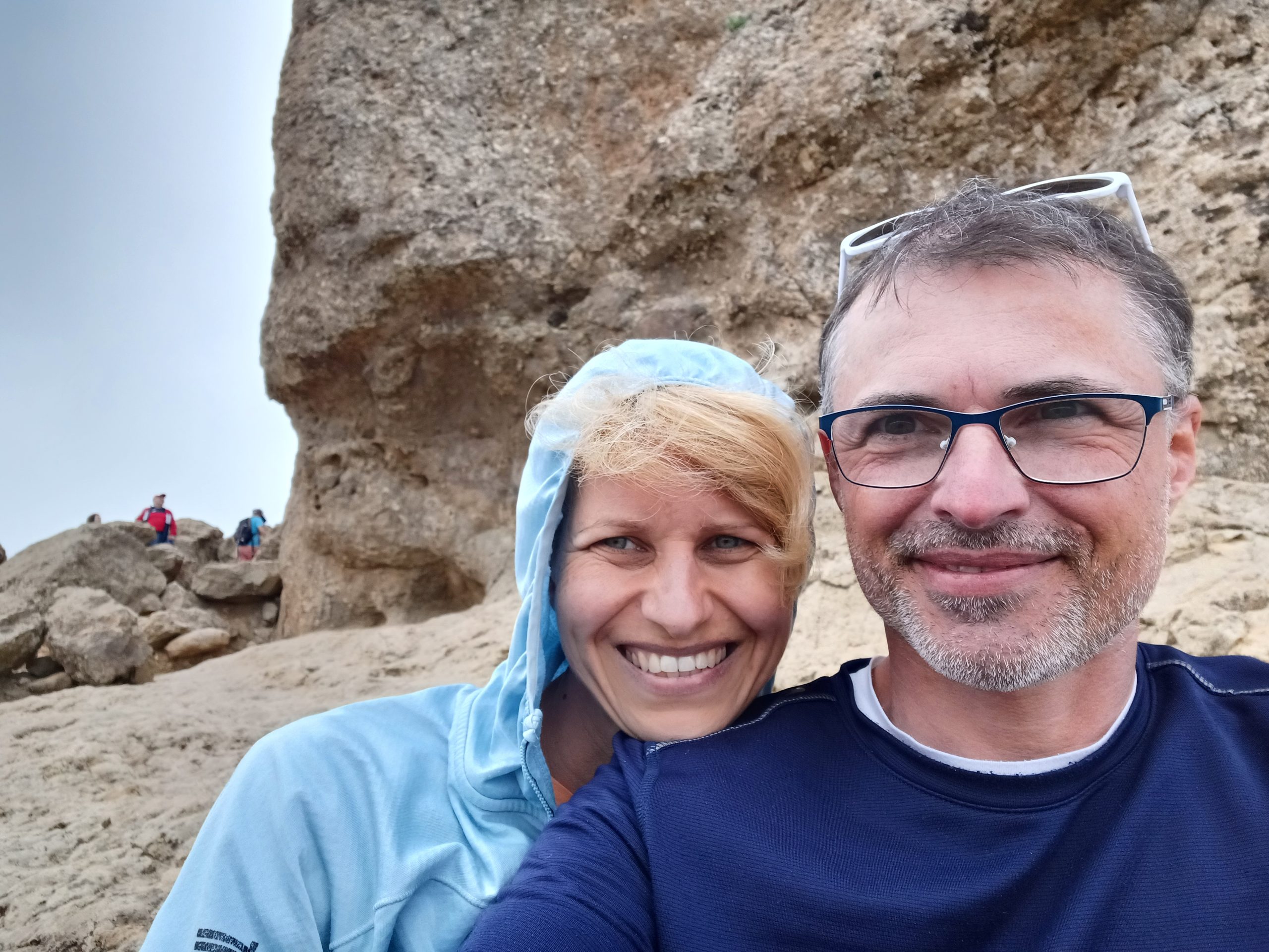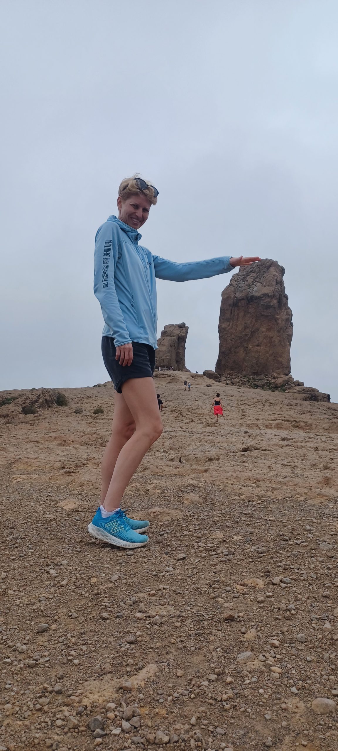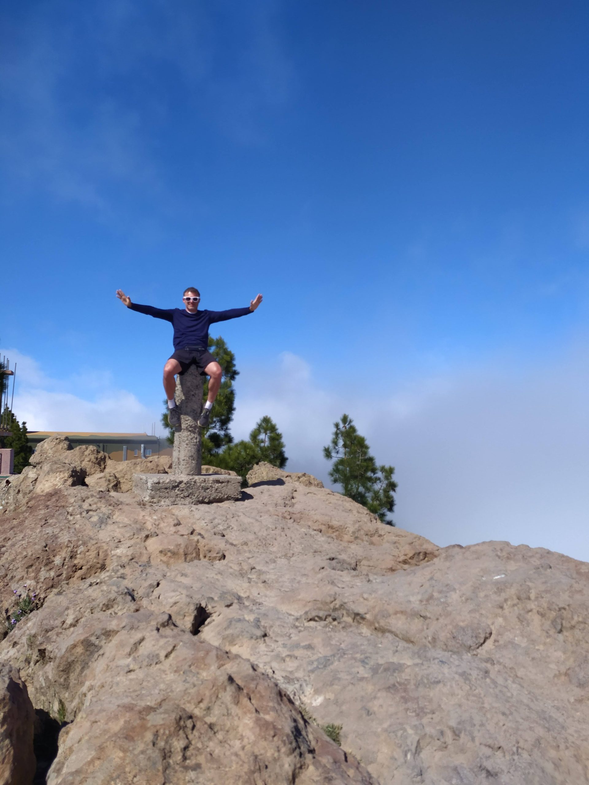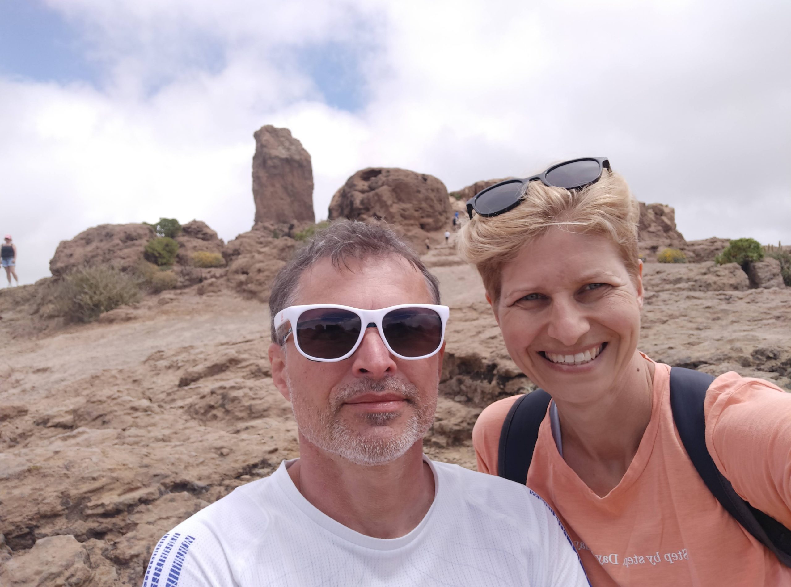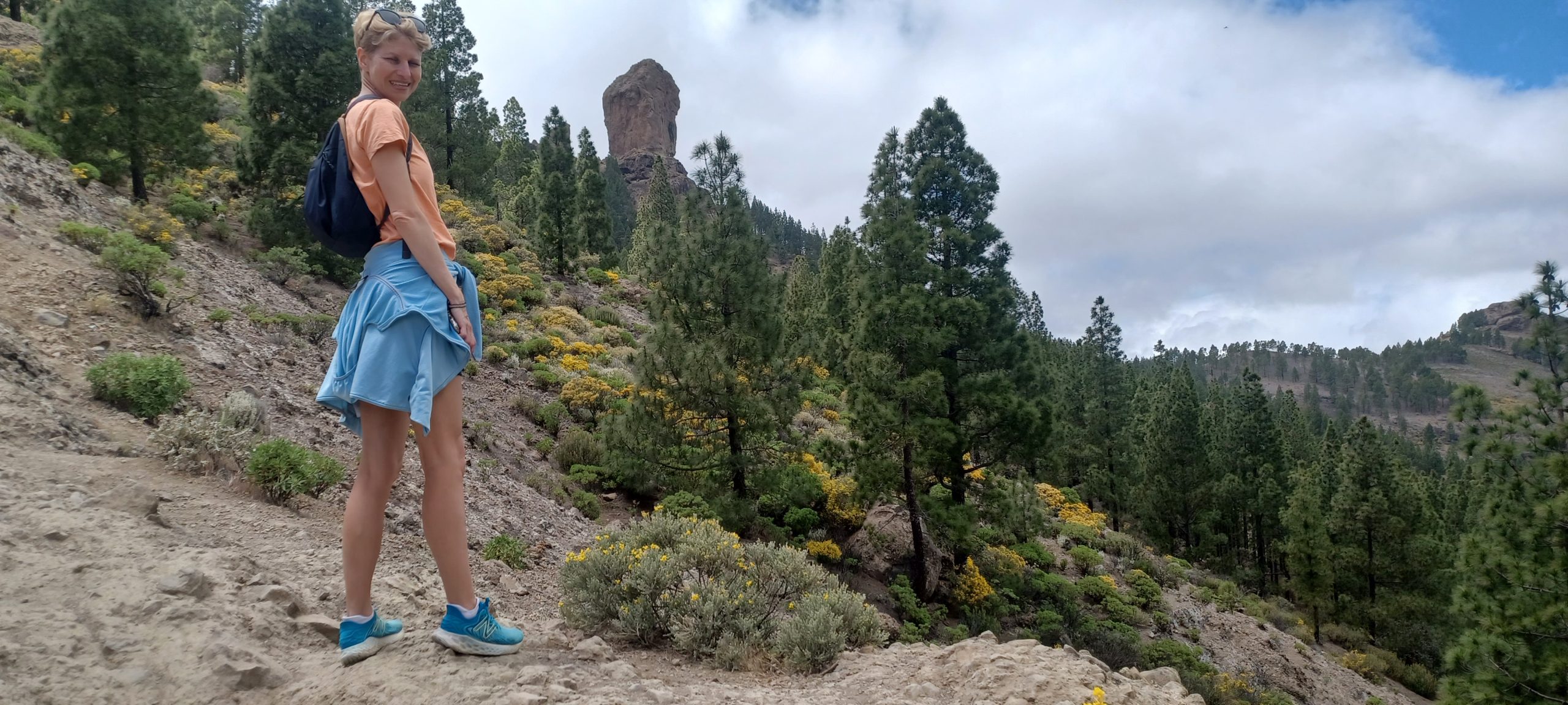 Pogoda była dość niepewna. Na niebie kłębiły się chmury, ale po przekroczeniu jednej z przełęczy nagle pojawiło się słońce i niebieskie niebo. Dotarliśmy na parking pod Roque Nublo. Z tej perspektywy droga do niego nie wydawała się zbyt długa. Sam głaz także nie wydawał się, aż tak wielki. Roque Nublo to drugi najwyższy szczyt wyspy – 1813 m n.p.m. Sam obelisk ma 80 metrów wysokości, jest jednym z największych wulkanicznych obelisków na świecie i przez pierwotnych mieszkańców Gran Canarii uważany był za święty. Po drodze minęliśmy inną skałę „Mnicha”, faktycznie z odpowiedniej perspektywy przypomina jego postać. Po pełnej zachwytów wspinaczce weszliśmy na płaskowyż z obeliskiem. Obok niego jest też druga skała – „żaba”. Roque z bliska robi mega wrażenie, faktycznie coś w nim jest. Długo siedzieliśmy pod nim robiąc sesje zdjęciowe na różne sposoby. Panuje tam dobry klimat, by przyjść i po prostu sobie posiedzieć. Wykorzystaliśmy w pełni okienko pogodowe, gdy zeszliśmy na parking skałę zasłoniły chmury.