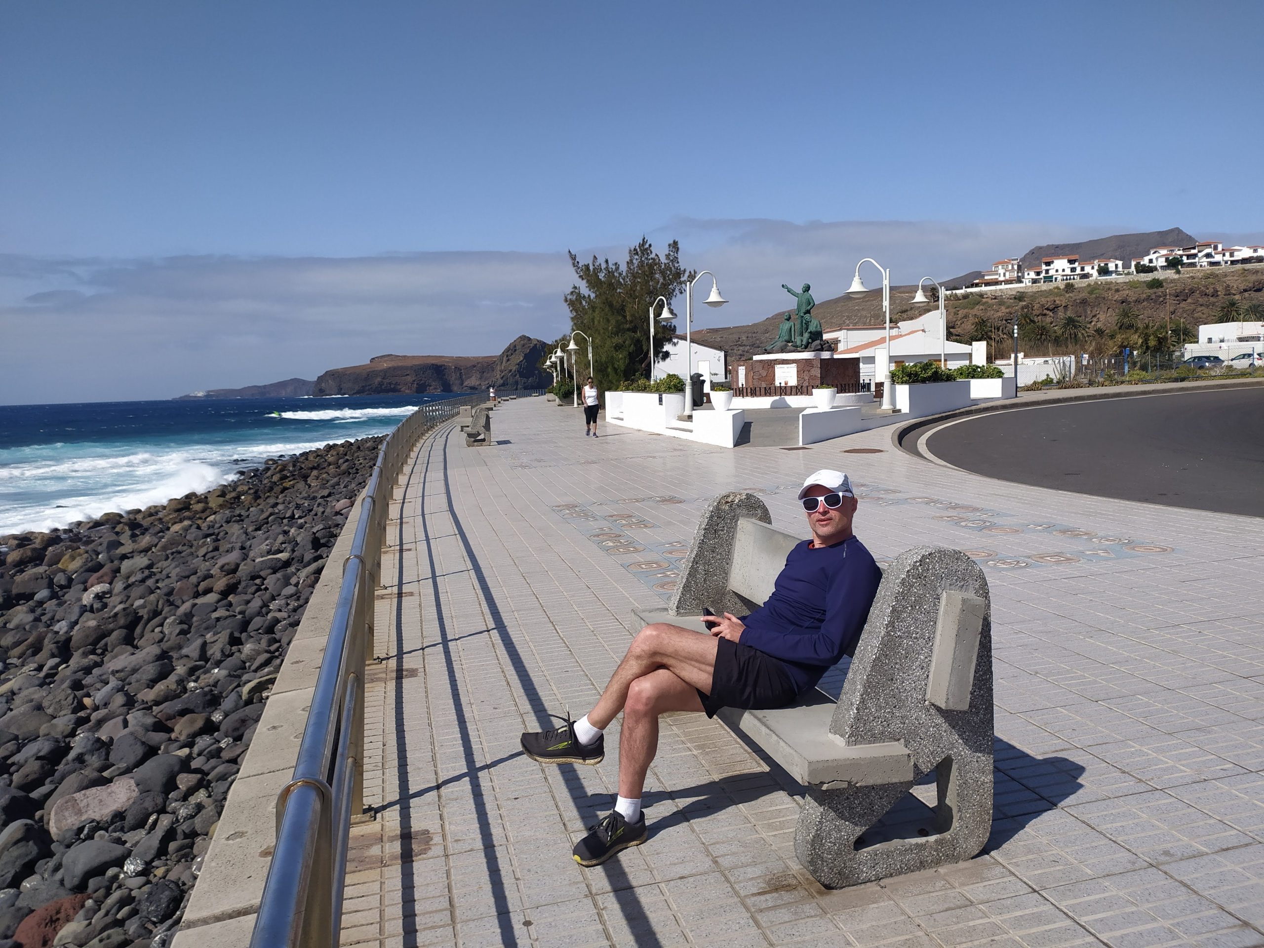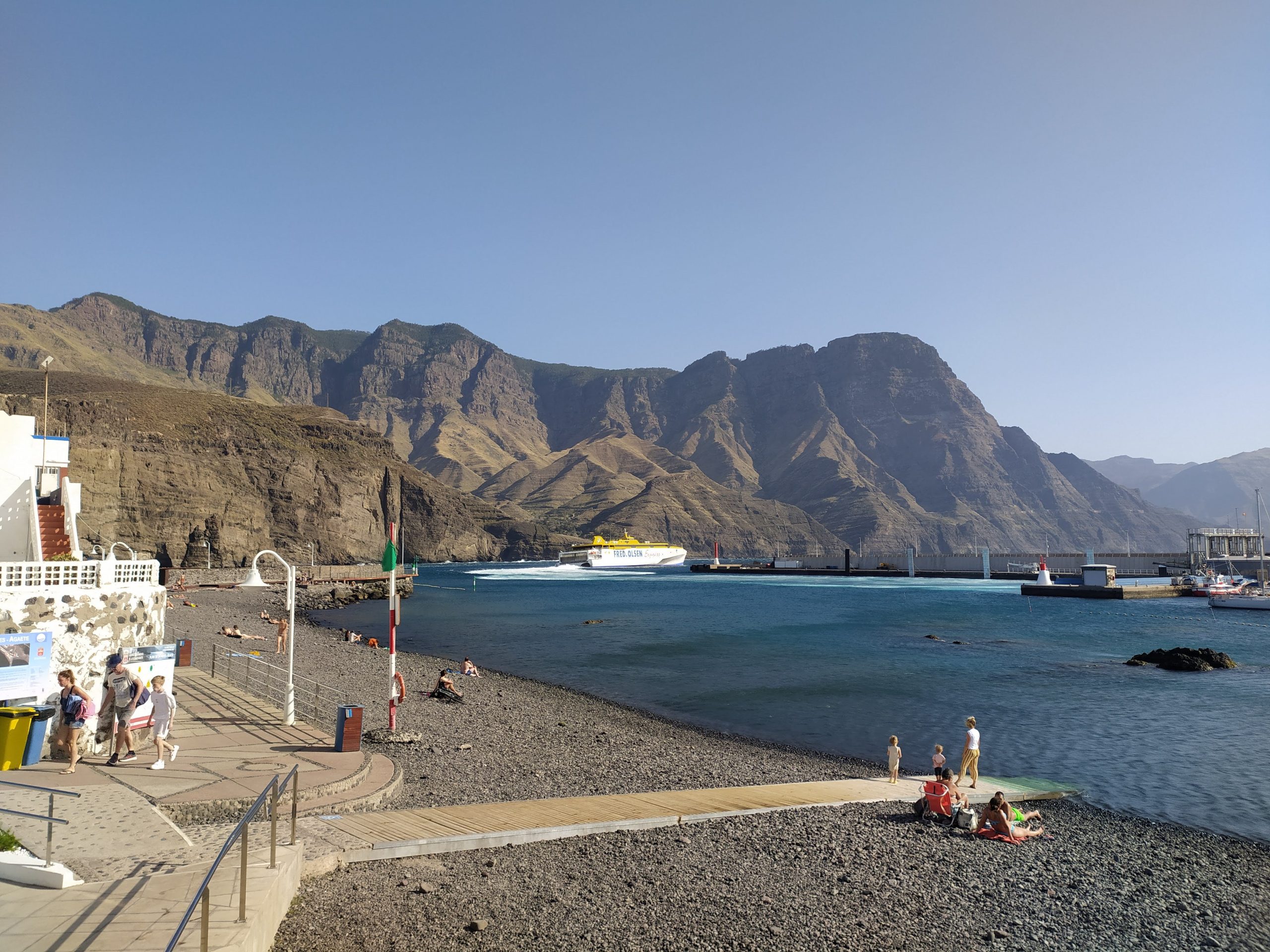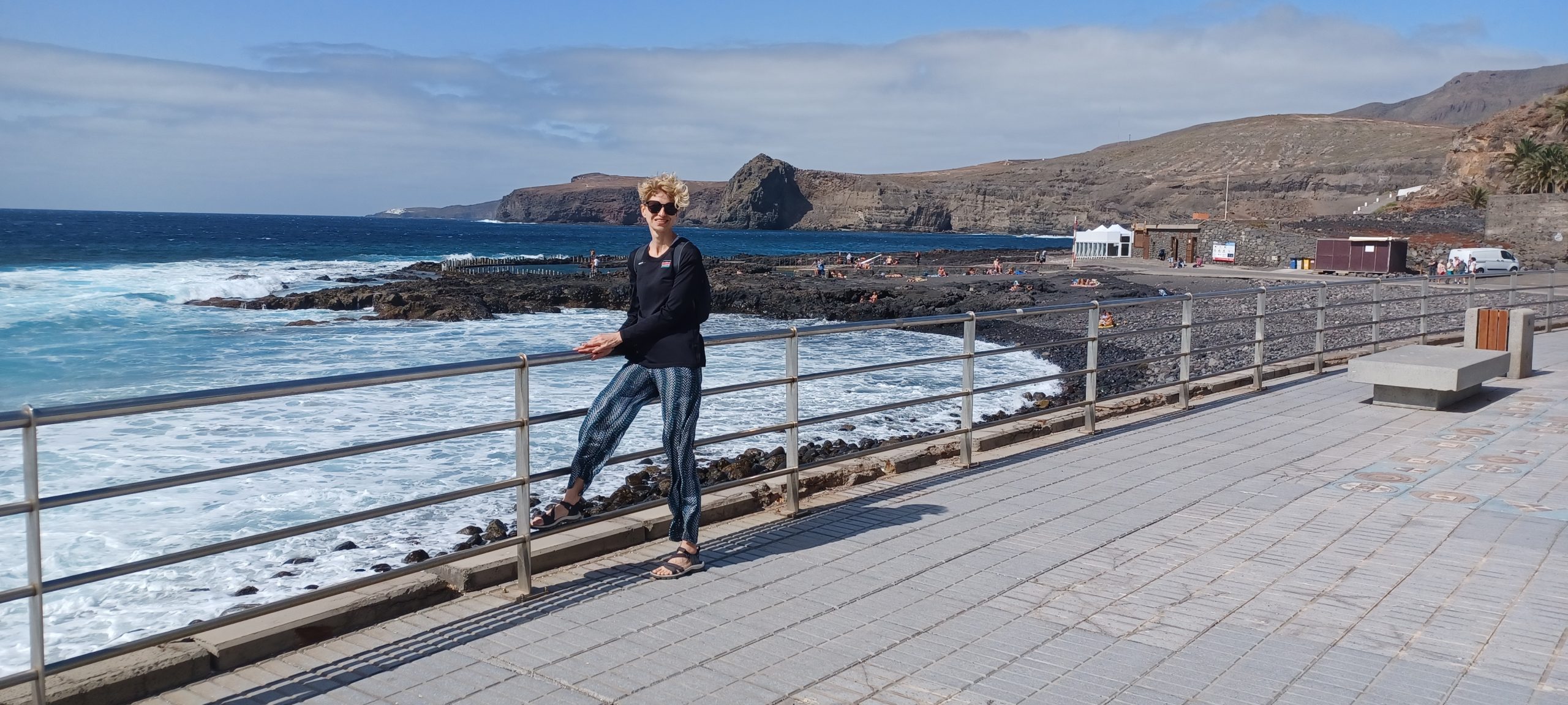 Im bardziej na zachód, tym robiło się górzyściej i zielono. Wyszło też słońce i mocno grzało przez szybę auta. Dojechaliśmy do Agaete i legliśmy na czarnej kamienistej plaży. W końcu chwila na odpoczynek. Wiatr mocno wiał od oceanu, olbrzymie fale uderzały o brzeg. Przeszliśmy do zatoki z portem, akurat odpływał prom na którąś z sąsiednich wysp. Większość miasteczka jakby wymarła, dopiero szykuje się do sezonu. Fajny termin na taką podróż.
