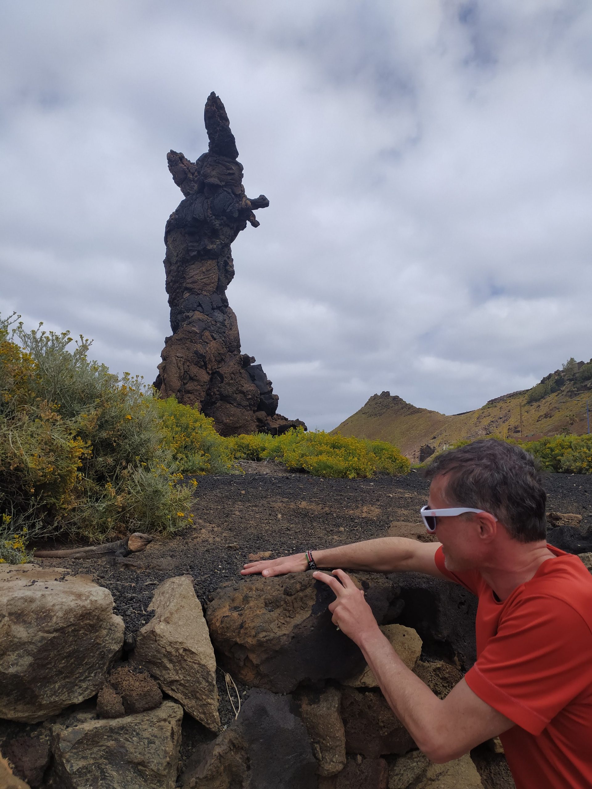 Najedzeni ruszyliśmy w kierunku zachodniej części wyspy, gdzie będziemy mieszkać. Przy autostradzie stała duża rzeźba z kamieni. Na chwilę się przy niej zatrzymaliśmy. Niemal dostałam zawału, gdy zastanawiając się co przedstawia nagle zobaczyłam wielkie jaszczurki, tuż obok nas! Wiedziałam, że na Gran Canarii żyją legwany (chyba to były one), ale nie spodziewałam się ich tu spotkać.