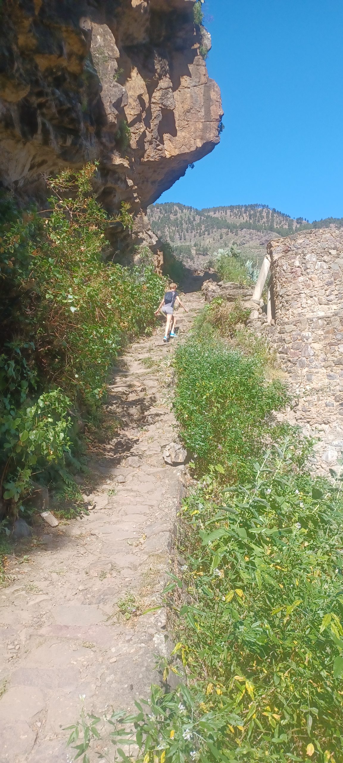 Po śniadaniu podjechaliśmy autem na koniec drogi, którą już wczoraj sprawdziliśmy pod kątem dzisiejszej wyprawy. Zaparkowaliśmy w małej zatoczce i zgodnie ze strzałką weszliśmy na szlak. Od samego początku trasa była stroma, a ścieżka wąska i kamienista. Minęliśmy pojedyncze zabudowania wspinając się coraz wyżej. Po około 40 min marszu doszliśmy do schroniska Refugio el Hornillo. W budynku znajduje się bar i mały pensjonat. Właściciel powiedział, że niestety teraz mają wakacje i obiekt jest zamknięty. Pozwolił mi zajrzeć do środka – miejsce wyglądało bardzo fajnie, gdyby ktoś chciał tu przenocować i stąd mieć bazę wypadową na chodzenie po górach.