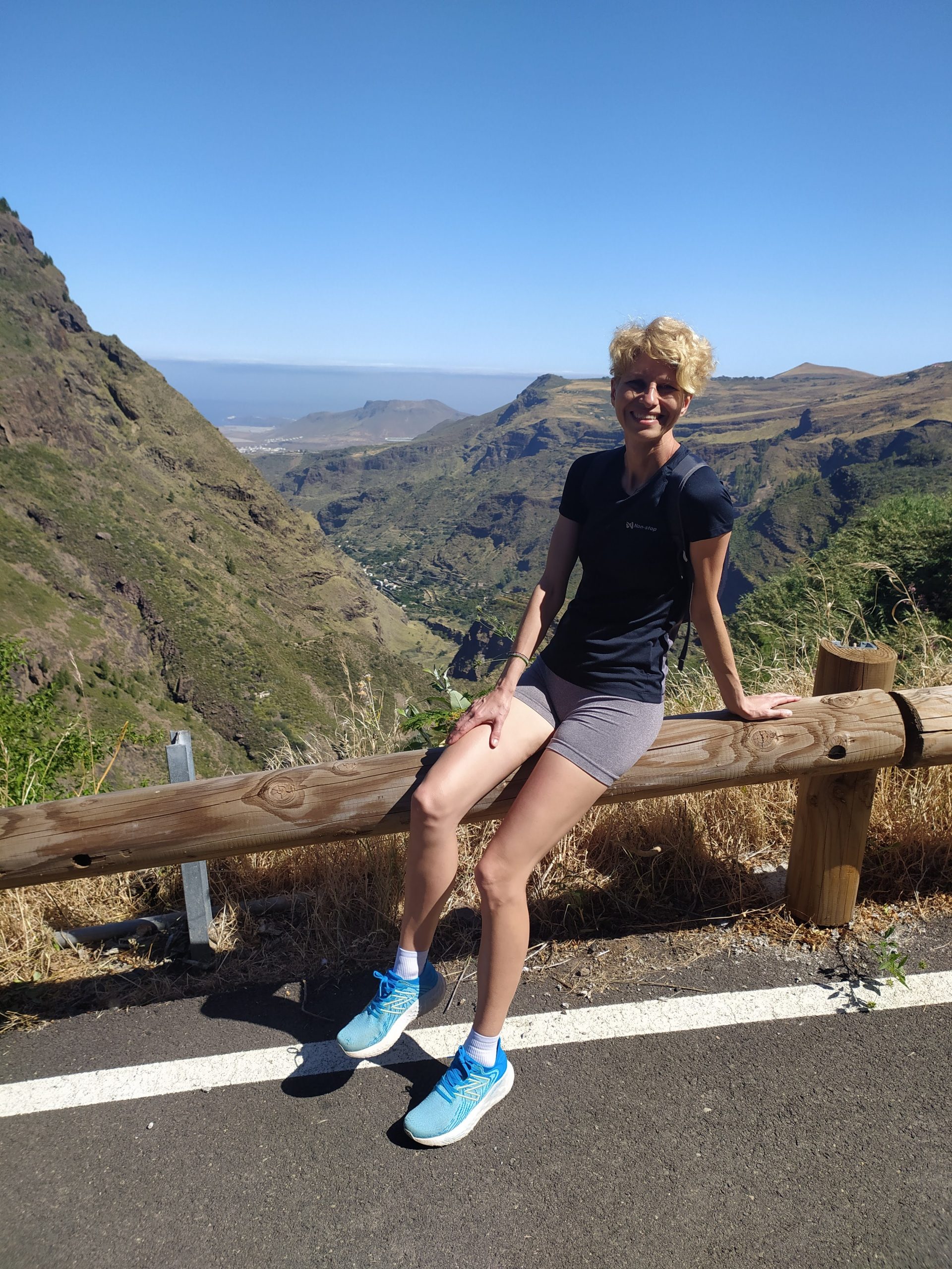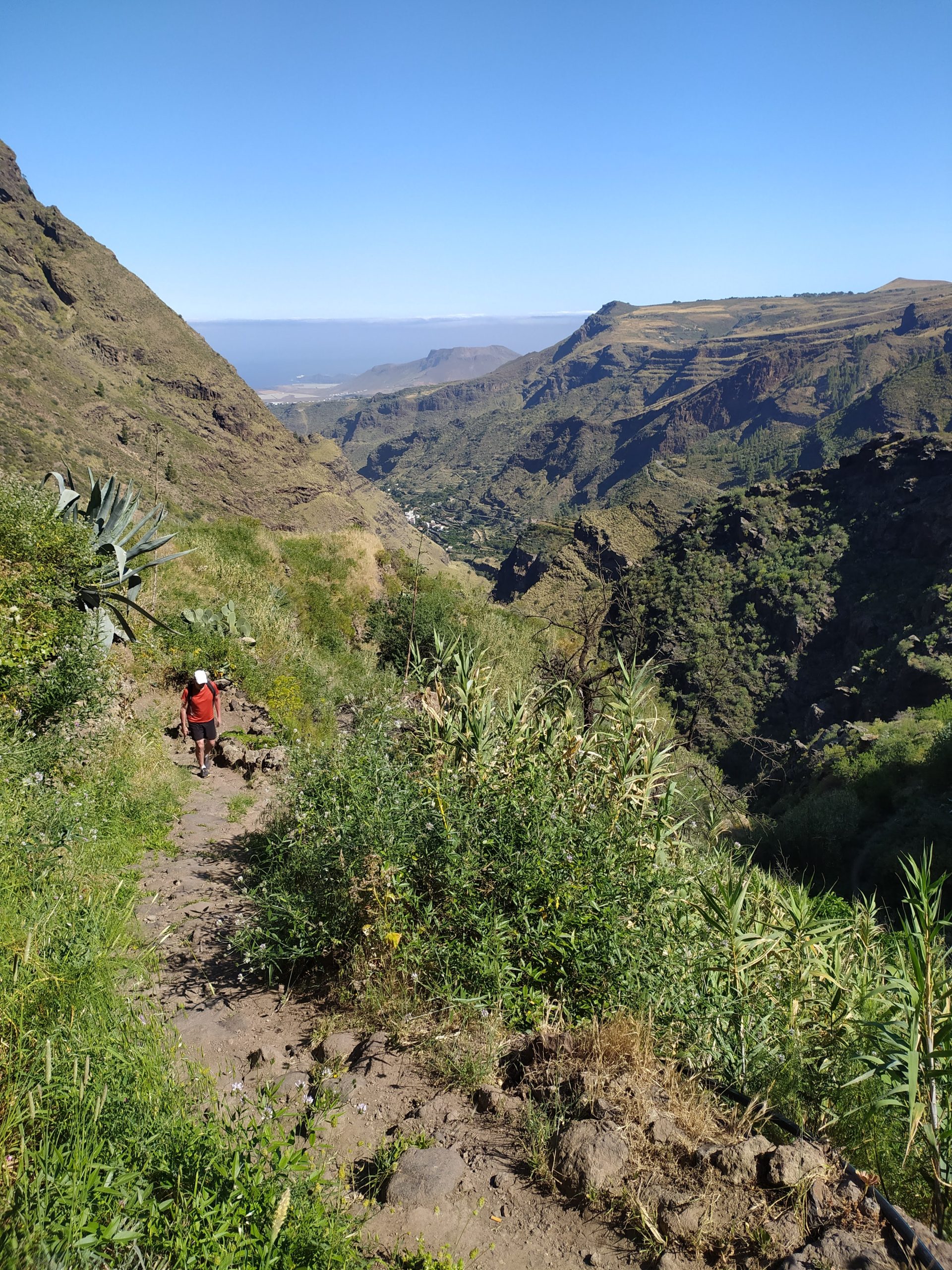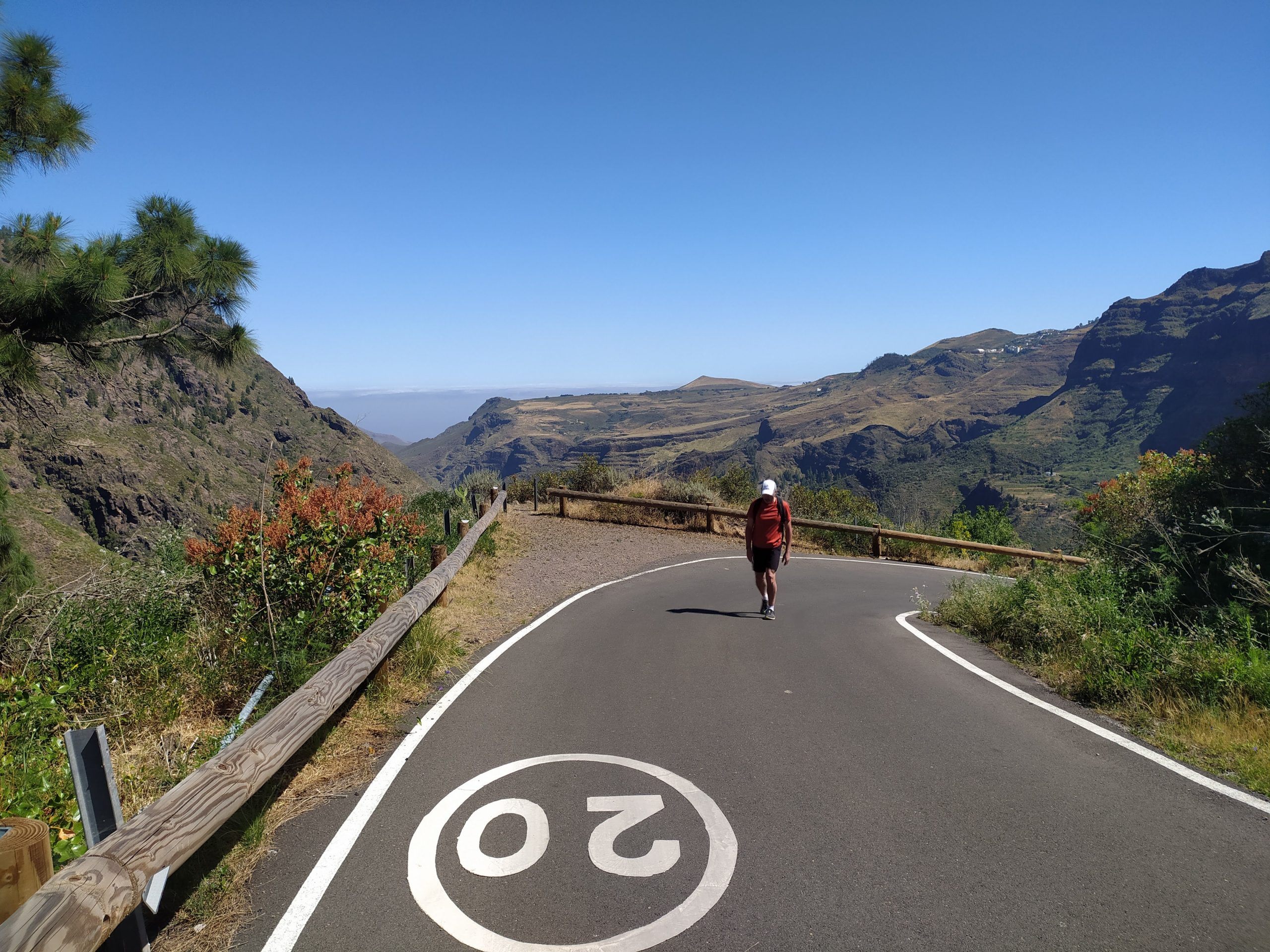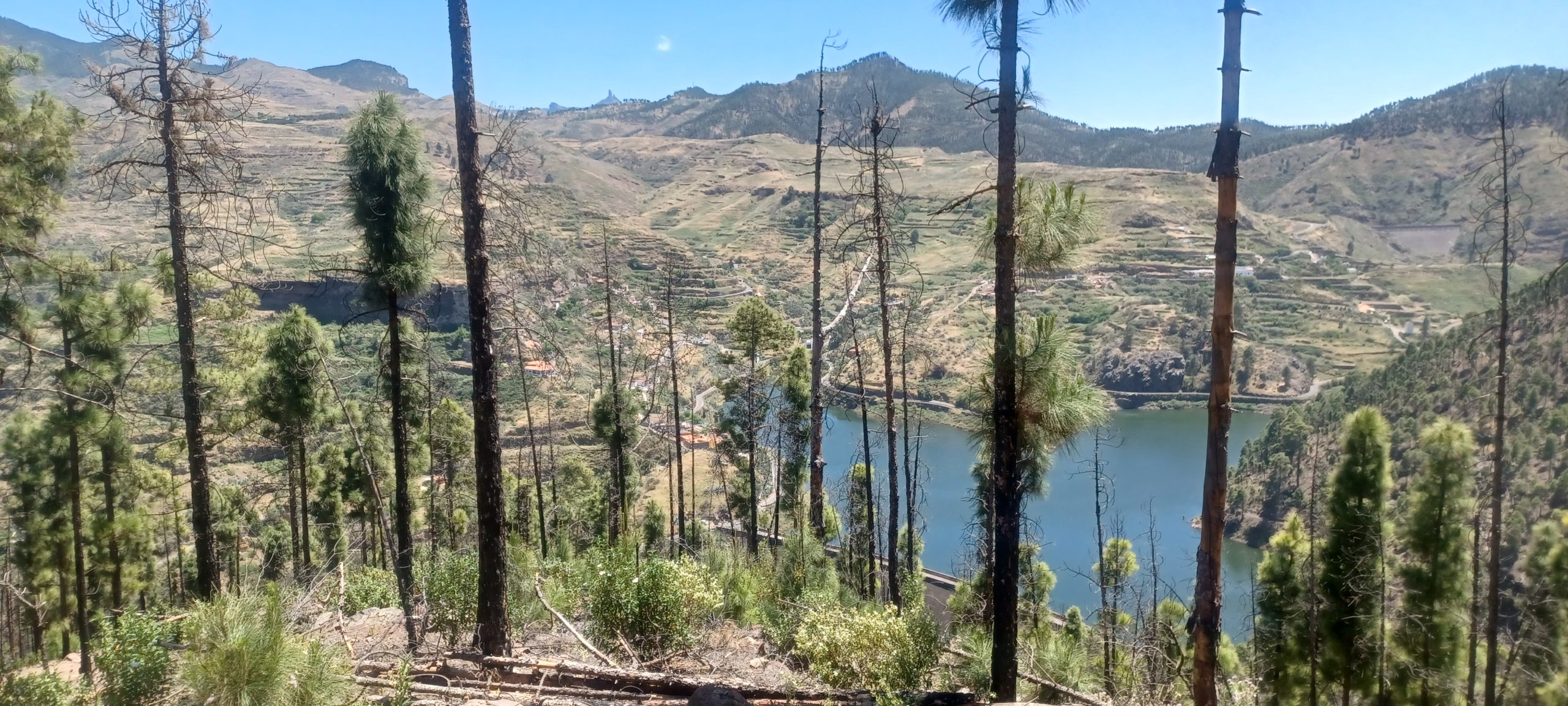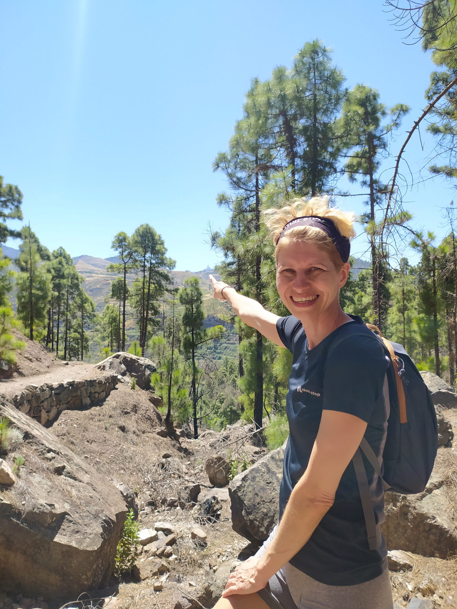 Odpoczęliśmy trochę i ruszyliśmy w drogę powrotną. Las był bardzo rzadki, głównie iglasty, nie dawał cienia. W sumie pokonaliśmy ok 850 m pod górę, z postojami w 3,5h, w dół zeszliśmy w godzinę krócej. Mimo mniejszego przewyższenia niż w wejściu na wulkan Teide na Teneryfie upalna pogoda (ok +25st) zrobiła swoje, i odczuciowo ten trekking bardziej nas zmęczył. A na pewno spalił…