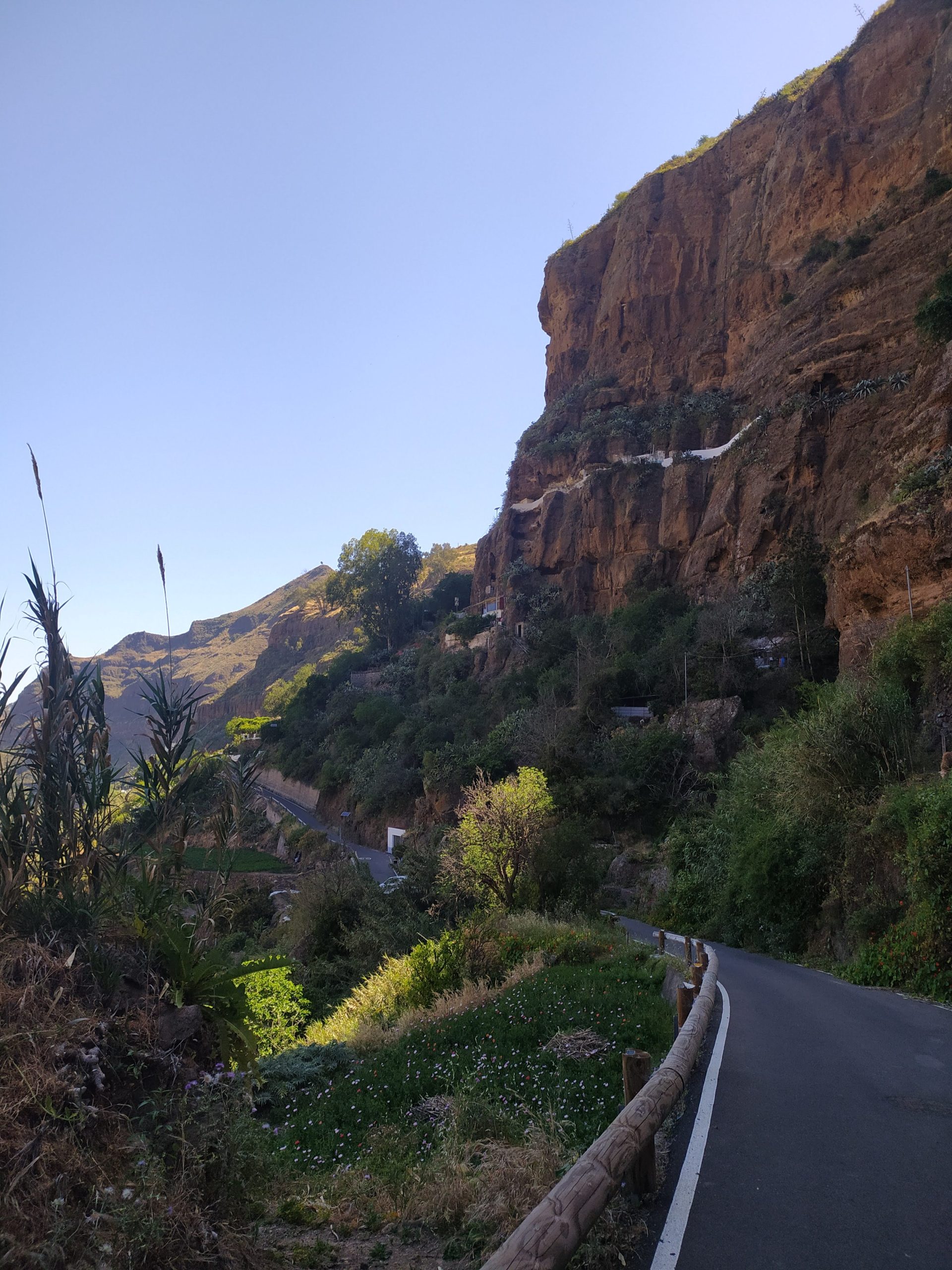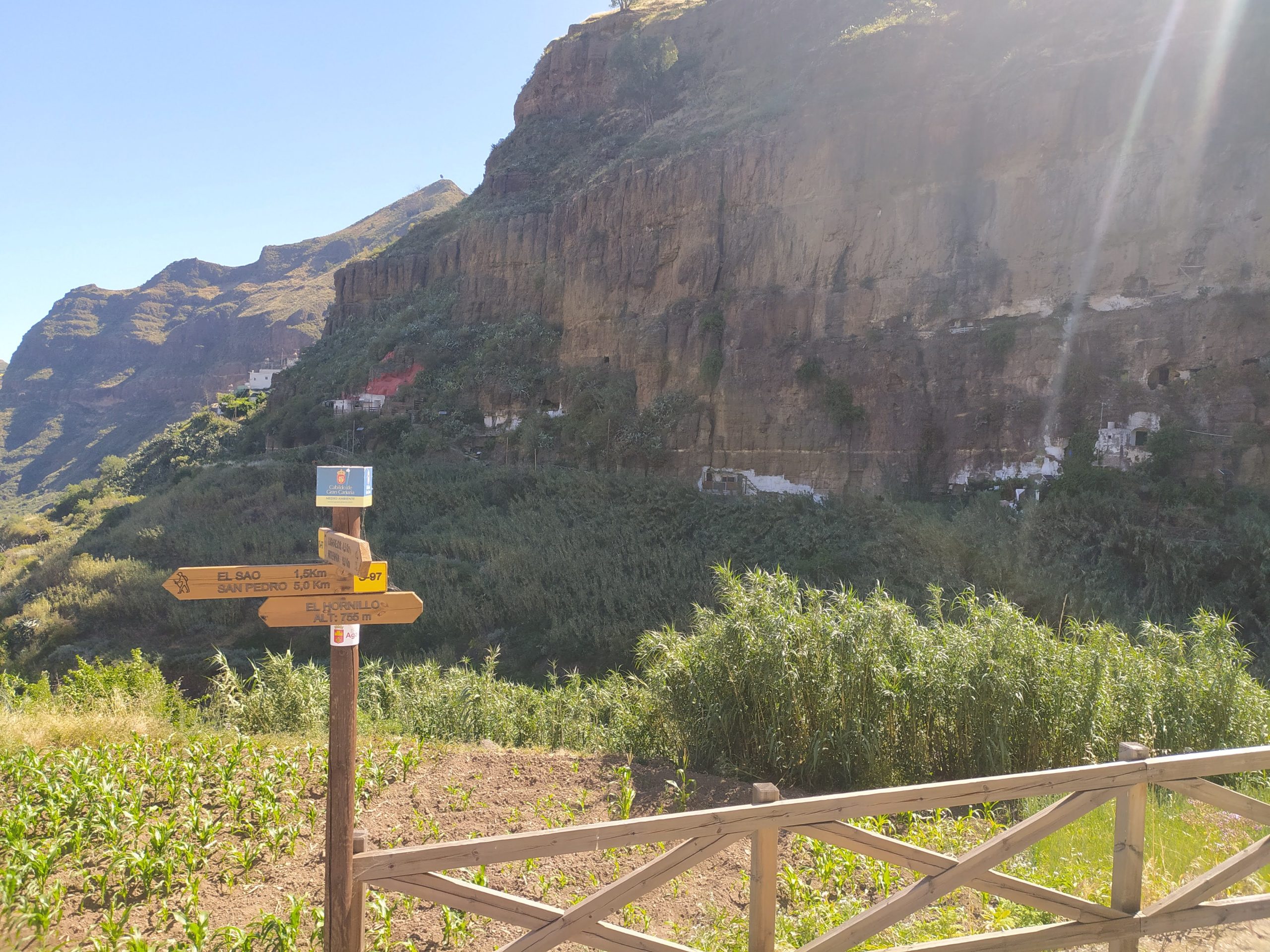 Na zboczach gór, tuż obok schroniska, w wykutych w skałach jaskiniach były domy nadal zamieszkałe. Nasz gospodarz Alex powiedział mi wieczorem, że miejsce to jest wpisane na listę UNESCO, a zamieszkują je potomkowie rdzennej ludności. Poniżej jaskiń były małe poletka, rosły na nich ziemniaki, kukurydza i inne warzywa. Do schroniska dochodzi droga asfaltowa, ale od innej strony niż nasza miejscowość. Gdybyśmy mieli to lepiej rozeznane, pewnie podjechalibyśmy tu autem i zaoszczędzili sobie pierwszego etapu wspinaczki.