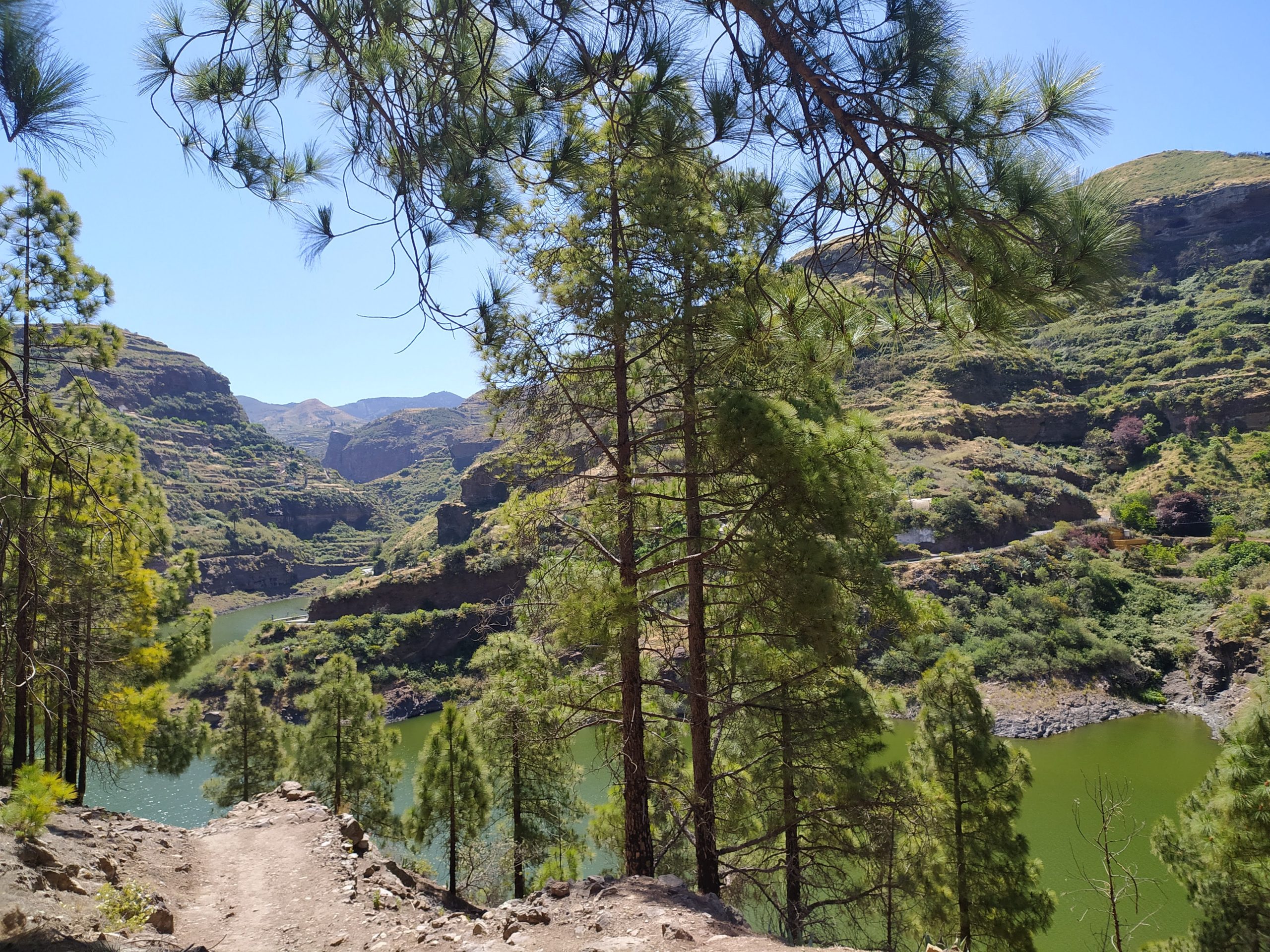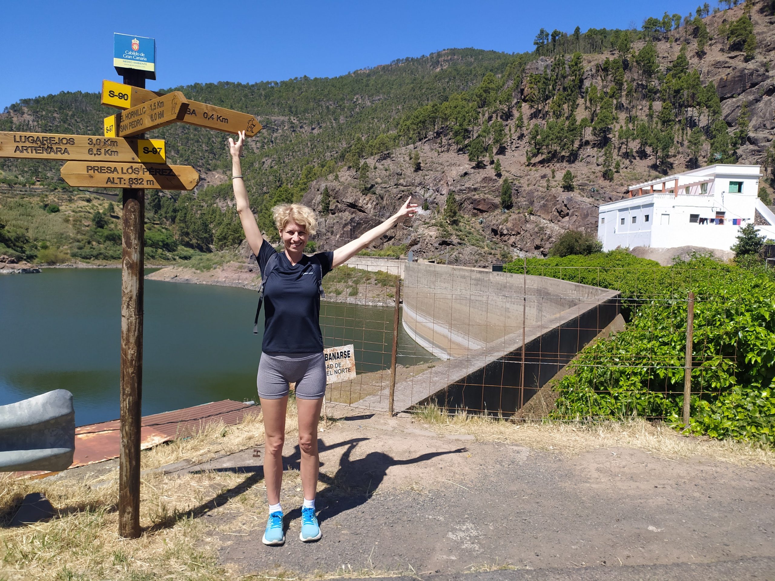 Asfaltem, który nadal stromo prowadził pod górę doszliśmy do jednego z kilku sztucznych jeziorek, zbiorników retencyjnych. Tamą przeszliśmy na drugą stronę doliny. Drogowskaz pokazał 400 m do Tamadaba. Spotkani nieliczni turyści wspomnieli, że dalsza droga jest bardzo stroma. Idąc zakosami doszliśmy to tabliczki z napisem „Tamadaba”. Wyglądała bardziej jak drogowskaz, ale nie było na niej podanego żadnego dystansu. Nie było tu także żadnego znaku, który by wskazywał że to koniec szlaku. Ruszyliśmy więc dalej, znowu pod górę.