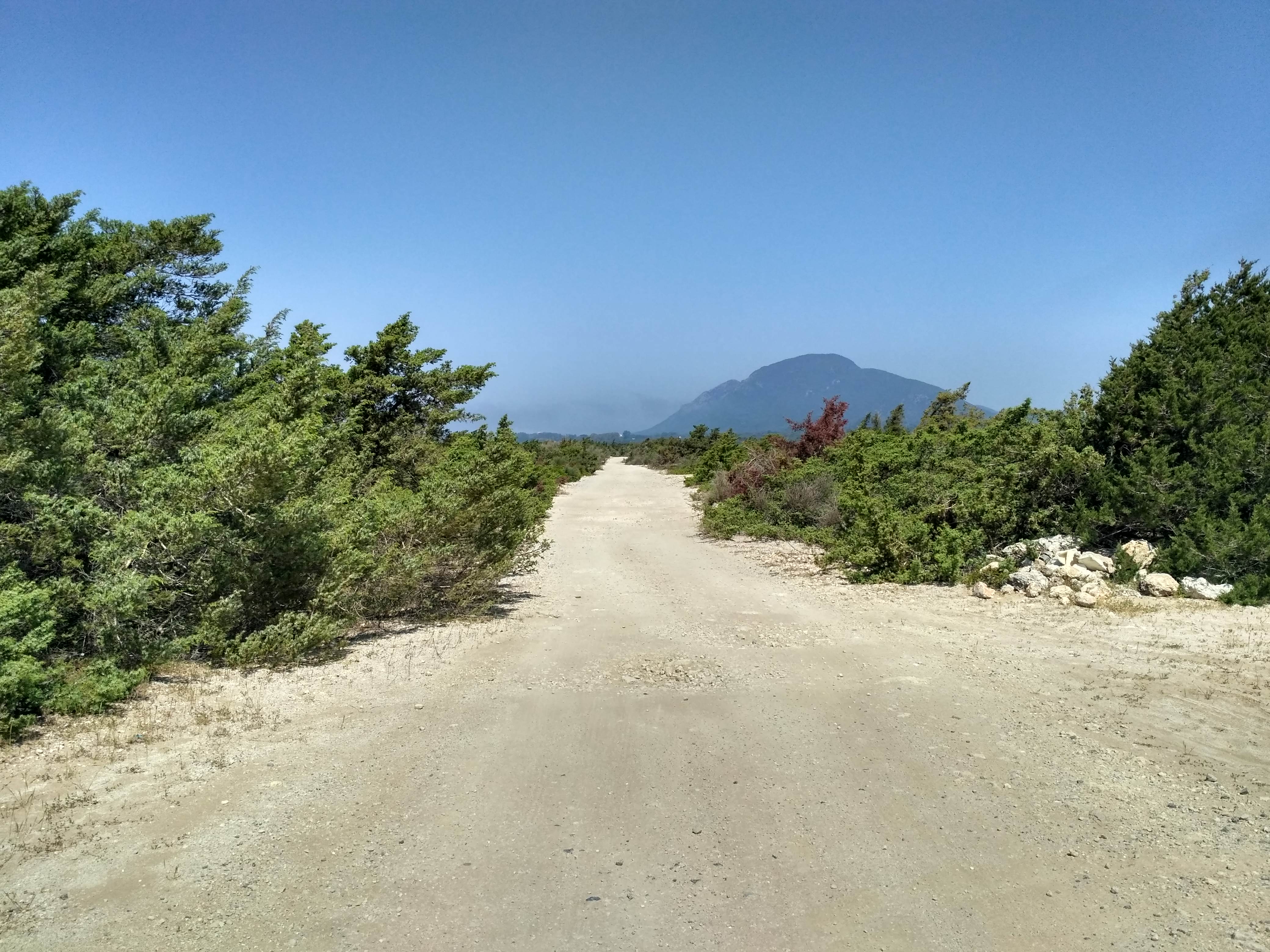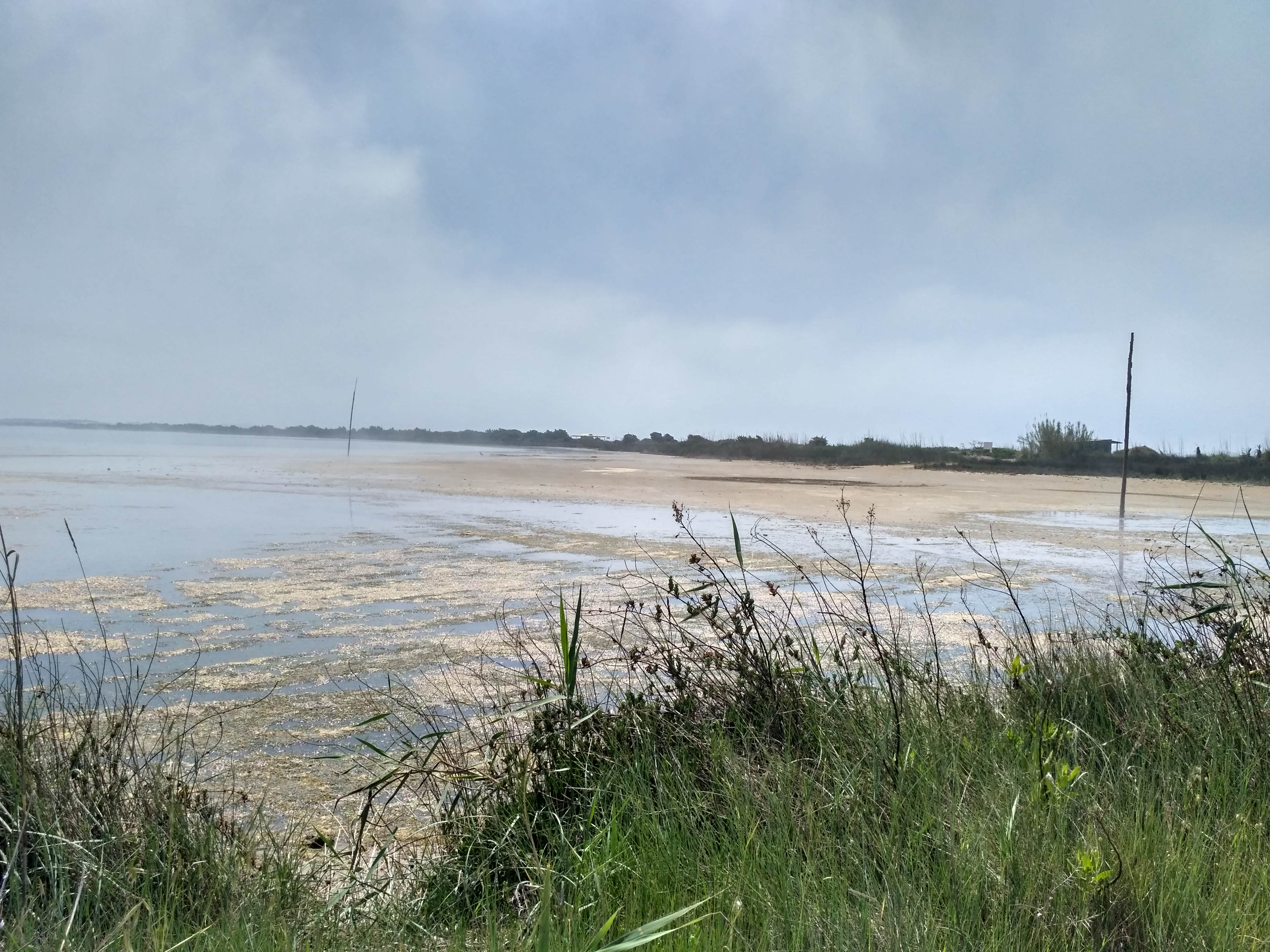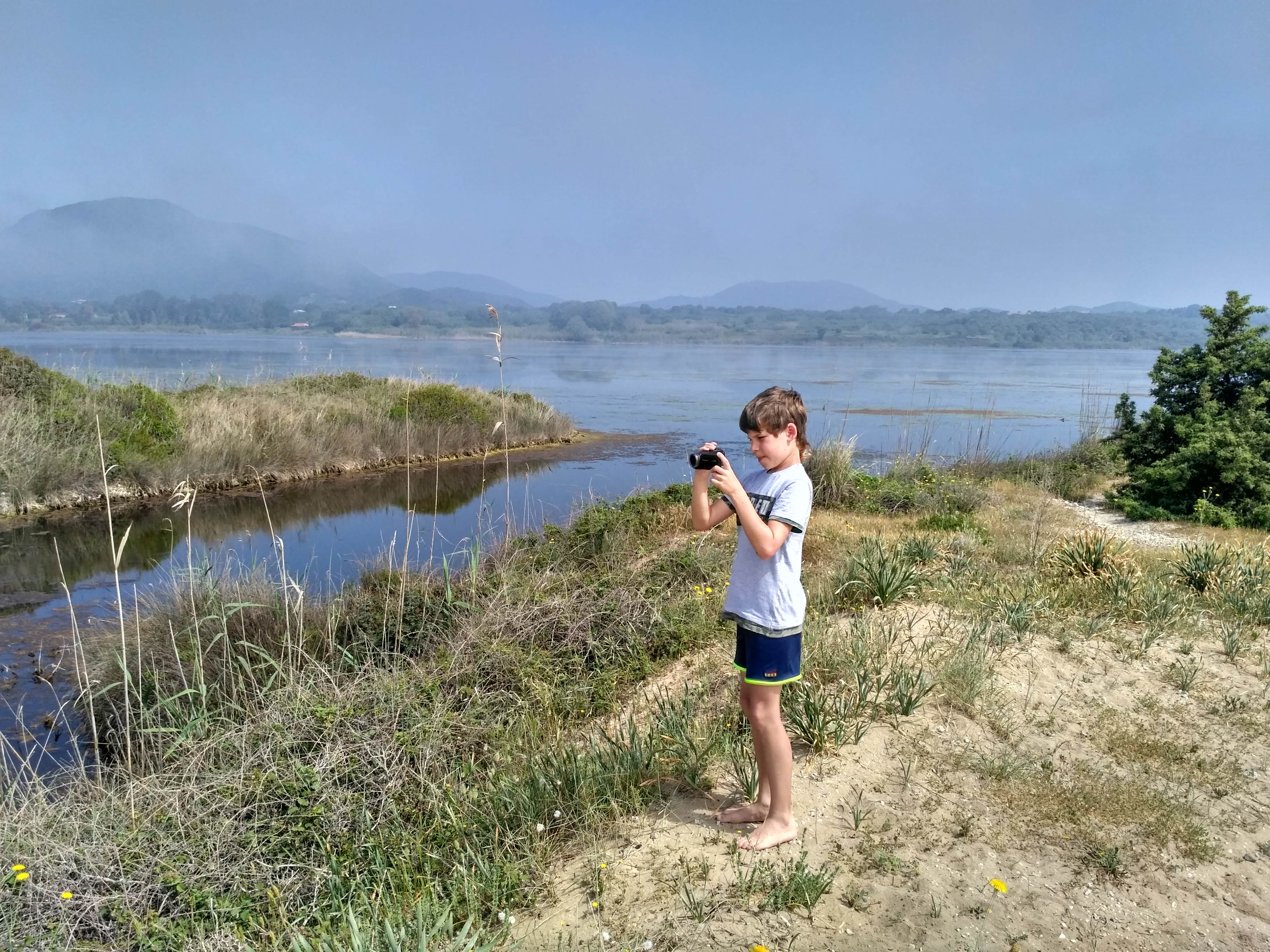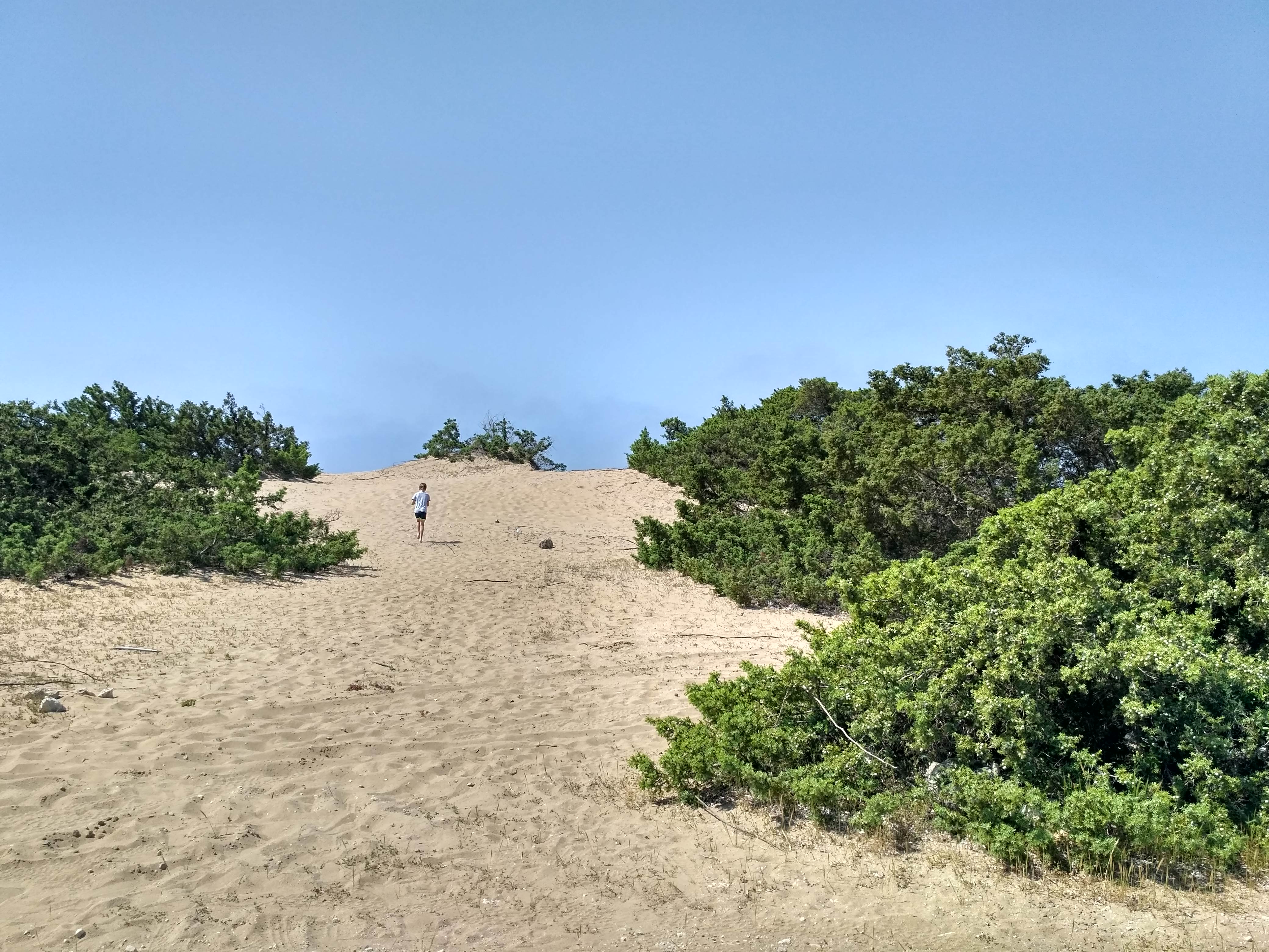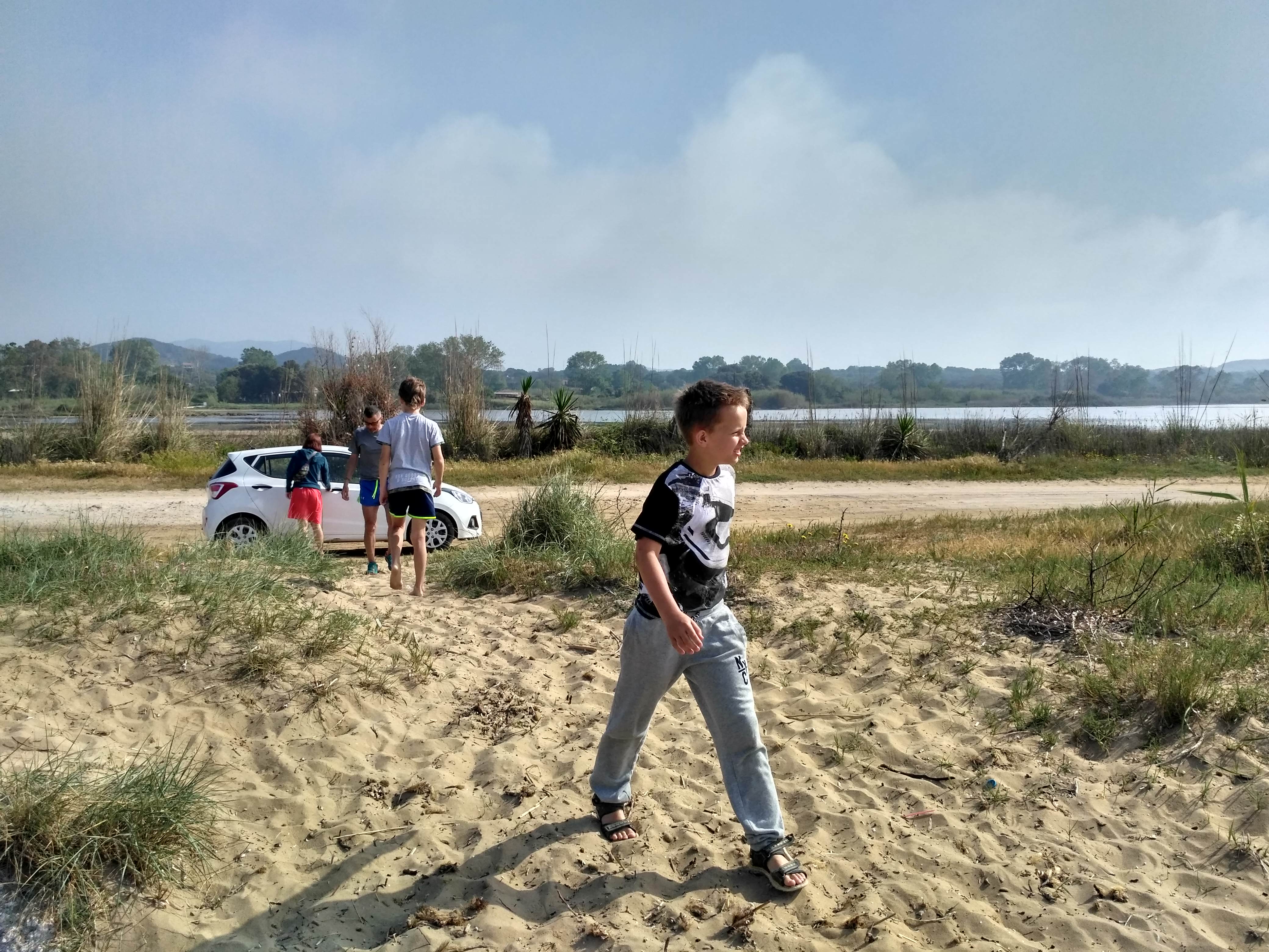 Dojechaliśmy tam od strony wioski Chalikouna. Jezioro porośnięte było trawami i sitowiem, od morza oddzielało je pasmo wydm. Yacool był ciekawy czy woda jest w nim słodka, ale nie za bardzo było jak to sprawdzić. W tym miejscu nad morzem była bardzo ładna, szeroka i długa, piaszczysta plaża. Do tego całkiem pusta. Pospacerowaliśmy sobie jej brzegiem brodząc w wodzie i zbierając muszelki. Potem z Jankiem pojechaliśmy szutrową drogą wśród wydm do miejsca, gdzie morze wąskim kanałem łączyło się z jeziorem. Stał tam domek i ambona i kładka, która umożliwiała dalszą, pieszą wędrówkę wzdłuż jeziora.