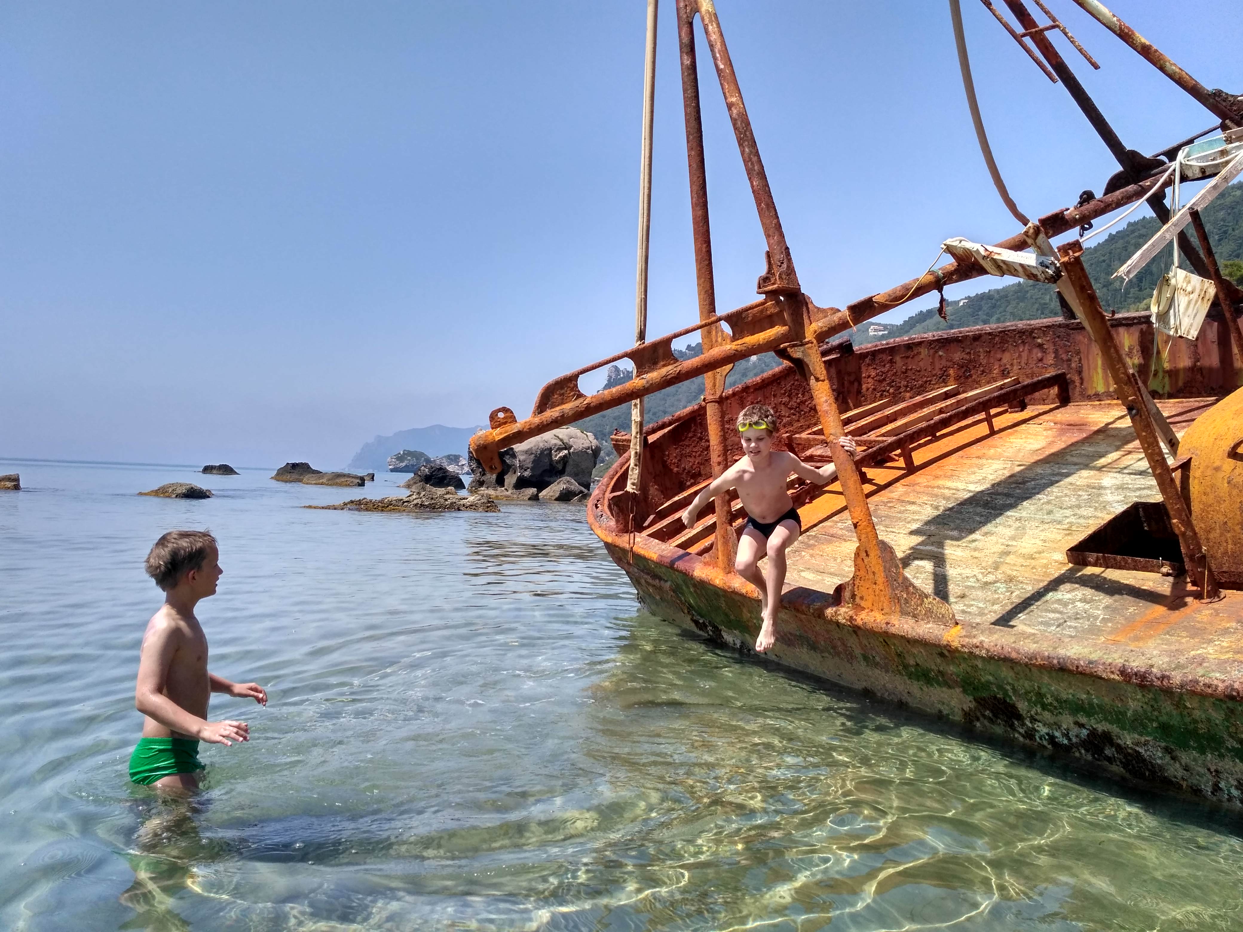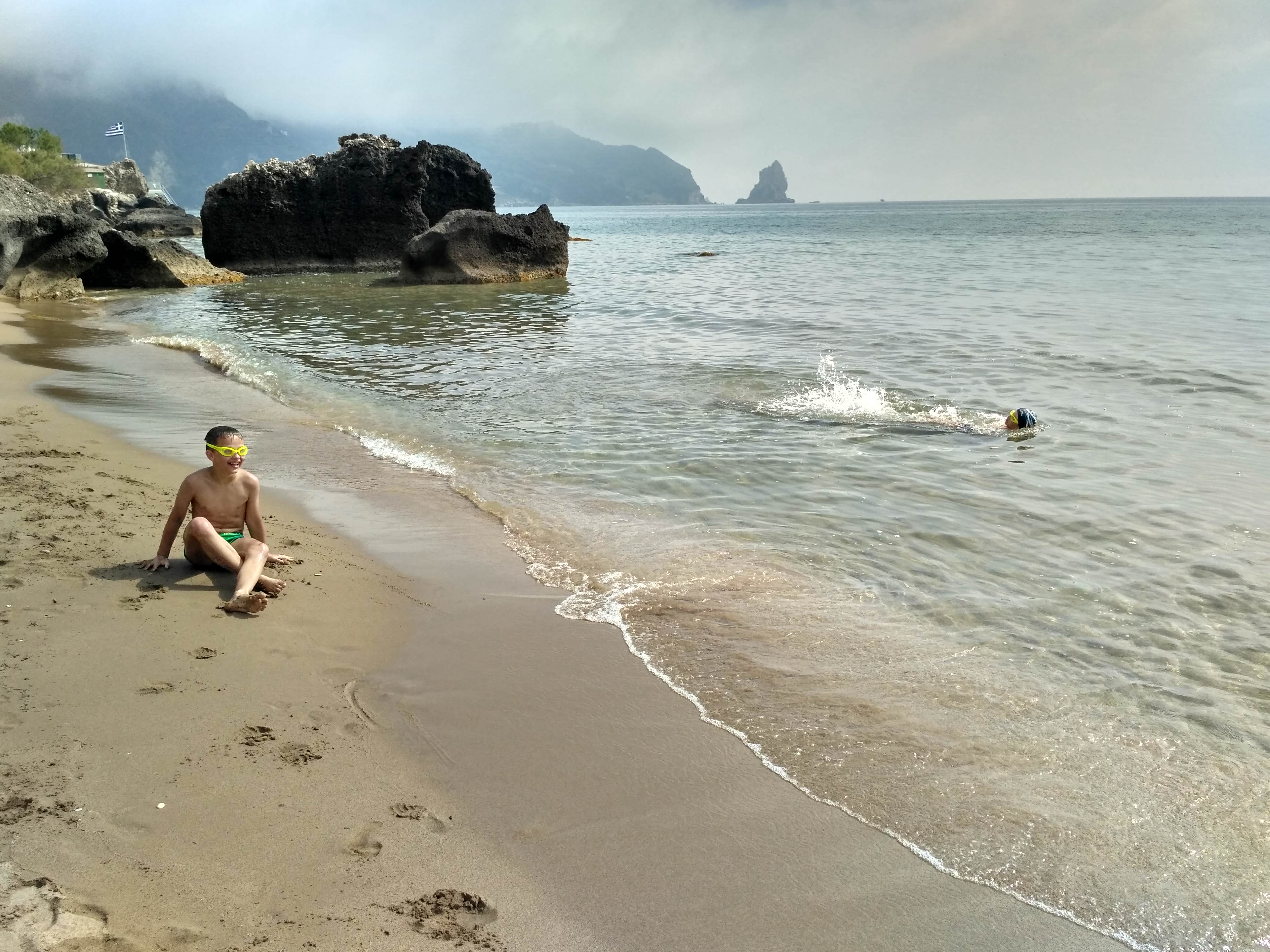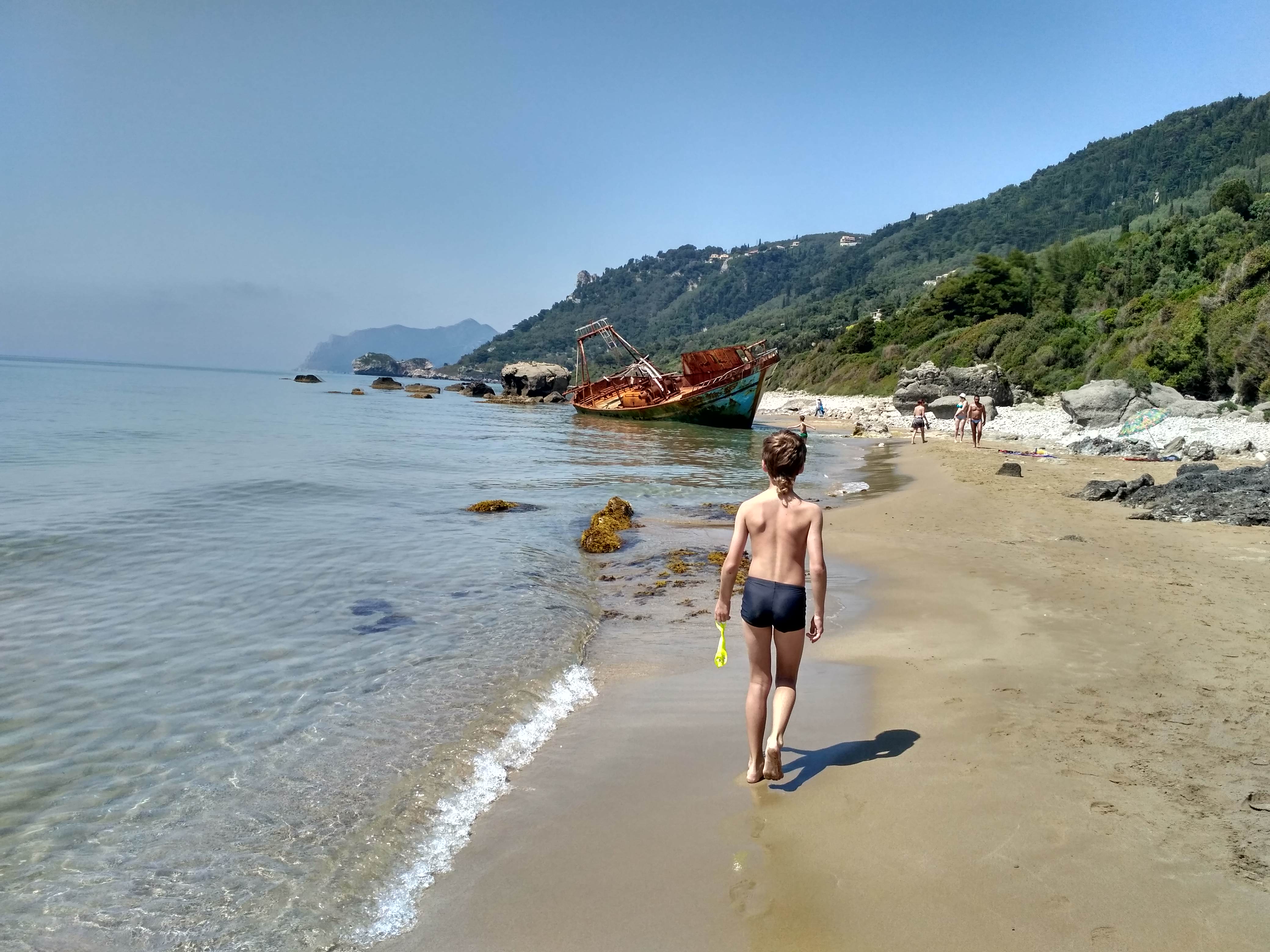 W południe wróciliśmy do naszej miejscowości. Po drodze mijaliśmy ruiny XIII wiecznej twierdzy w Gardiki. W Agios Gordios poszliśmy na lunch do odkrytej wczoraj knajpki, zamówiliśmy pity wegetariańskie i gyros, lody na deser. Potem plaża i pływanie. Martyna na wczorajszym spacerze brzegiem morza odkryła wrak statku. Poszliśmy go zobaczyć z dzieciakami. Znajdował się na prawo od głównej plaży, za skałkami. Okazało się, że woda w tym miejscu jest dużo cieplejsza, plaża bardziej intymna, przytulna. Yacool robił swój półtoragodzinny morderczy trening pływacki, a my oddaliśmy się nadmorskiej rekreacji. Dopiero około 19 dzieciaki miały dość wody, głód pomógł nam zmobilizować je do zejścia z plaży. W międzyczasie nad plażę nadciągnęła mgła, a może to woda z morza tak parowała. Widok był niecodzienny.