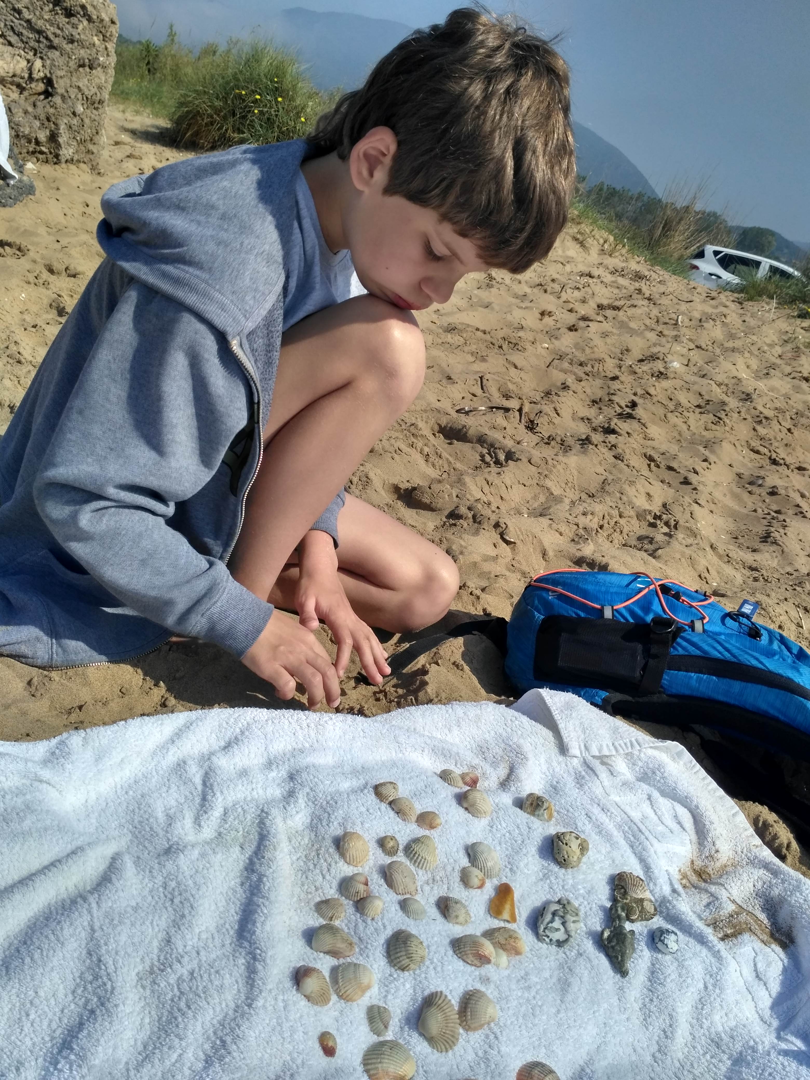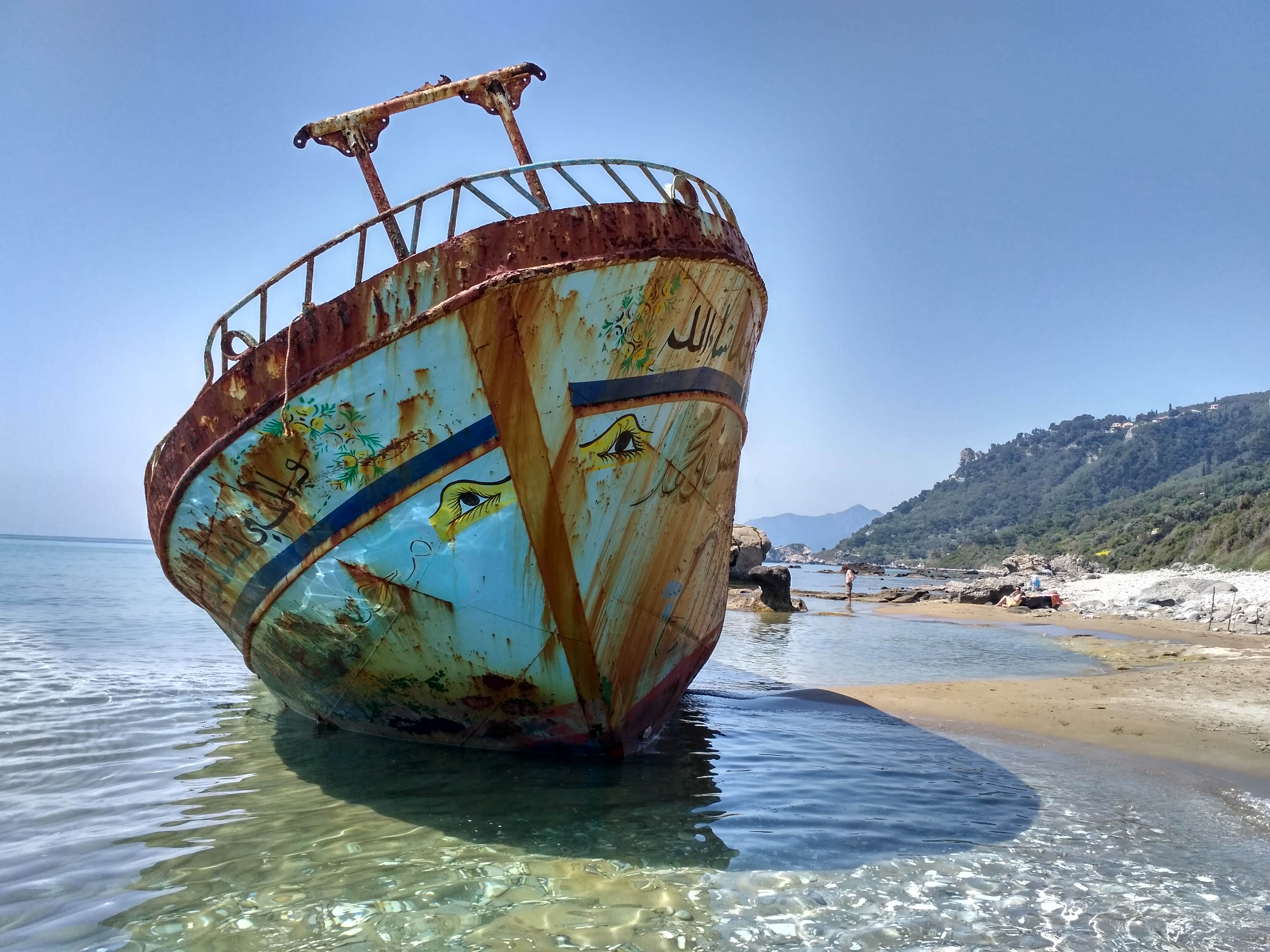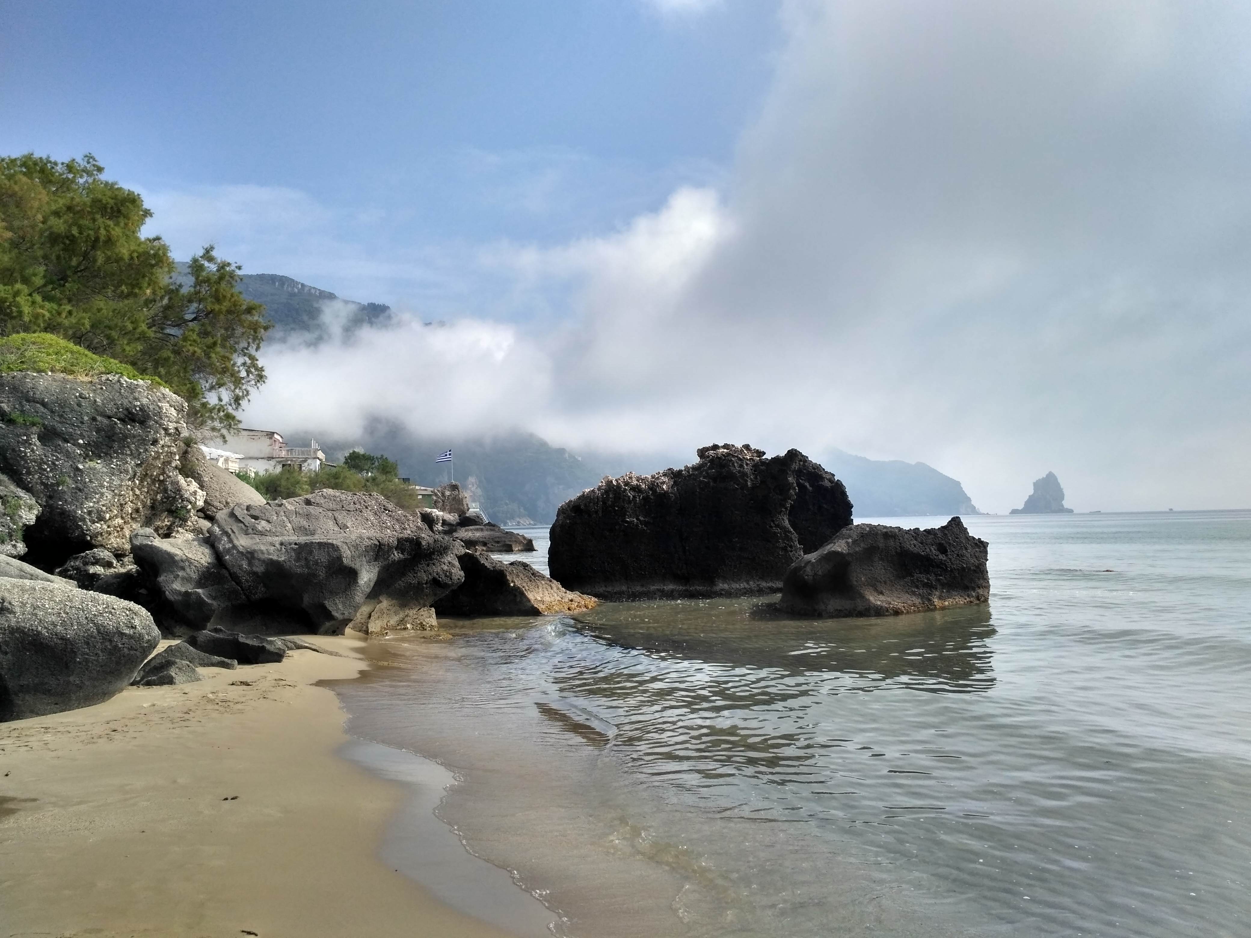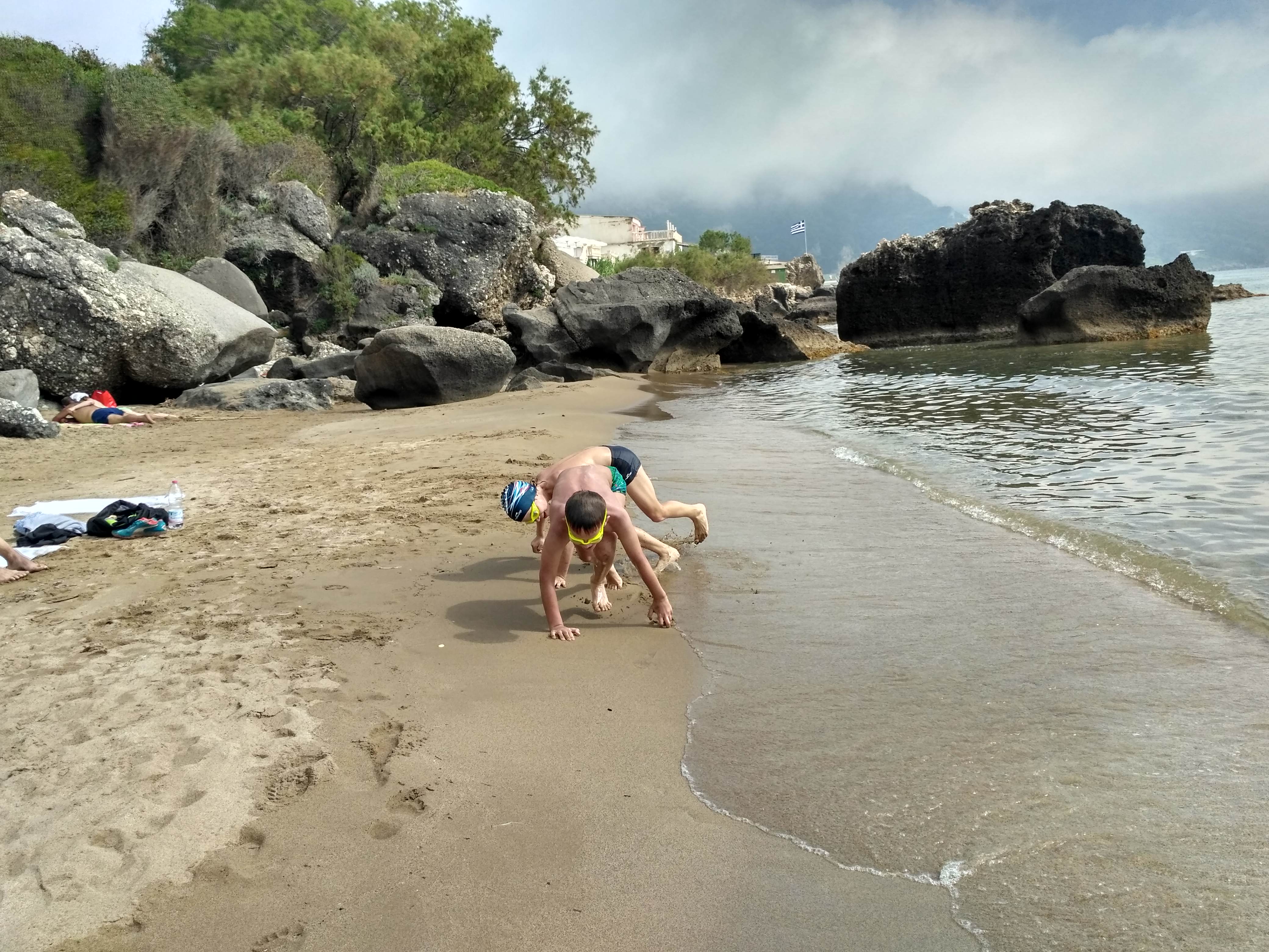W południe wróciliśmy do naszej miejscowości. Po drodze mijaliśmy ruiny XIII wiecznej twierdzy w Gardiki. W Agios Gordios poszliśmy na lunch do odkrytej wczoraj knajpki, zamówiliśmy pity wegetariańskie i gyros, lody na deser. Potem plaża i pływanie. Martyna na wczorajszym spacerze brzegiem morza odkryła wrak statku. Poszliśmy go zobaczyć z dzieciakami. Znajdował się na prawo od głównej plaży, za skałkami. Okazało się, że woda w tym miejscu jest dużo cieplejsza, plaża bardziej intymna, przytulna. Yacool robił swój półtoragodzinny morderczy trening pływacki, a my oddaliśmy się nadmorskiej rekreacji. Dopiero około 19 dzieciaki miały dość wody, głód pomógł nam zmobilizować je do zejścia z plaży. W międzyczasie nad plażę nadciągnęła mgła, a może to woda z morza tak parowała. Widok był niecodzienny.
