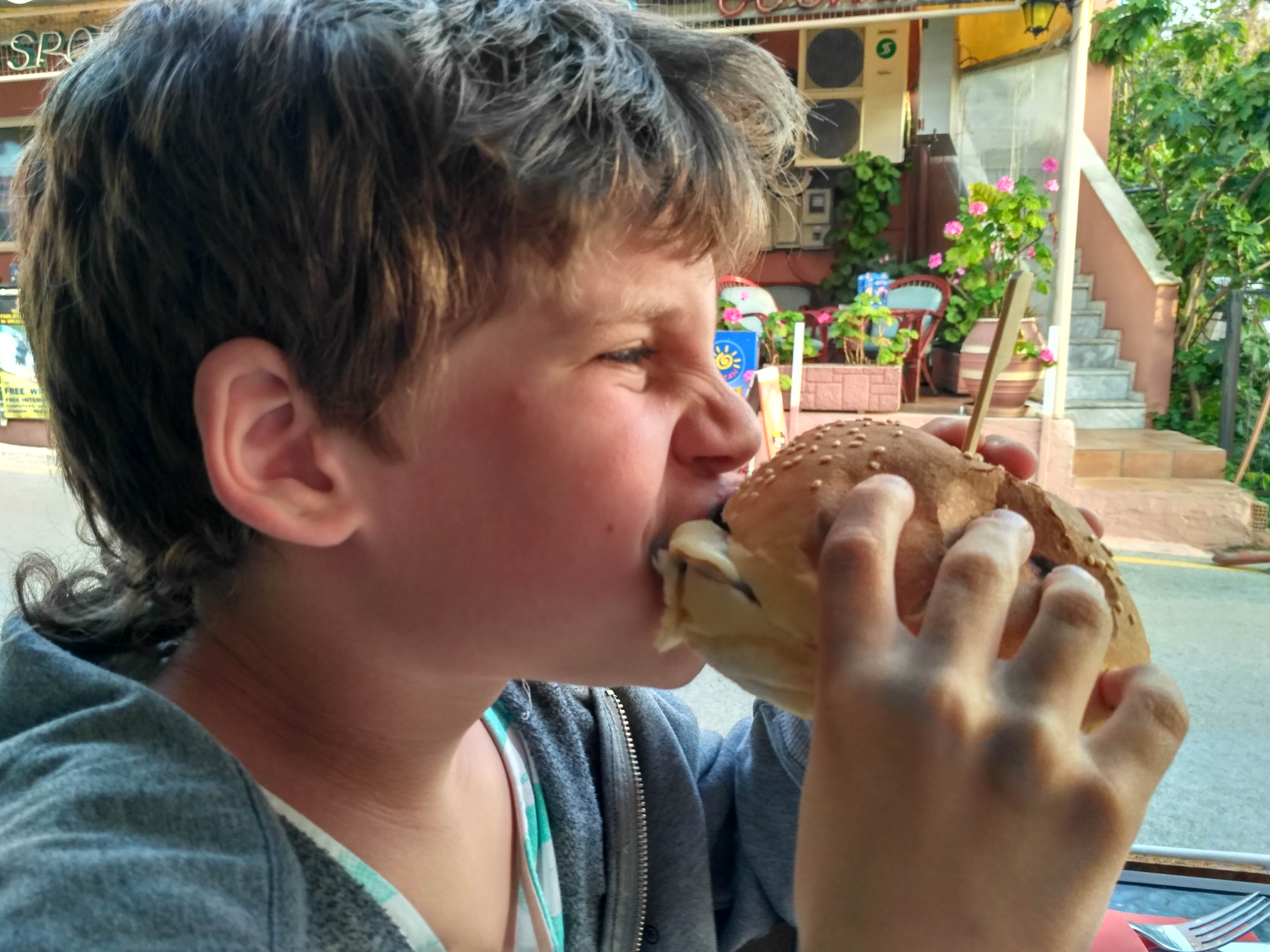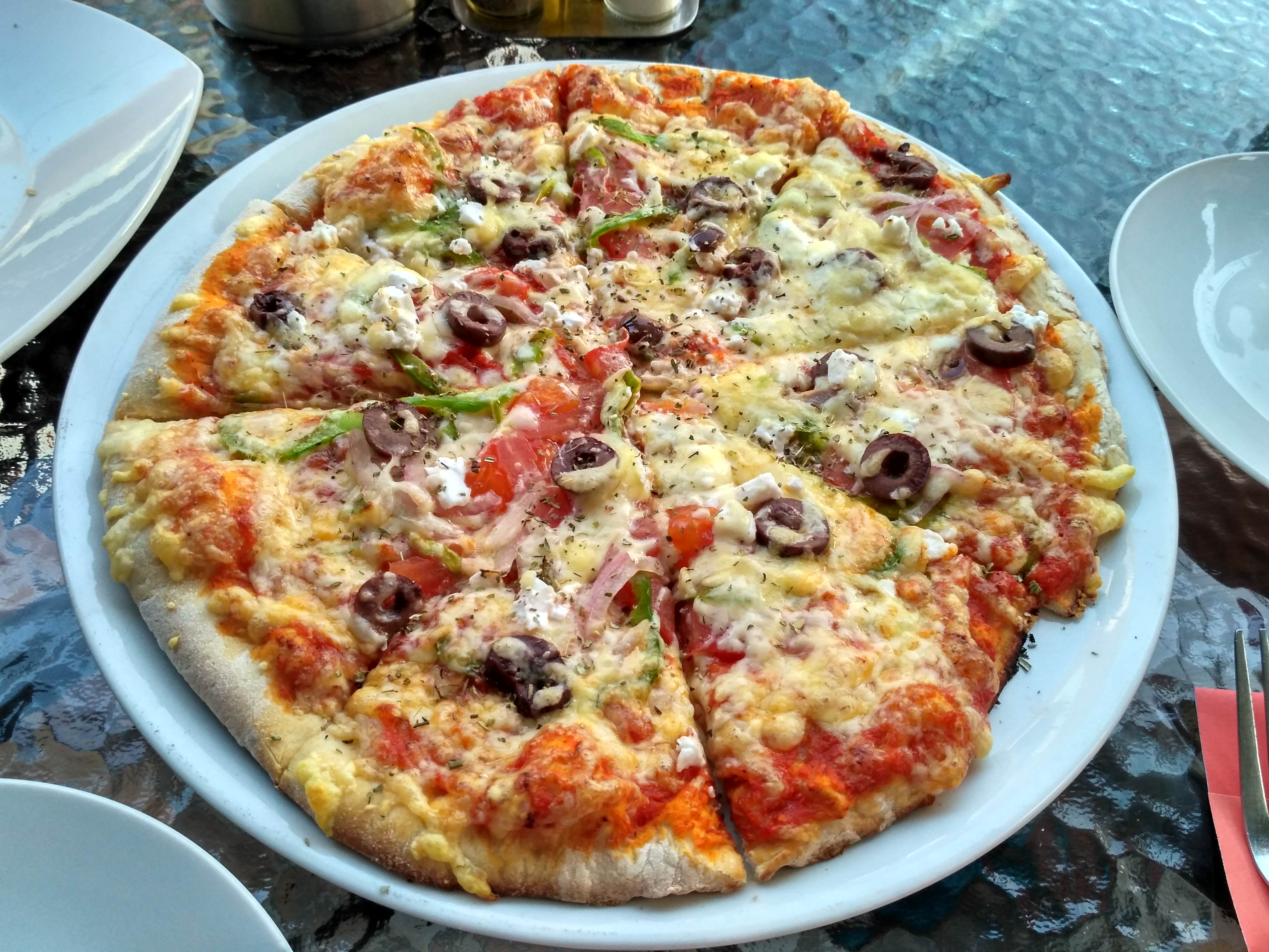 Wróciliśmy pod wieczór do naszego domku na arbuza i zimne piwo, a potem poszłam jeszcze z chłopakami coś zjeść. Janek zajadał hamburgera, a my grecką pizzę z oliwkami, fetą, pomidorami i papryką. Niby nie byliśmy tak bardzo głodni z yacoolem, ale pochłonęliśmy pizzę bez mrugnięcia okiem. Była pyszna. Wracając do domku zdążyliśmy na zachód słońca, który dziś obejrzeliśmy z naszego tarasu.