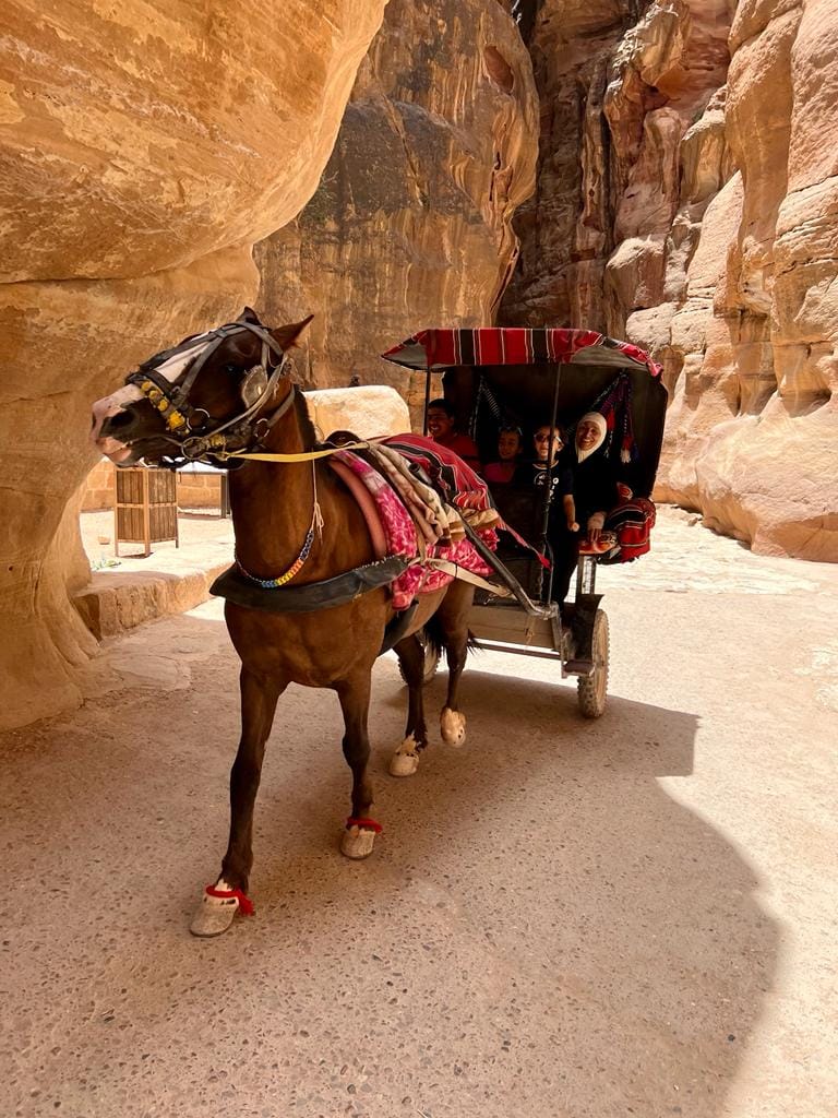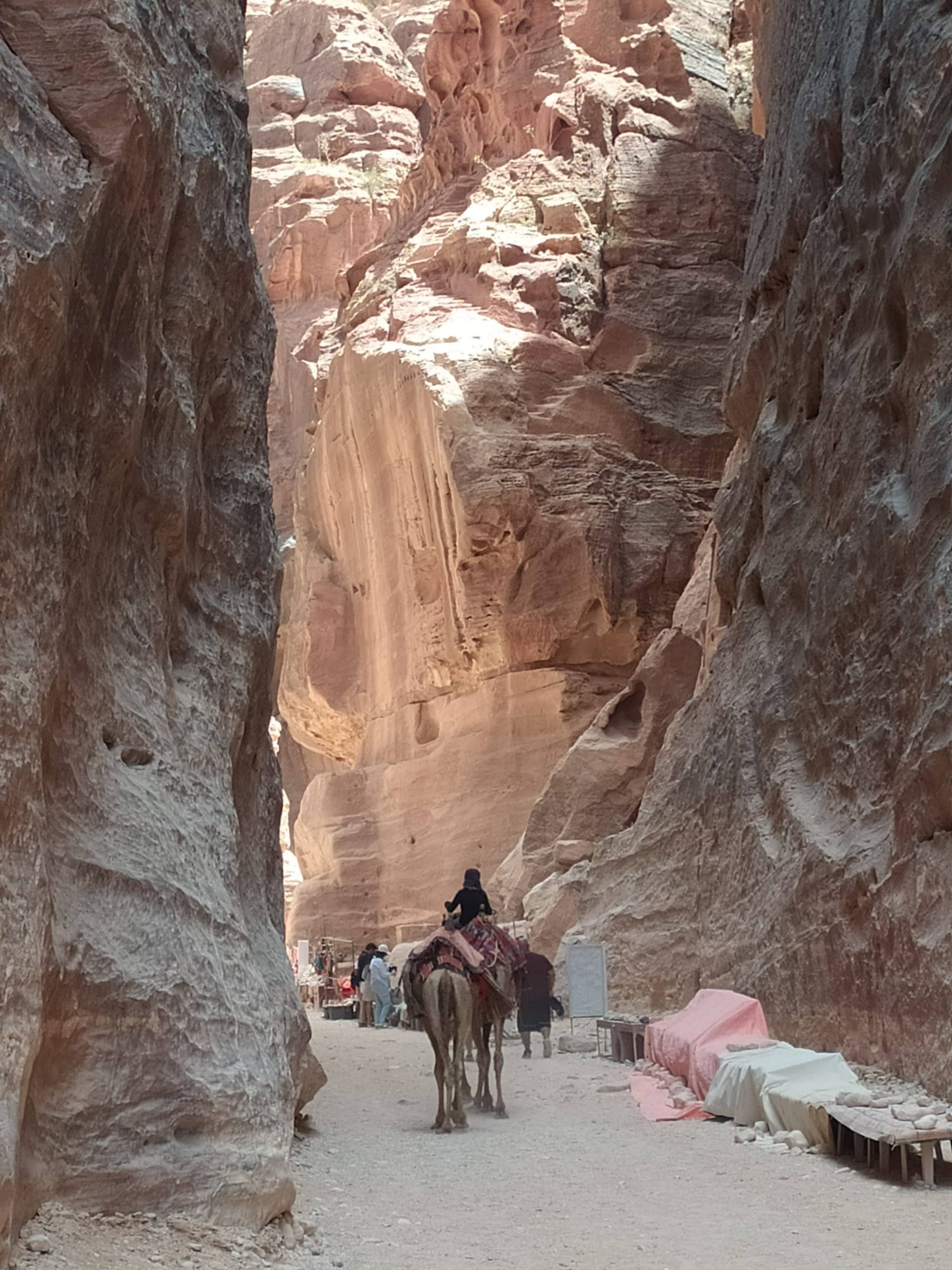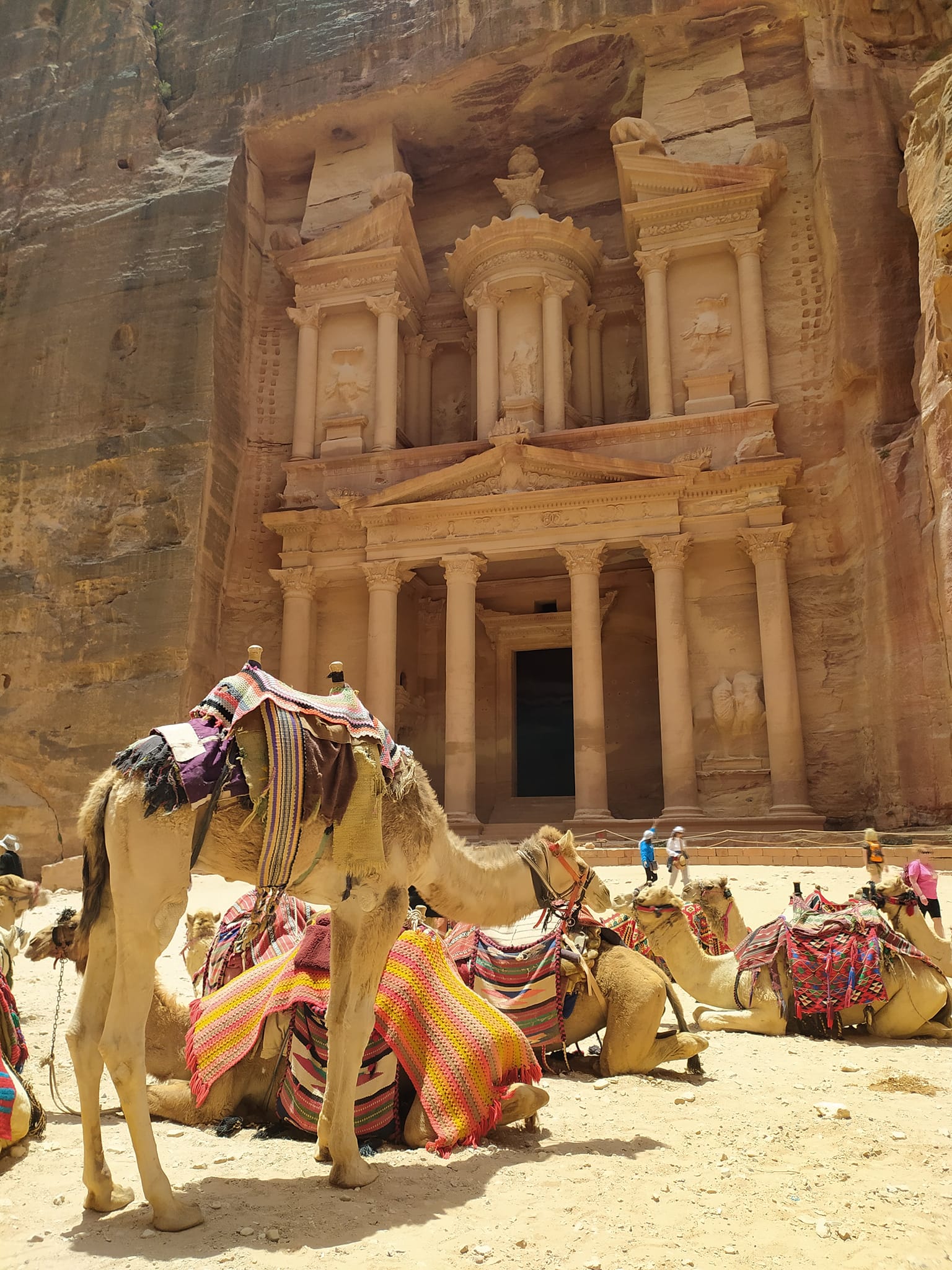 Trafiliśmy ze zwiedzaniem w taki okres, gdy turystów nie było dużo. Po przejściu pierwszego półtora kilometrowego odcinka momentami całkiem wąskim wąwozem wychodzi się na chyba najsłynniejszy, a przynajmniej najbardziej charakterystyczny zabytek Petry – Skarbiec Faraona. Nazwy poszczególnych obiektów niekoniecznie mają cokolwiek wspólnego z ich faktycznym pierwotnym przeznaczeniem. Przed skarbcem leżały wielbłądy, a miejscowi zachęcali do przejażdżki na ich grzebiecie. Trasę kanionu częściowo można też było pokonać na grzbiecie muła, rydwanem czy melexem…
