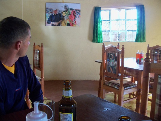 W drodze powrotnej wstąpiliśmy do baru, który reklamował się, że ma pizzę. Mała odmiana od ugali. Prowadzi go Ross – Australijczyk, który przyjechał do Iten 5 lat temu i zakochał się w tym miejscu. Spędza tu 6 miesięcy w roku. Kucharki wysłał na kurs kulinarny do Eldoret. W ogródku posadził drzewa bananowca, mango, pomarańczy, szpinak, kapustę i managu. Do przyrządzania potraw wykorzystuje więc własną uprawę. Oparcia krzeseł w knajpie są udekorowane zdjęciami znanych biegaczy. Pogadaliśmy też z nim o mieszkaniu, które wynajmuje, warunkach, cenach. Ma nas umówić z właścicielem mieszkań, zrobimy rekonesans, będziemy mieć pełen obraz możliwości zakwaterowania w zależności od budżetu.