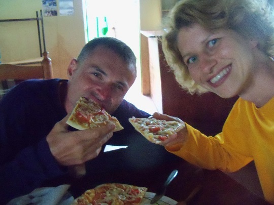 Zamówiliśmy pizzę i piwo. Była przepyszna. Śmialiśmy się, że jemy włoską pizzę, w kenijskiej okrągłej chacie, zarządzanej przez Australijczyka, przy dźwiękach muzyki country.