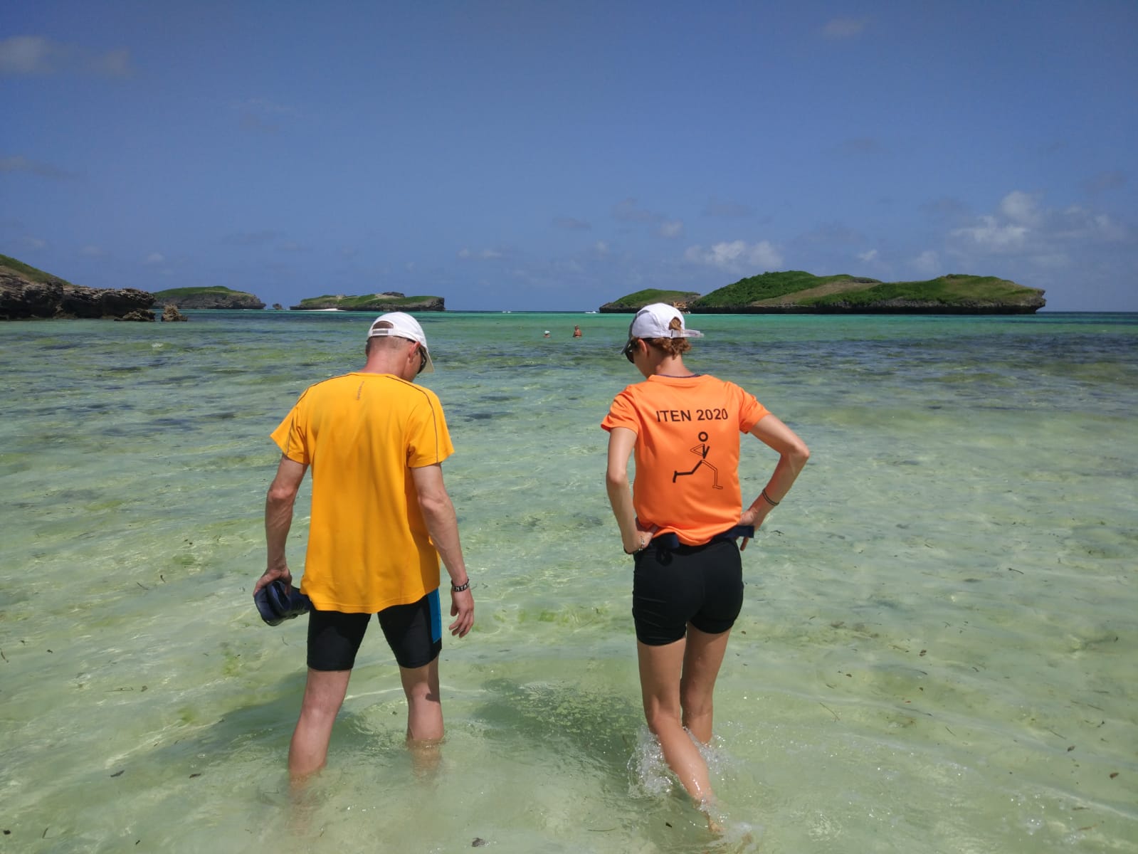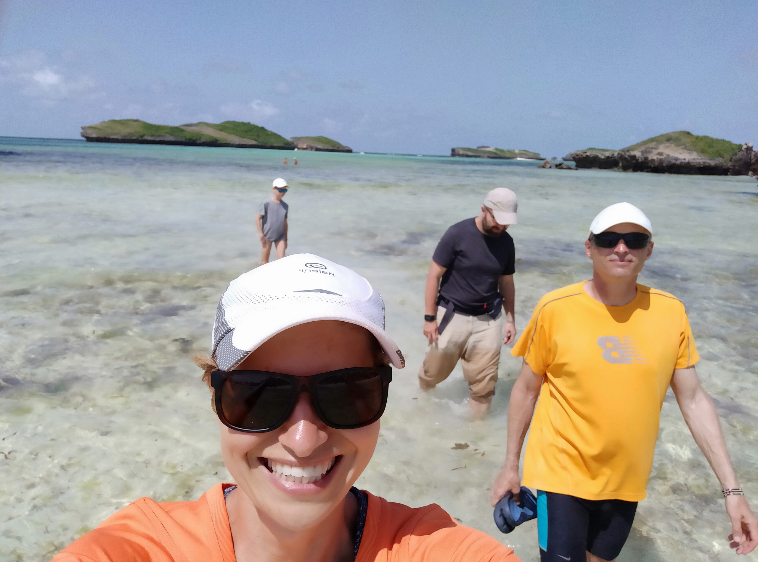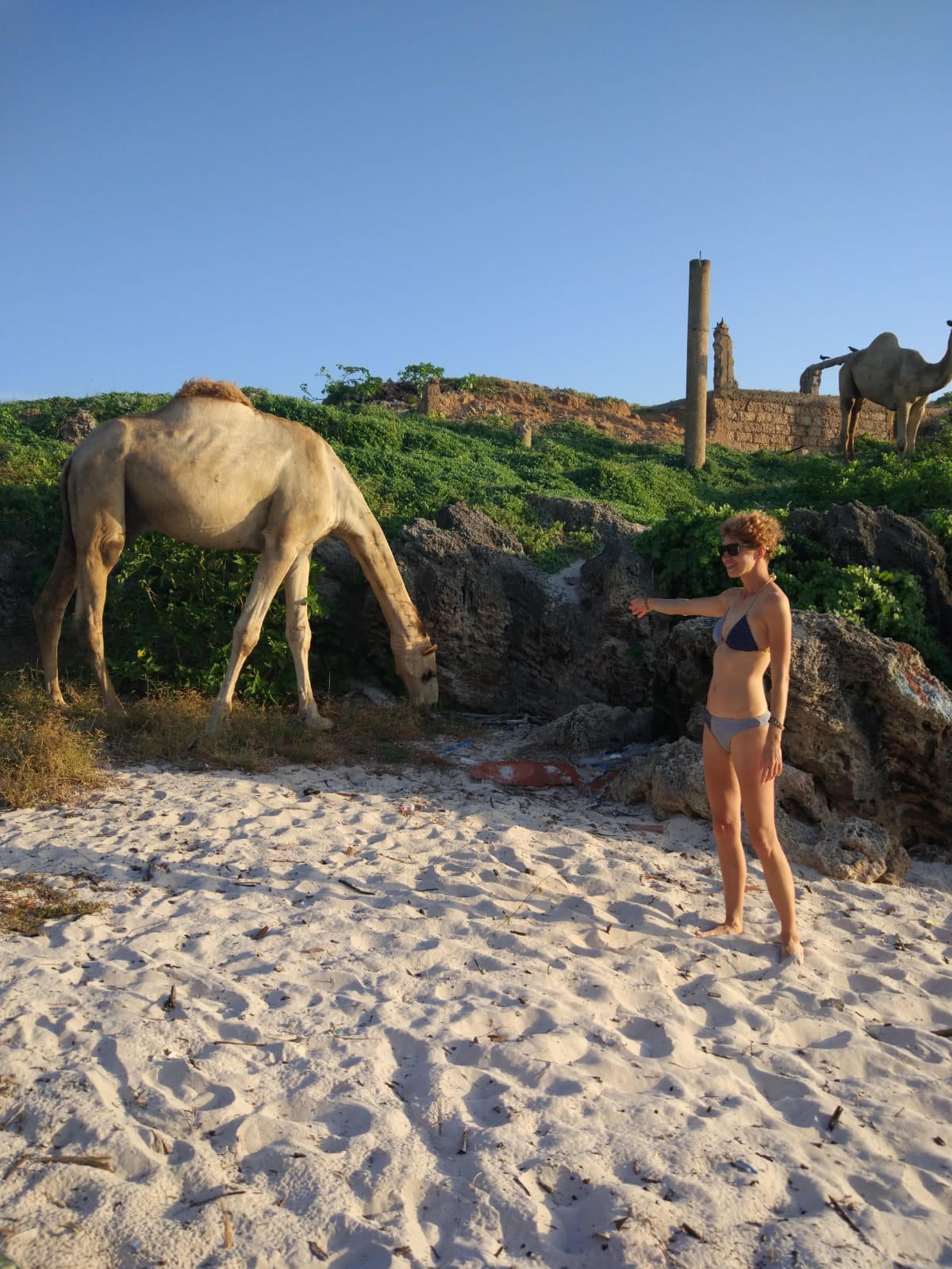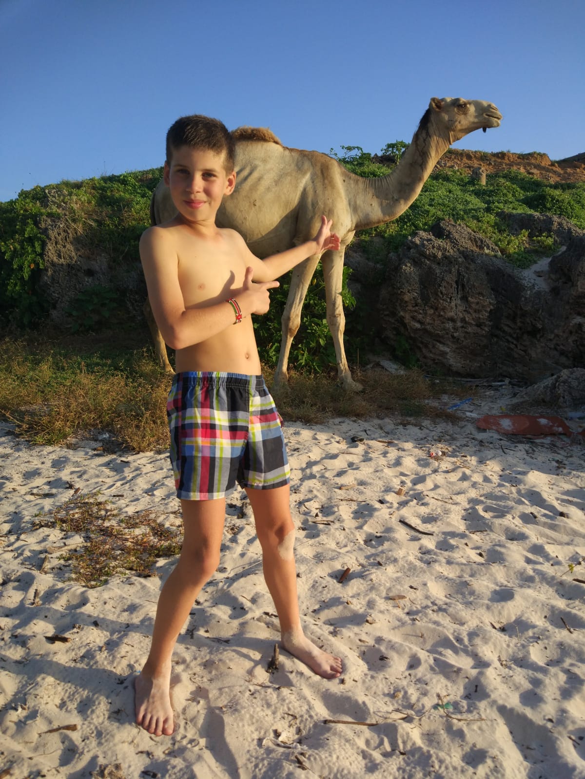 Po południu, gdy trochę odpoczęliśmy po wcześniejszym spacerze, wskoczyliśmy w stroje kąpielowe i poszliśmy popływać. Tym razem wybraliśmy drugą zatokę. Watamu leży na cyplu i dzięki temu mamy dwie zatoki do wyboru. W tej na plaży było bardziej rozrywkowo. Z jednej z hotelowych restauracji dobiegała głośna muzyka. Ludzie grali w siatkówkę i kręgle na piasku. Na cyplu, który w pierwszej chwili wzięliśmy za wyspę chodziły wielbłądy! Przy brzegu zakotwiczone były małe łódki, w wodzie ludzie leżeli i się chłodzili. Dołączyliśmy do tego leniwego klimatu. Hakuna matata