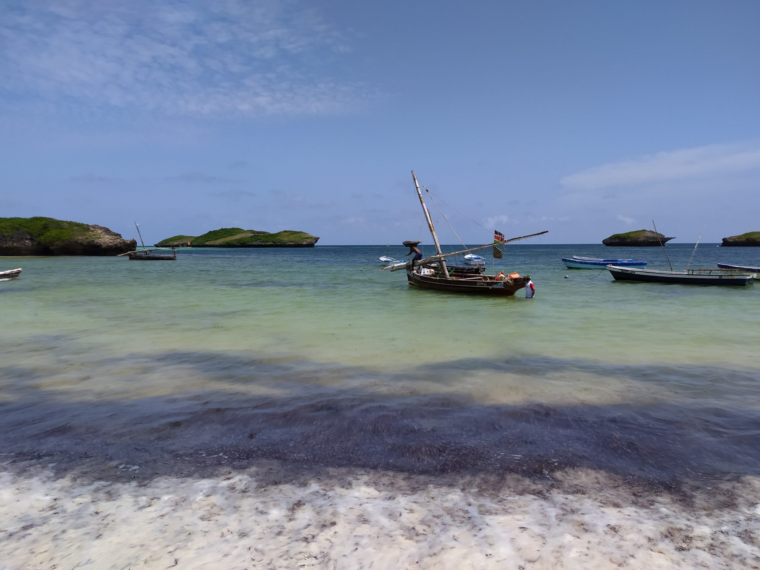 Do oceanu szliśmy pośród ruin. Trochę jak w Pompejach. Potem lokalni chłopacy powiedzieli nam, że był tu kiedyś hotel, który spłonął około 15 lat temu w olbrzymim pożarze. Właściciel nie był w stanie już go odbudować. Miejsce na nowo porosły jedynie palmy i krzaki. Plaże w Watamu są piaszczyste, piasek biały i bardzo delikatny. Ze względu na odpływy pokryte jednak dużą ilością wodorostów. Woda ciepła jak w kranie, kolory obłędne. Blisko brzegu jest sporo małych koralowych wysepek. Lokalsi oferują przejażdżki na nie swoimi łodziami. Przy plażach są restauracje i hotele. Można odpoczywać na leżaku, w cieniu baldachimu.