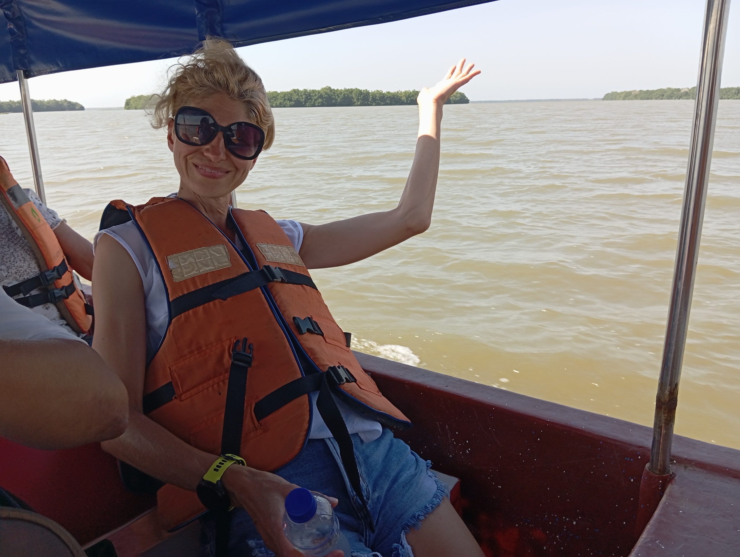 Przepływaliśmy między drewnianymi domami przyglądając się życiu ich mieszkańców. Każdy dom miał drewniany taras, na którym toczyło się życie. Na niektórych były psy i koty, we wspólnej komitywie. Podobno i jedne i drugie pływają między domami. Pomyślałam sobie o moim Meshacku, taki styl życia absolutnie nie byłby dla niego. Zjedliśmy lunch w jednej z wodnych knajp i ruszyliśmy naszą łodzią motorową w kierunku brzegu. Fale były już większe niż rano i woda rozbryzgiwała się o boki pędzącej łódki. Podróż na stały ląd zajęła nam niecałe półtorej godziny.