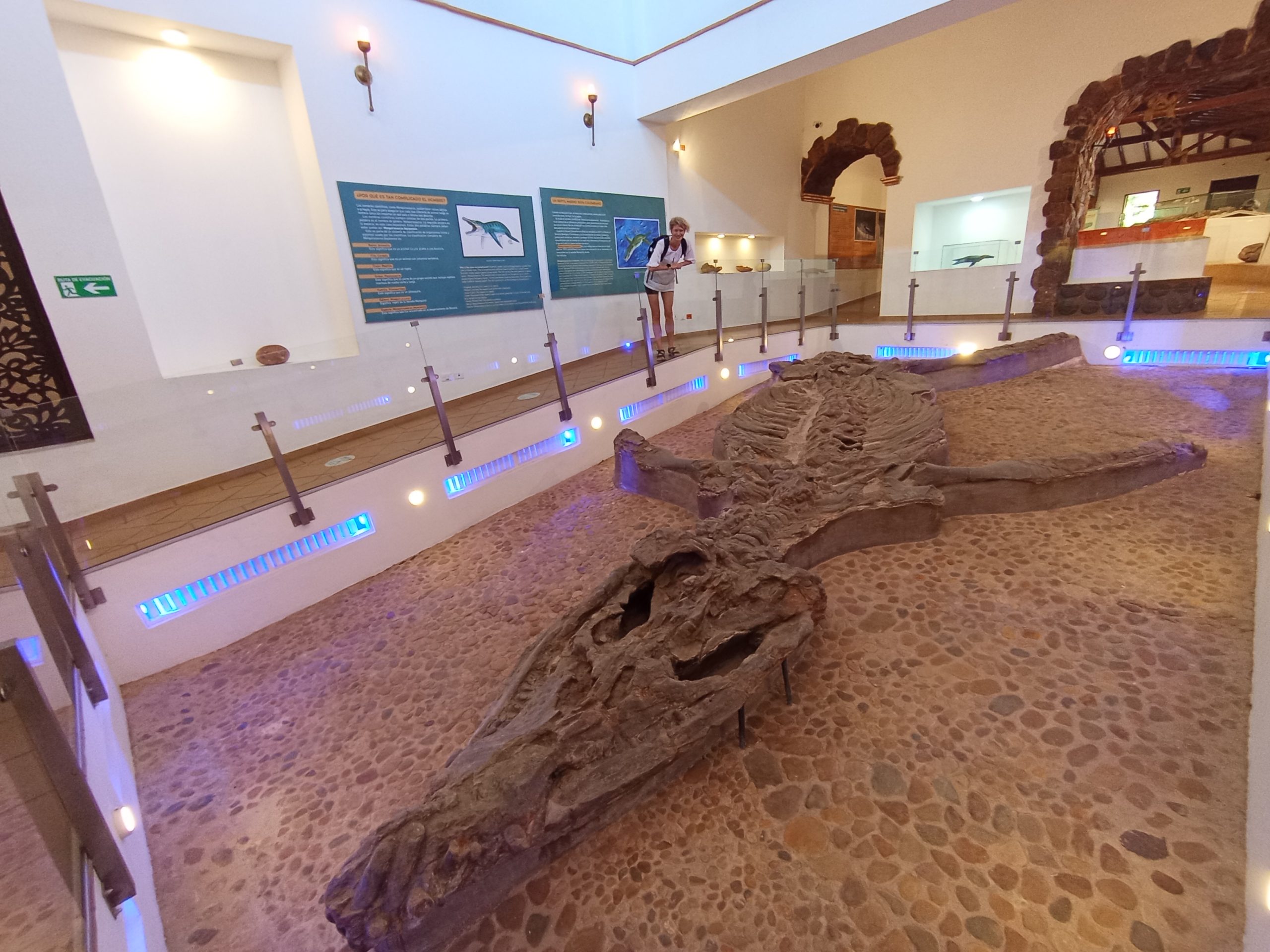 Po śniadaniu pojechaliśmy do pobliskiego muzeum, w którym znajduje się odkopany szkielet kronozaura. Muzeum zbudowano wokół znaleziska tak, że kości nie zostały przeniesione. Wykopany stwór z wyglądu przypomina wielkiego krokodyla, ale tak naprawdę spokrewniony jest z dzisiejszymi jaszczurkami i wężami. Szkielet jest olbrzymi i przez to, że jest niemal kompletny stanowi ewenement na skalę światową. Sama czaszka mierzy 2,7 m długości, a zęby są długości przedramienia. Jest w świetnym stanie, właściwie kompletny, brakuje mu jedynie ogona. Były też inne skamieniałości, bardzo lubię takie miejsca.