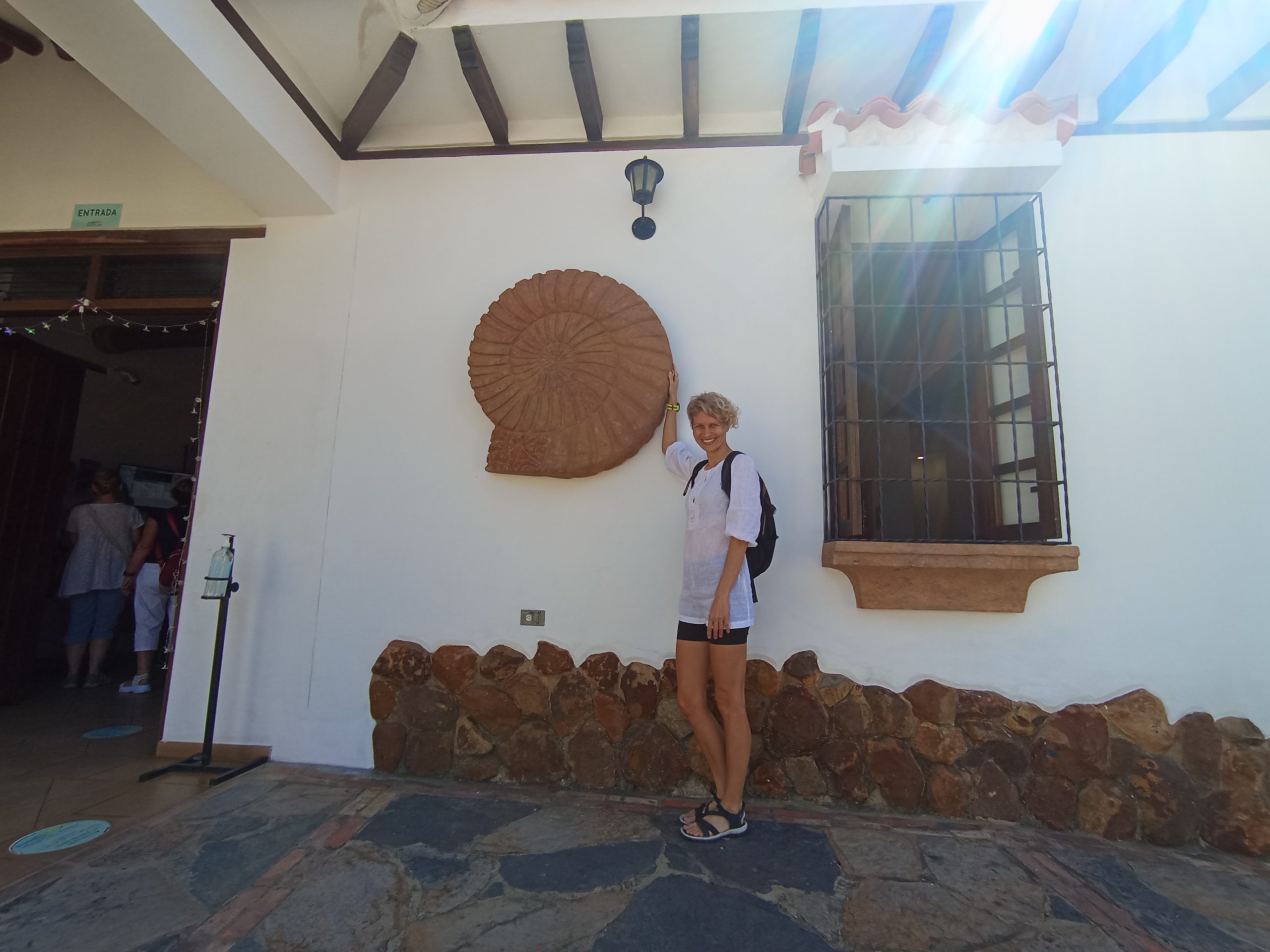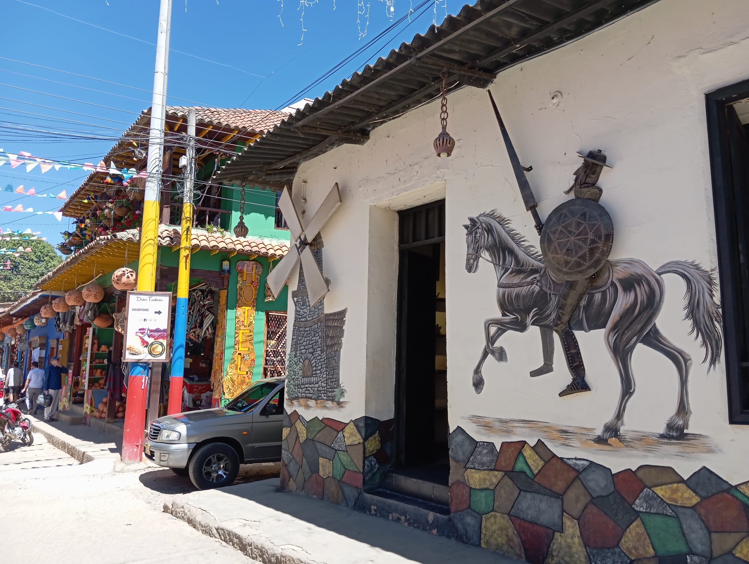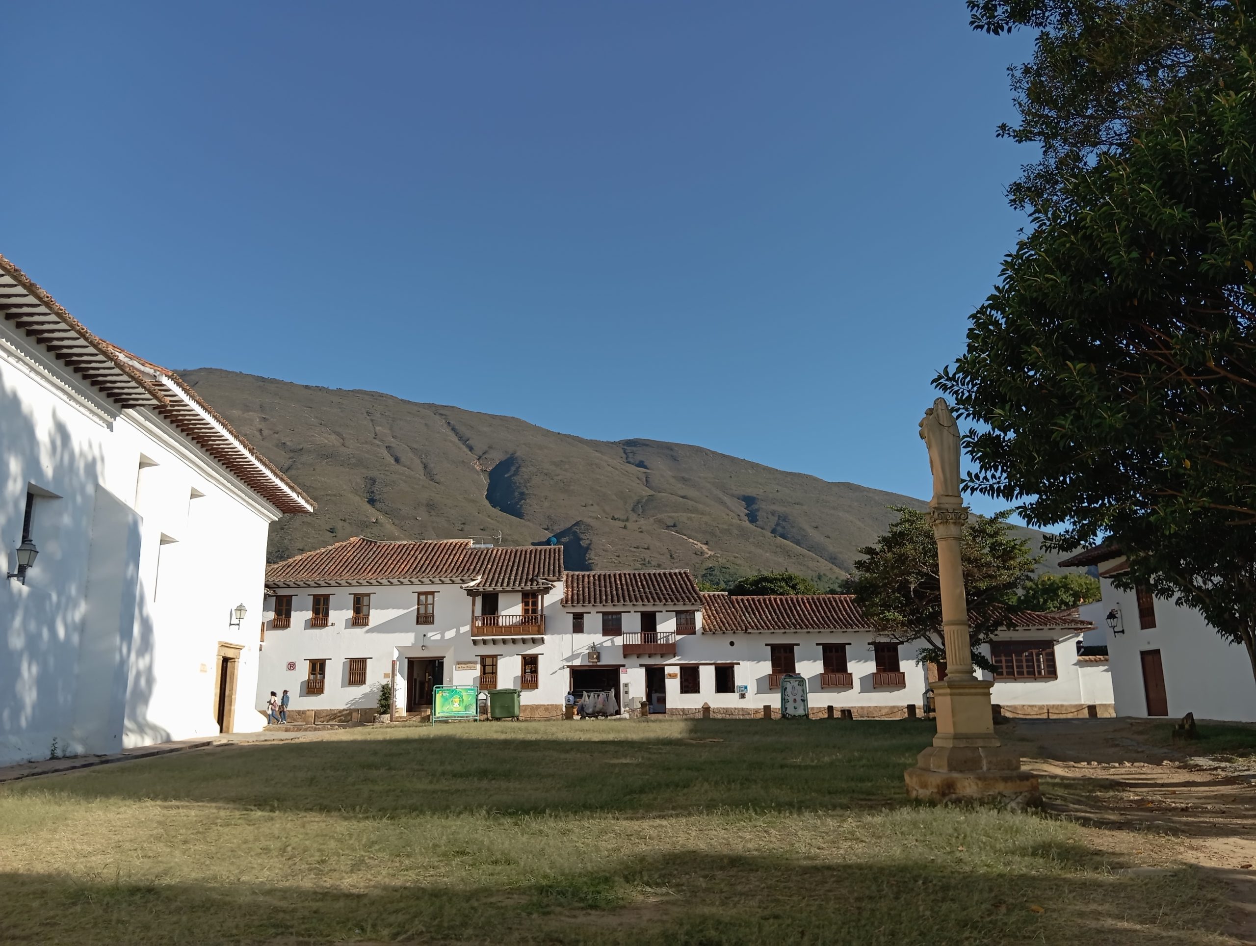 Po powrocie do naszego miasteczka Villa de Leyva poszliśmy jeszcze pochodzić po nim. Wąskie, brukowane uliczki, białe ciągi domków z charakterystycznymi starymi dachówkami. Małe sklepiki i restauracje. Sporo turystów, głównie z Kolumbii. Duży plac z kościołem. Tutaj kręcili kolumbijską wersję Zorro. Scenografię mieli w zasadzie gotową. Piękne miejsce. Zajrzeliśmy do środka klasztoru Sióstr Karmelitanek Bosych. Normalnie żyją w ciszy, bez kontaktu fizycznego z otoczeniem, bez rozmów. Ale jest tu też miejsce, gdzie można nabyć dewocjonalia lub za drobną lub większą opłatą zamówić u nich modlitwę w intencji. Wszystko odbywa się bez kontaktu. Jest taka ruchoma szafka, niczym drzwi obrotowe. My wkładamy pieniądze, a w zamian dostajemy zakupiony towar. I tylko przy tych czynnościach zakonnice mogą rozmawiać. Arek wdał się w konwersację, a ta gadała jak katarynka, chyba z 15 minut 😉