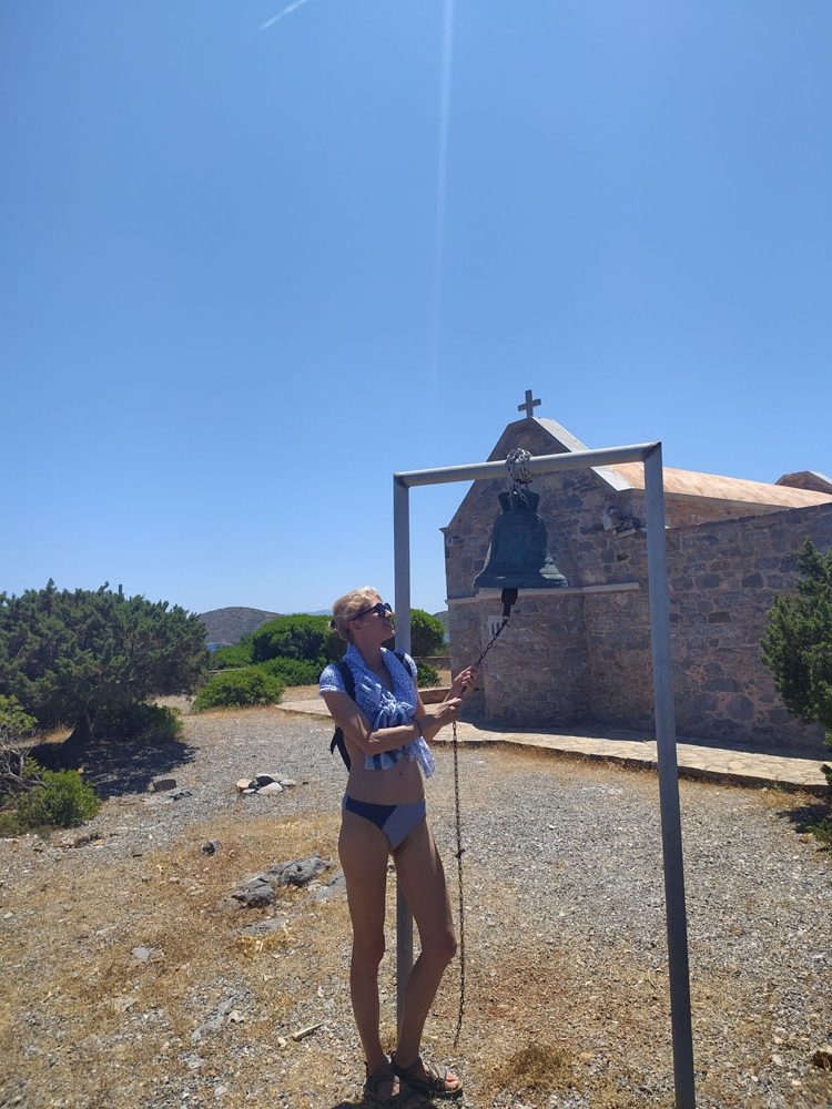 Tak więc podjechaliśmy autem na półwysep, wcześniej mijając na grobli stare wiatraki i stawy solankowe. Do zatoczki trzeba było zejść kilkaset metrów. Widoki przepiękne, kolor wody boski. Plaża, to dużo powiedziane. Na dole czekał na nas wąski pasek piasku i kamieni, oddzielony murkiem od sadu oliwnego. Kilka oliwek rosnących blisko murka rzucało cień, który każdy z plażowiczów skrzętnie wykorzystywał. Nam udało się wbić w miejsce pary, która właśnie opuszczała zatoczkę. Woda była fantastyczna. Później poszłam na koniec półwyspu, gdzie stał mały kościółek. Około 13 zrozumieliśmy przed czym ostrzegał nas George. Do zatoki wpłynęły 3 większe statki wycieczkowe. Przycumowały przy skalistym brzegu i na ląd zeszło kilkadziesiąt osób z każdego z nich. Jak mrówki zaczęli się kierować w naszą stronę. Pracownicy statków z kolei rozpalili na brzegu wielkie grille i zaczęli szykować dla nich lunch. Szybko się stamtąd zwinęliśmy, ciesząc się, że podróżujemy sami bez tłumu współtowarzyszy…