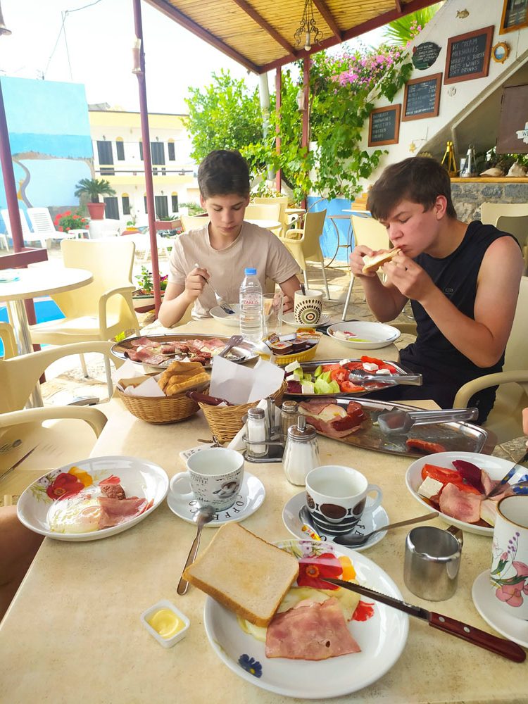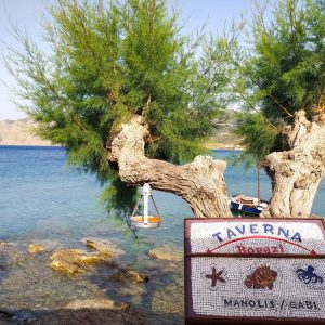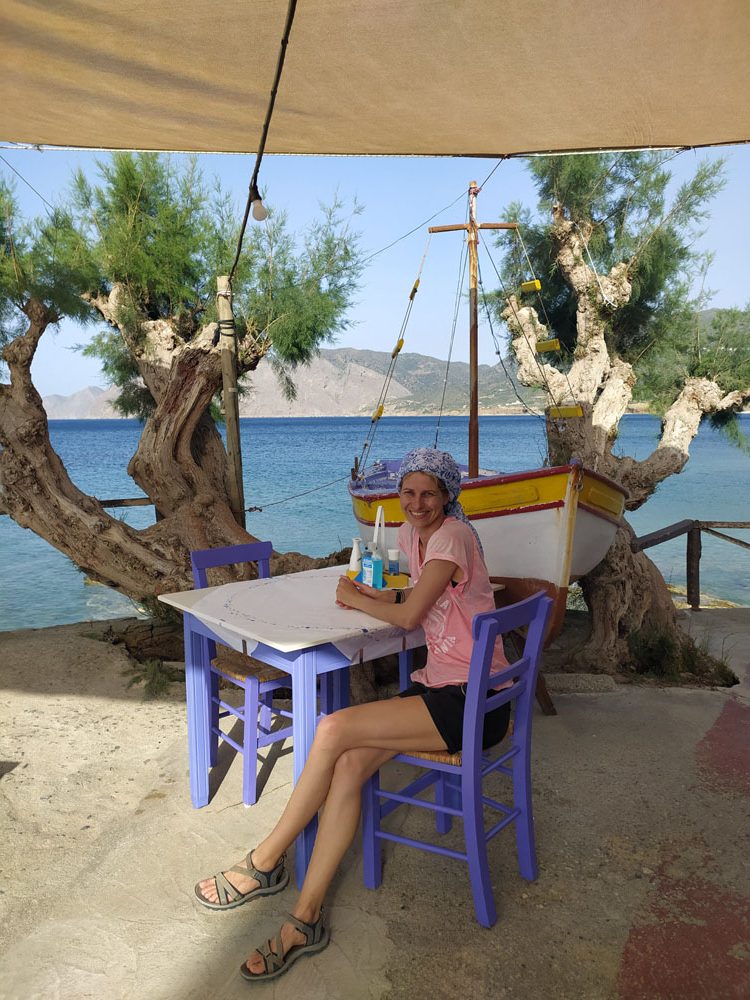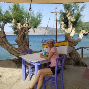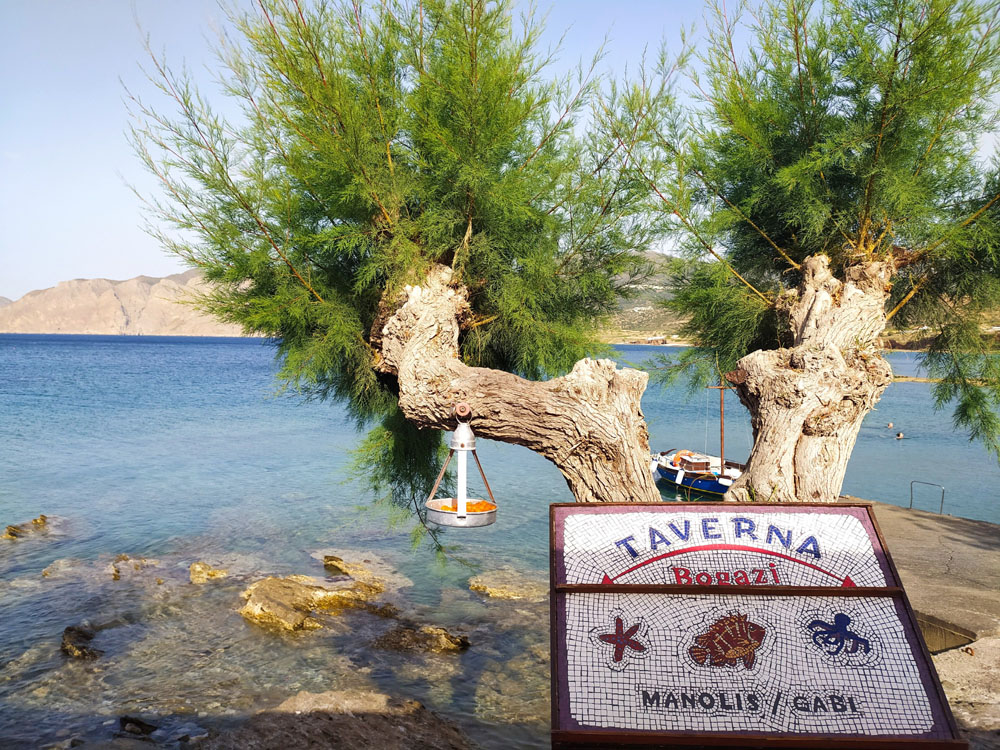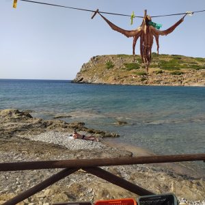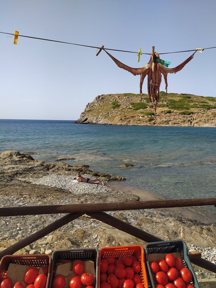 W nadbrzeżnej tawernie zjedliśmy pyszne owoce morza, tradycyjnie przyrządzone. Chłopaki zaliczyli kąpiel, my poleżeliśmy na kamienistej plaży. Późnym wieczorem wróciliśmy do naszej bazy. Jadąc drogą wzdłuż wybrzeża trzeba uważać na kozy, które wyszły na wieczorny żer. Jesteśmy na wschodniej części wyspy, więc odpadają nam zachody słońca – to chowa się tu za górami.