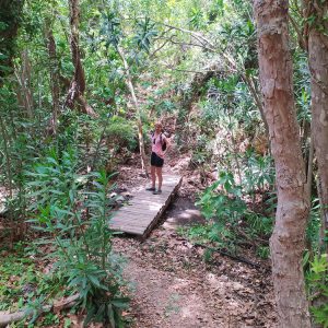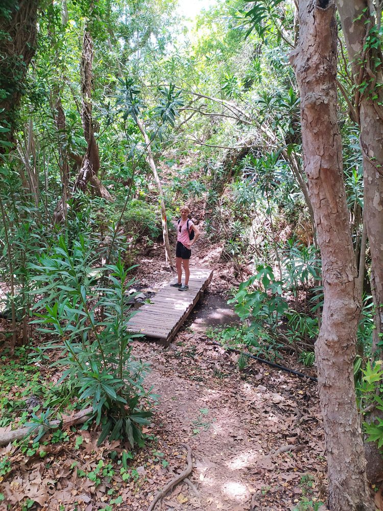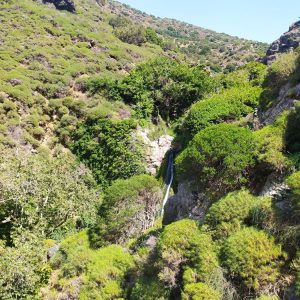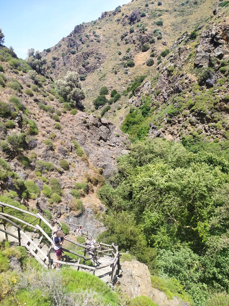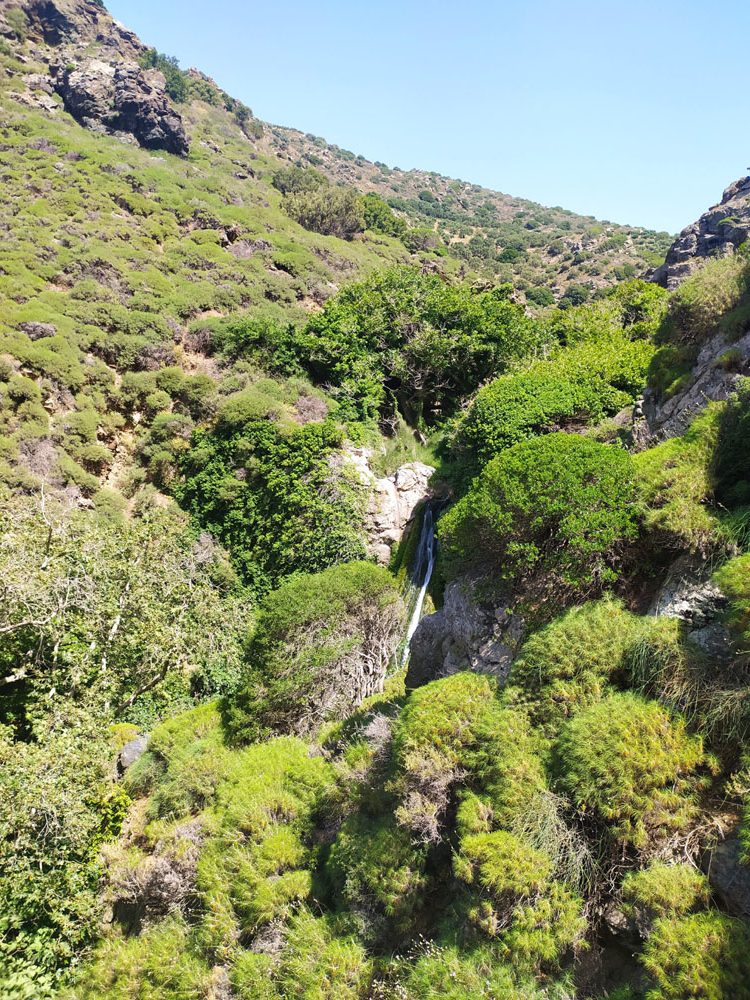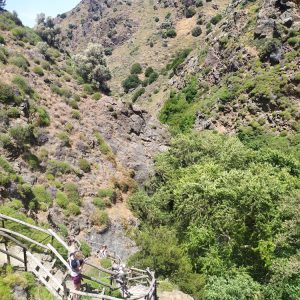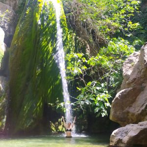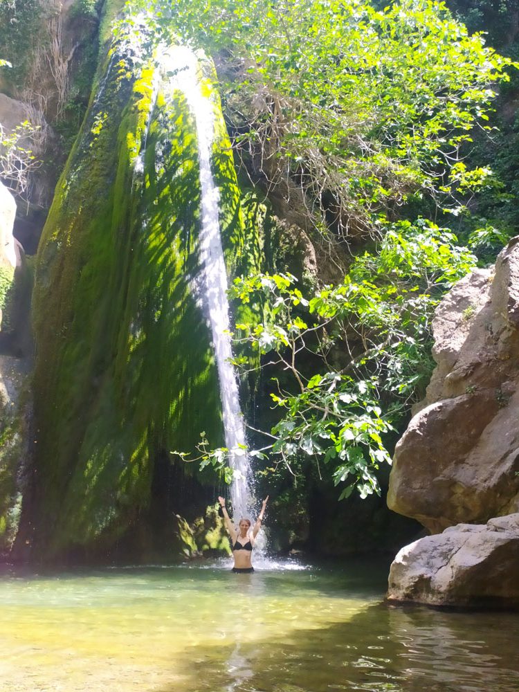 Po około kilometrze była budka, gdzie płaciło się za wstęp do kanionu. Przeszliśmy pod kamiennym mostkiem i dalej szlak zrobił się ciekawszy. Droga wiła się między bujną roślinnością. Momentami trzeba było się wspinać po kamieniach. Chłopacy wyrwali do przodu. Po około godzinie niespiesznego marszu wyszliśmy na bardziej otwartą przestrzeń. W dół wąwozu prowadziły strome, drewniane schody. Na dole czekała nagroda za marsz – wodospad. Woda była fantastyczna, orzeźwiająca, wskakiwaliśmy do niej kilka razy, by schłodzić się przed powrotem. Chłopacy doszli w międzyczasie do końca wąwozu, do morza, przeszli obok wodospadu i go nie zauważyli 😉