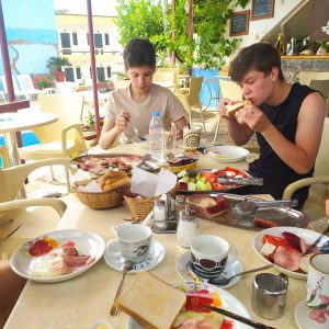 Nasz gospodarz George był bardzo dumny z przygotowanego śniadania. Każdego zapytał o to, w którym kubku ma mu podać poranną kawę. Potem smażył jajka, robił tosty, sałatkę. Trwało to bardzo długo, ale to dobra lekcja, by odpuścić pośpiech i wyluzować. Śniadanie typowo brytyjskie, więc niezbyt lekkie 😉 a na deser jogurt z miodem i owocami. Trudno będzie tu nie przytyć…
